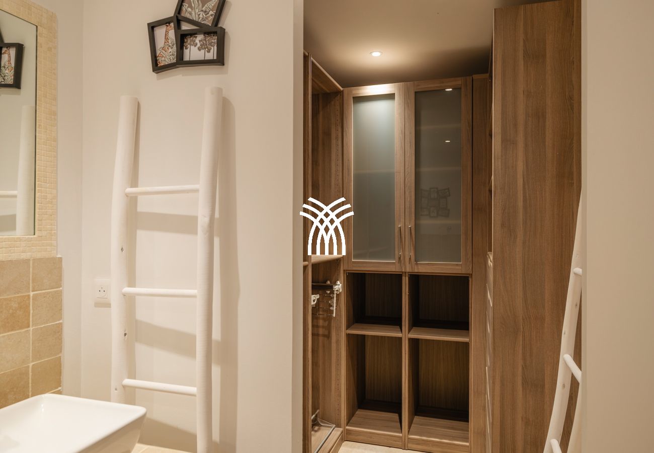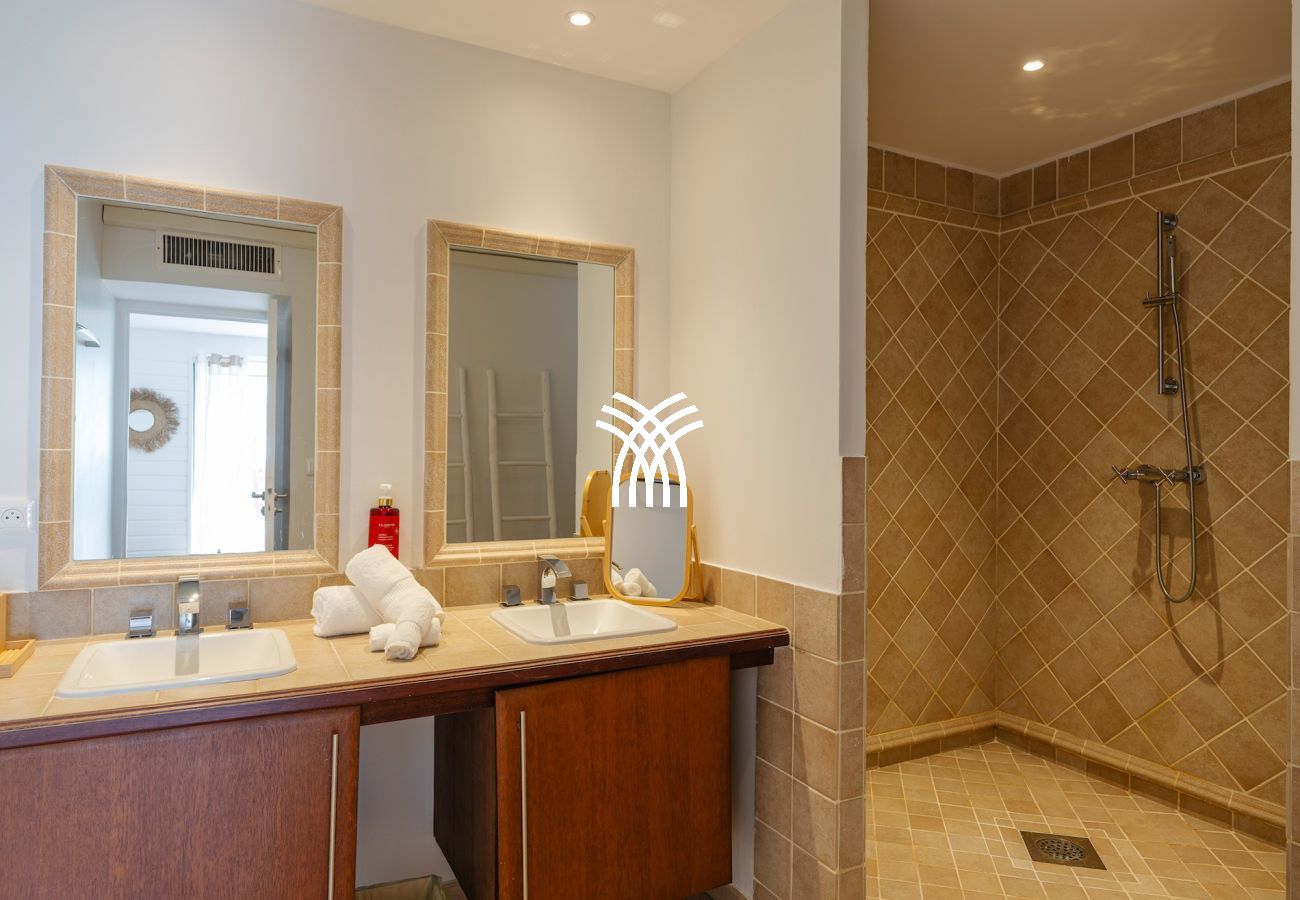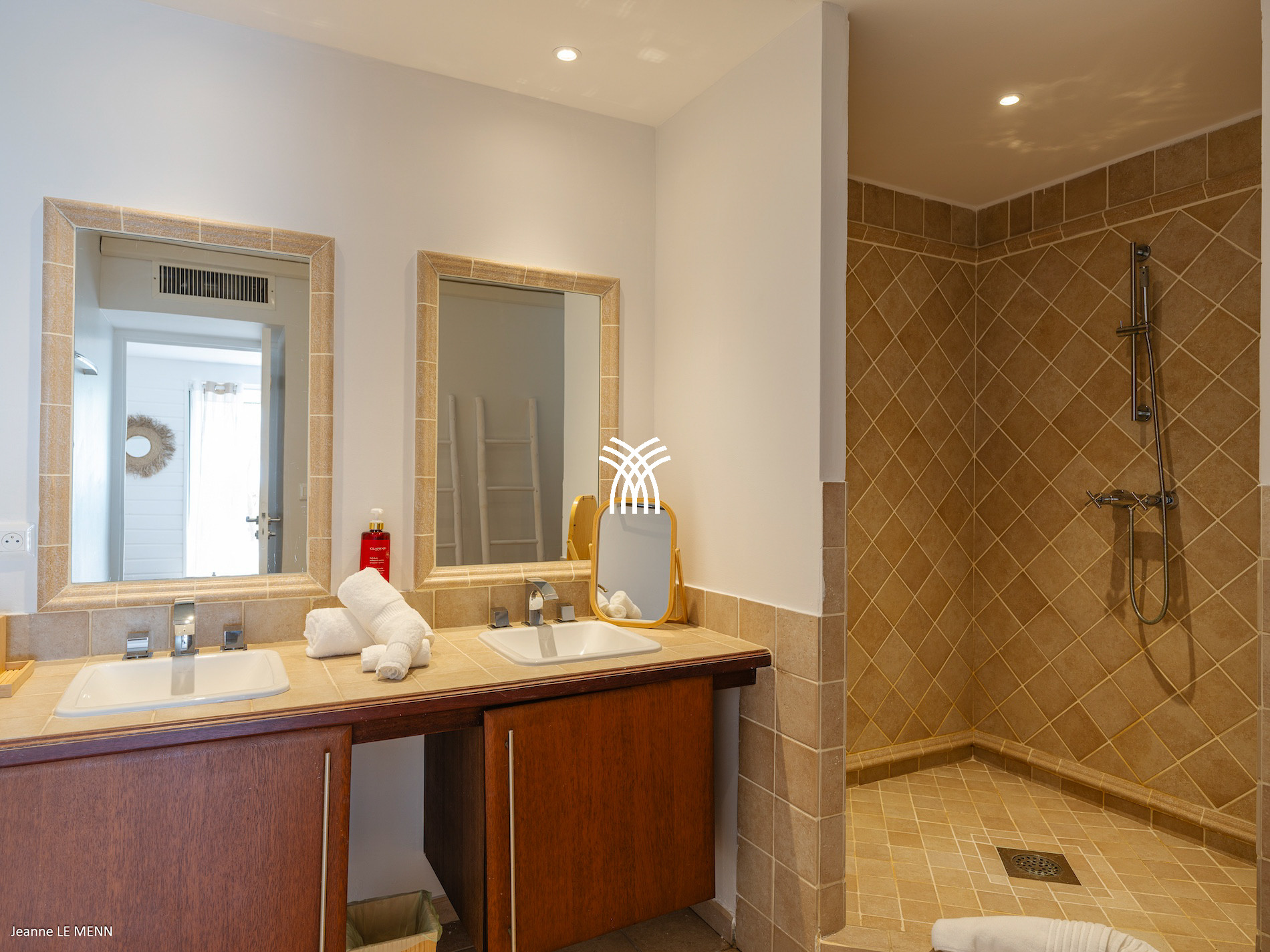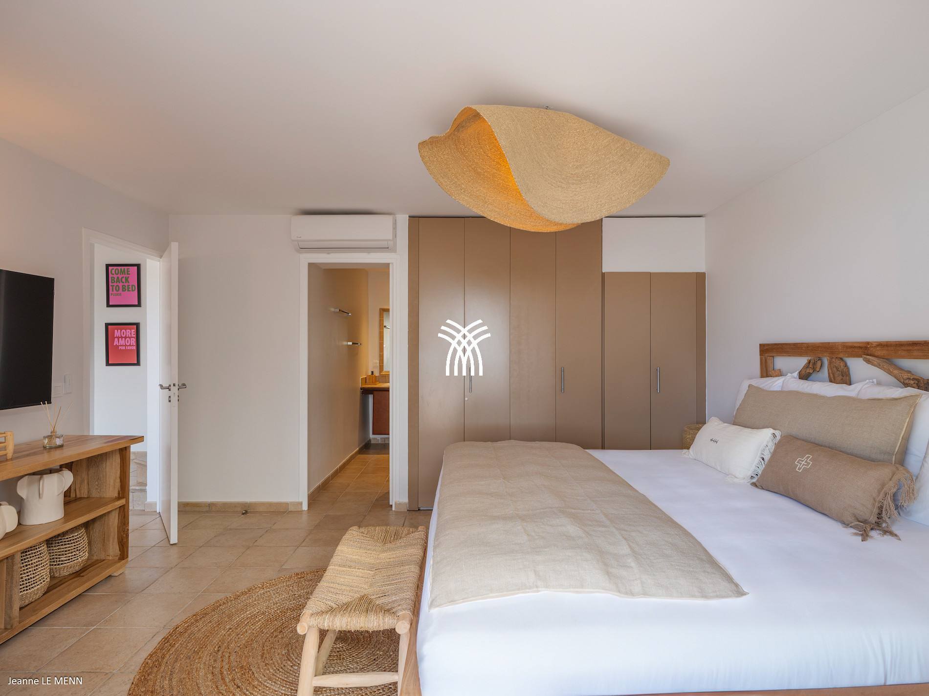Au niveau inférieur, deux autres chambres, décorées avec raffinement, donnent directement sur la piscine privée de la villa. Cet espace intimiste est idéal pour se relaxer au bord de l’eau, admirer les paysages environnants ou se rafraîchir à tout moment de la journée. Chaque chambre dispose de sa propre salle de bain privative pour garantir confort et intimité à tous les invités.