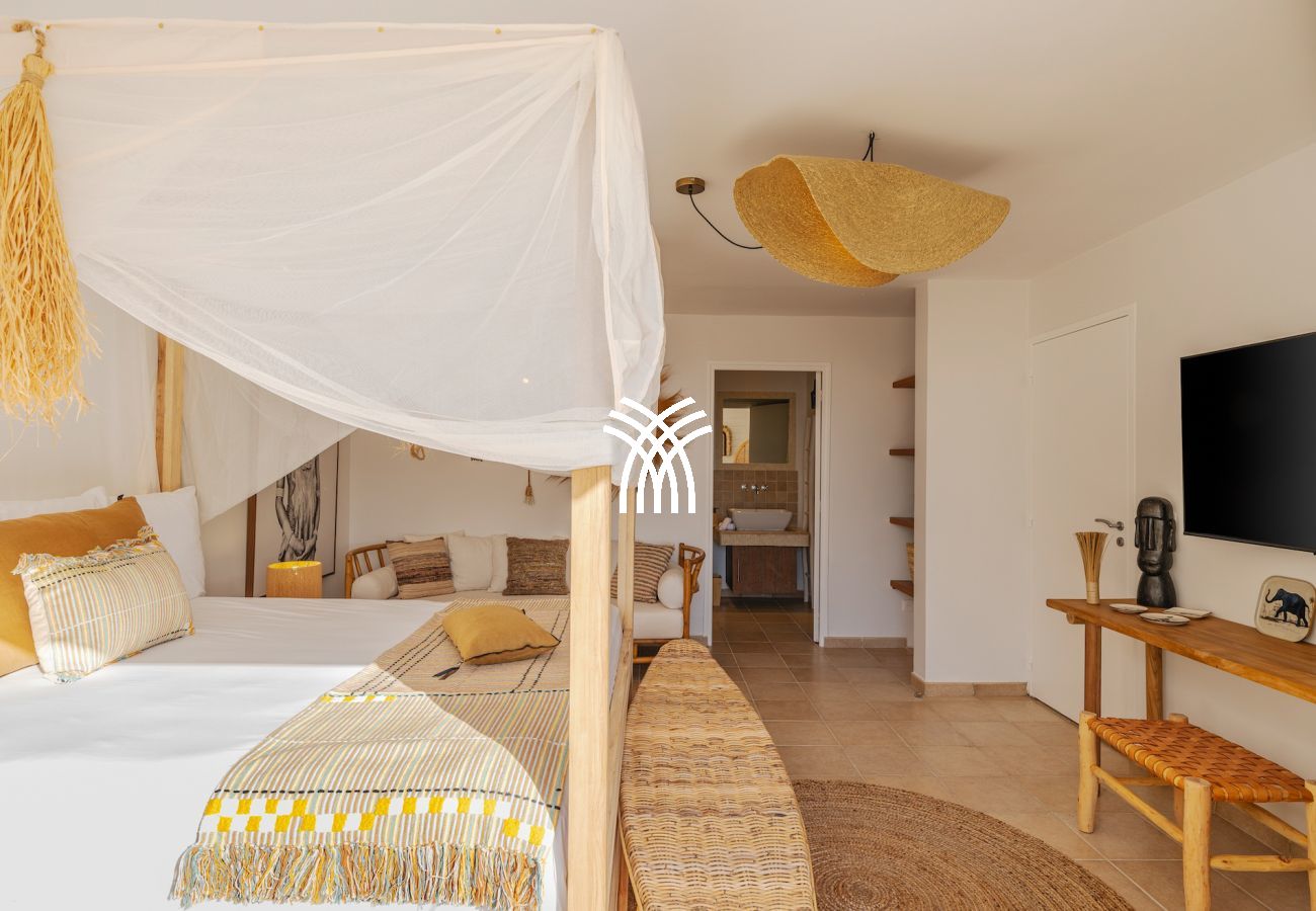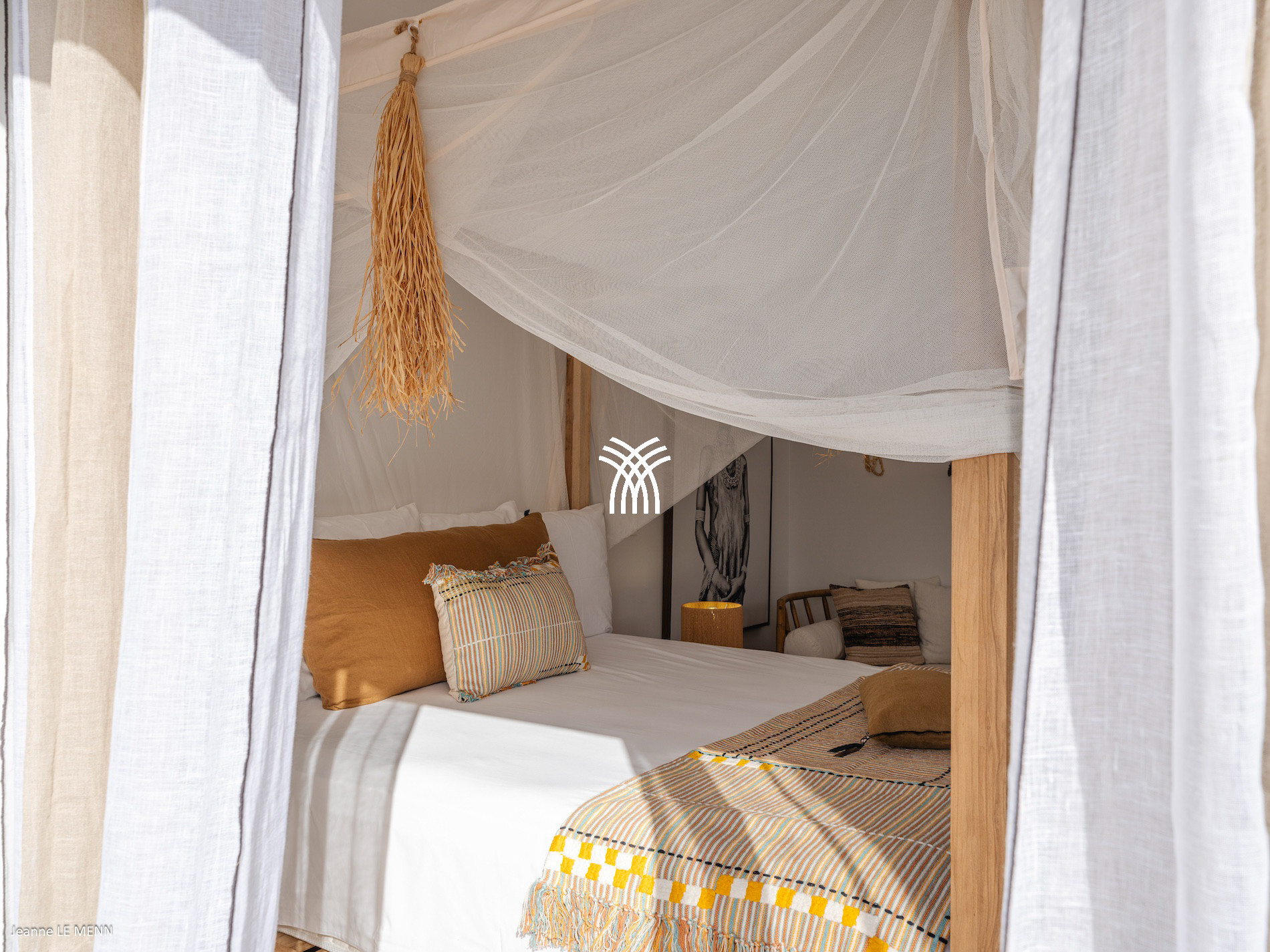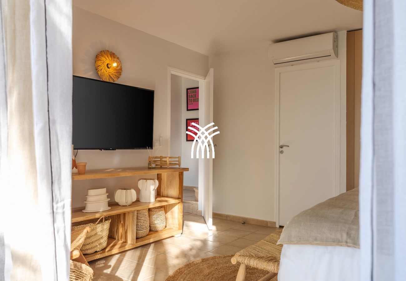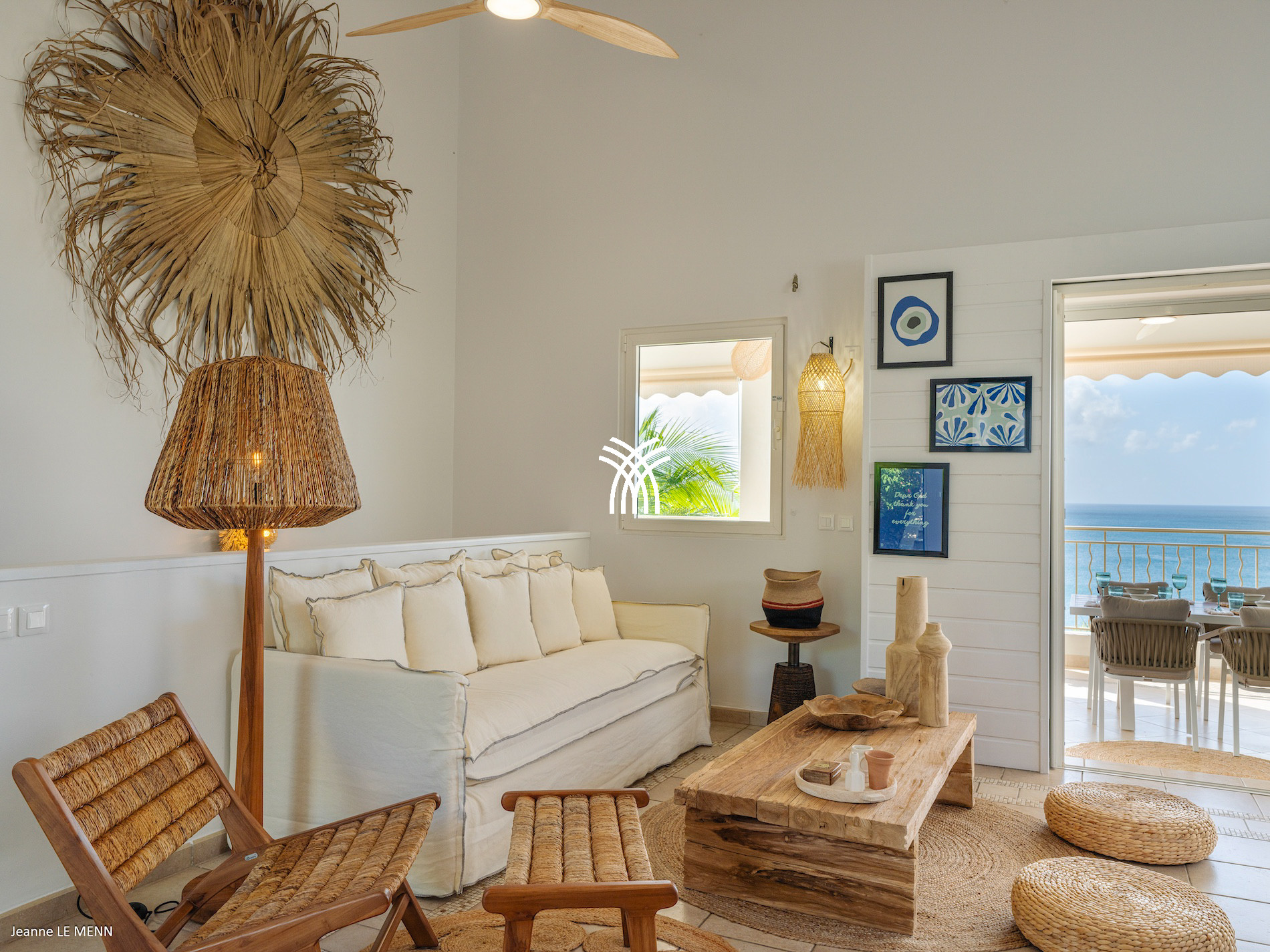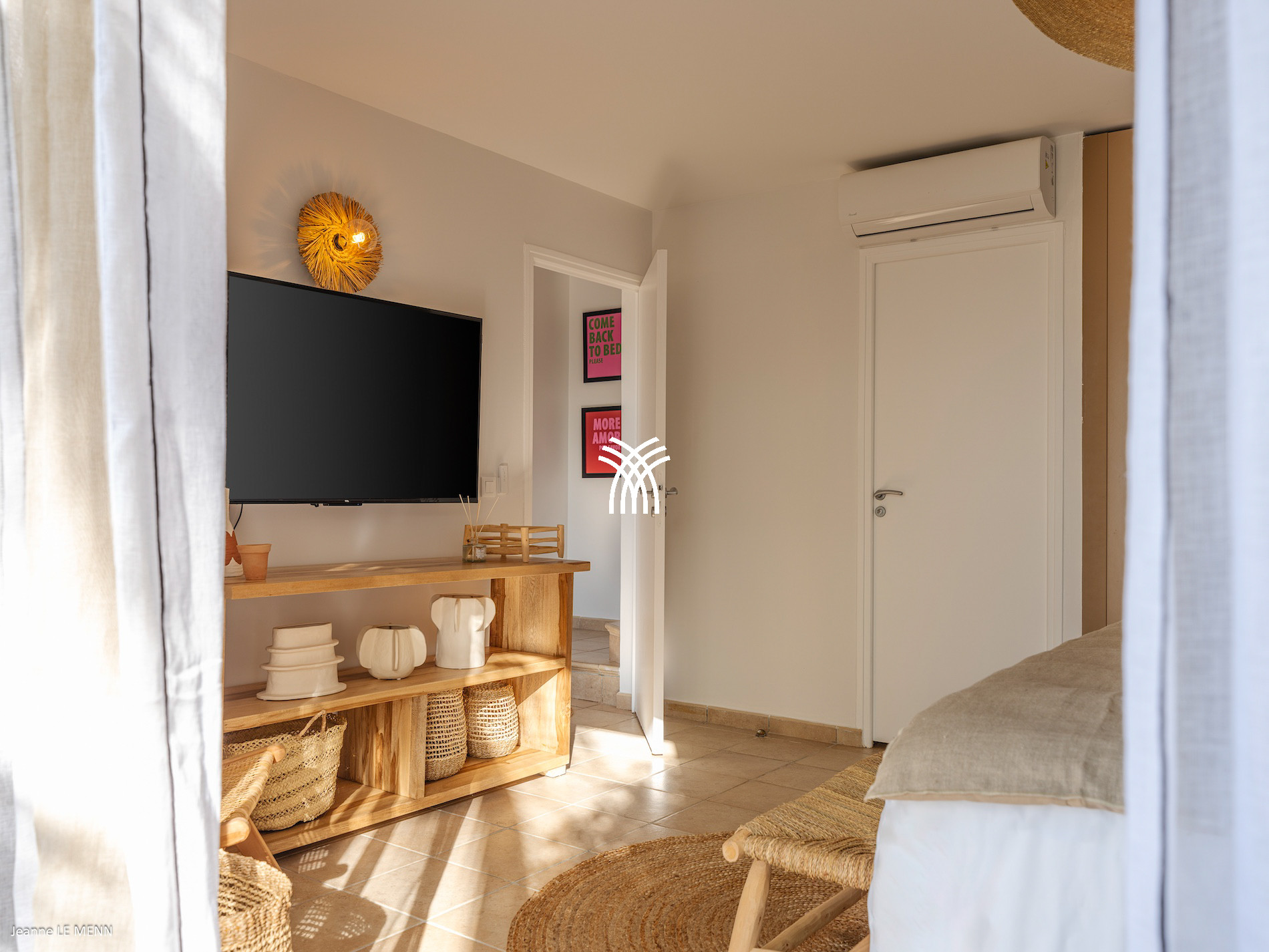 Au niveau principal, un vaste salon et une grande terrasse permettent de profiter pleinement des couchers de soleil et de la vue sur la mer. Une première chambre élégante, située à ce même niveau, assure un accès pratique et un confort optimal.