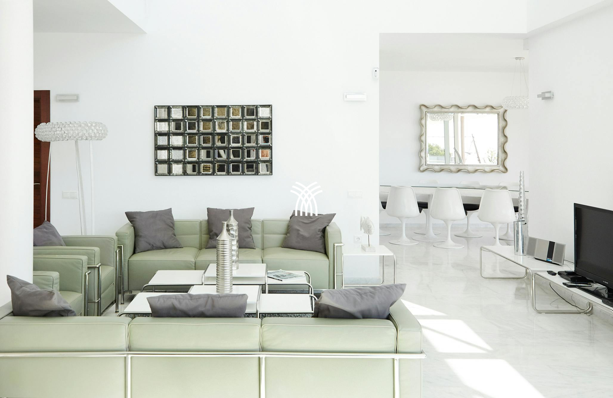 Conçue pour ceux qui apprécient la beauté, le confort et la tranquillité, cette villa élégante offre une disposition ouverte spacieuse avec une cuisine moderne entièrement équipée, comprenant un îlot élégant de 4 mètres et une salle à manger pour dix personnes. L'ample espace de vie s'étend harmonieusement à travers des portes coulissantes vitrées vers les terrasses ensoleillées et la terrasse de la piscine, offrant une vue imprenable et ininterrompue sur la mer Méditerranée.