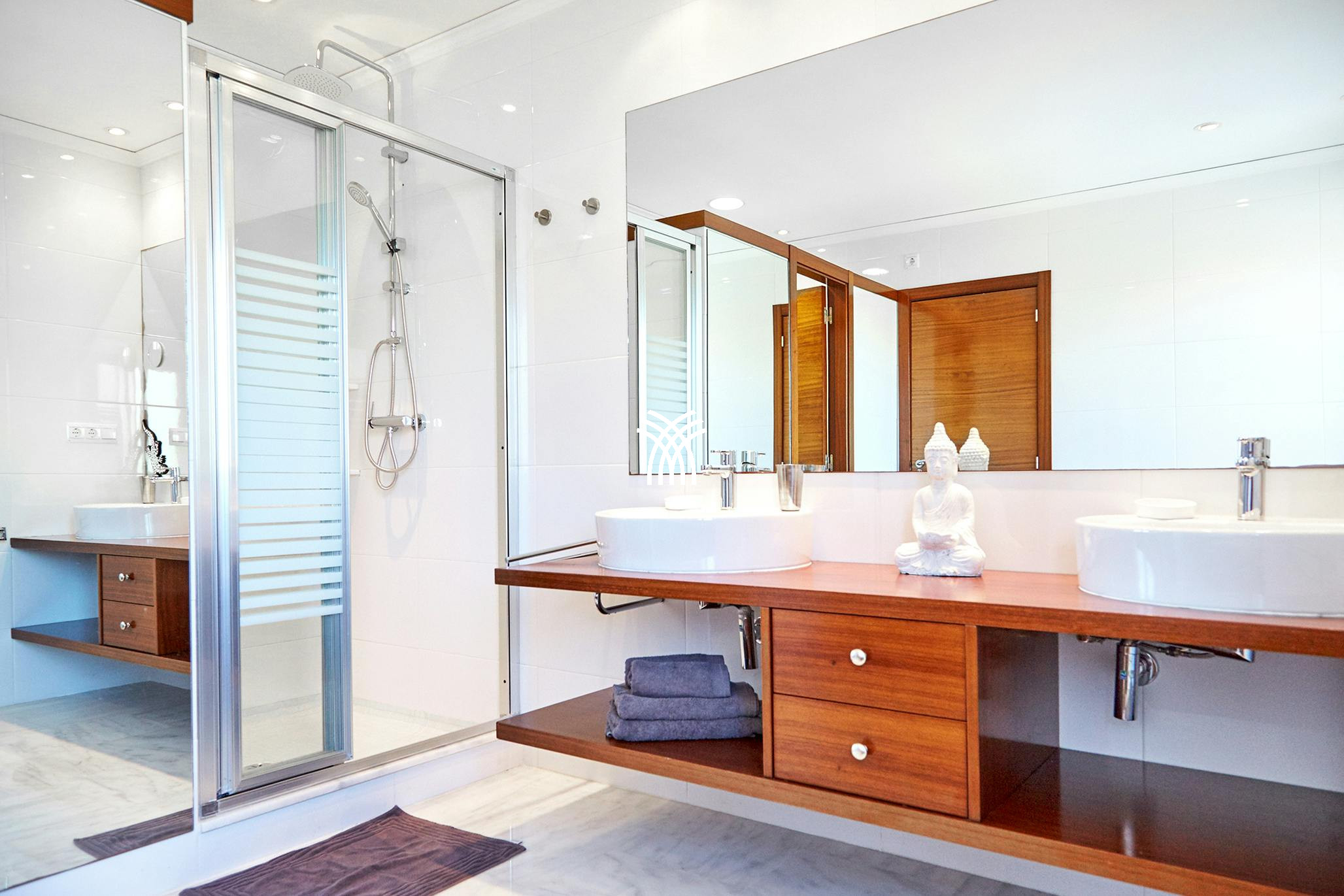 À l'étage, un atrium unique au sol vitré avec des sièges s'ouvre sur une terrasse supérieure sereine avec des transats, un endroit parfait pour savourer la vue et embrasser le calme de votre environnement. La disposition polyvalente de la villa comprend un appartement indépendant avec une petite cuisine, un salon, un lit double convertible et une salle de bain élégante, offrant de l'intimité pour les invités ou le personnel. Trois chambres doubles, chacune avec une salle de bain élégante, peuvent être aménagées en lits jumeaux, tandis que la suite principale spacieuse dispose d'une baignoire jacuzzi et d'une douche de salle de bain luxueuse.