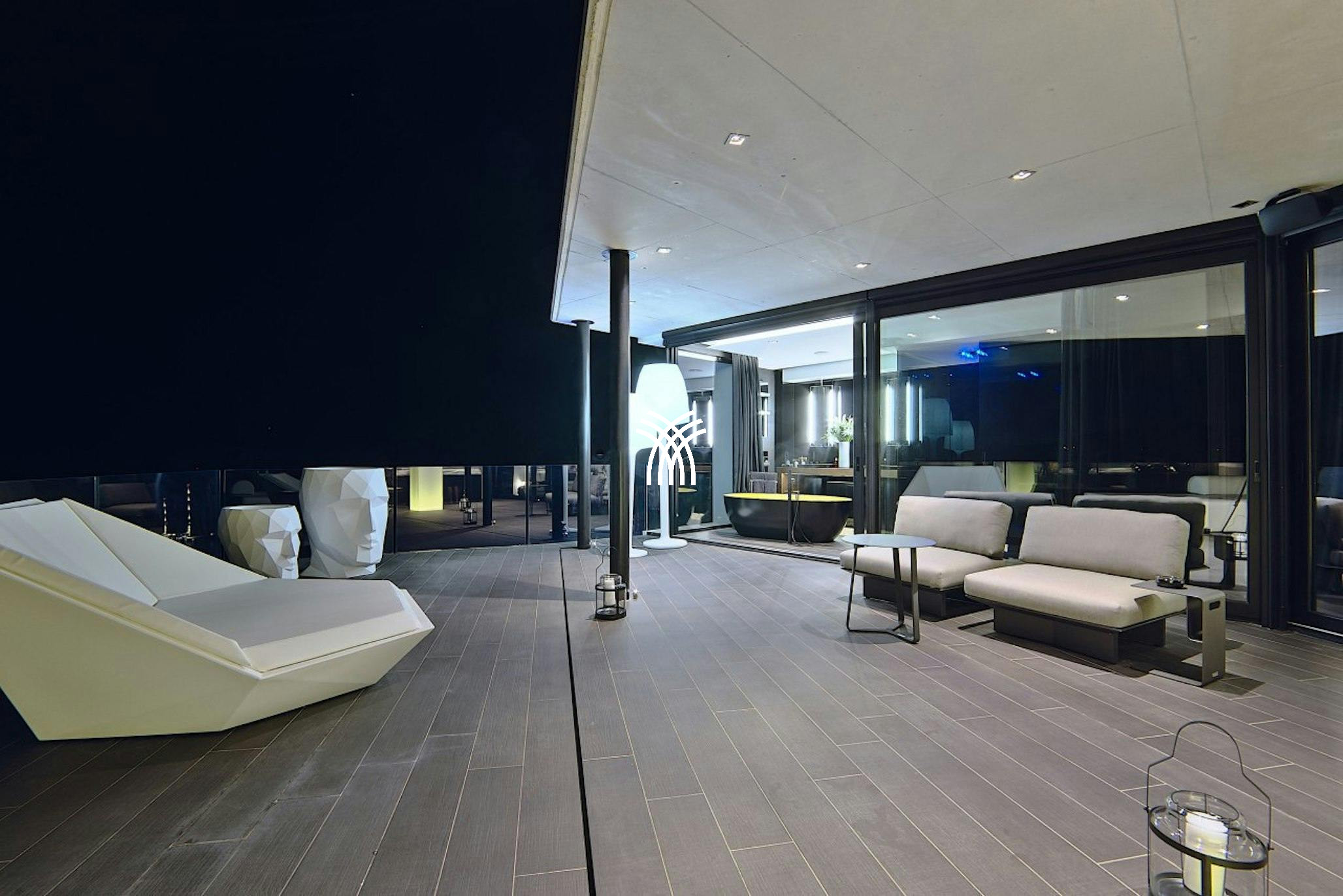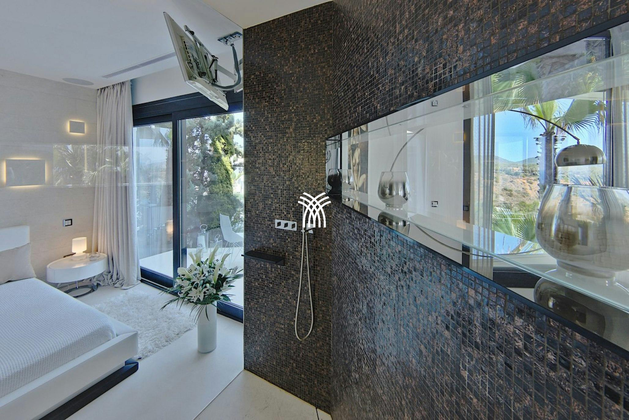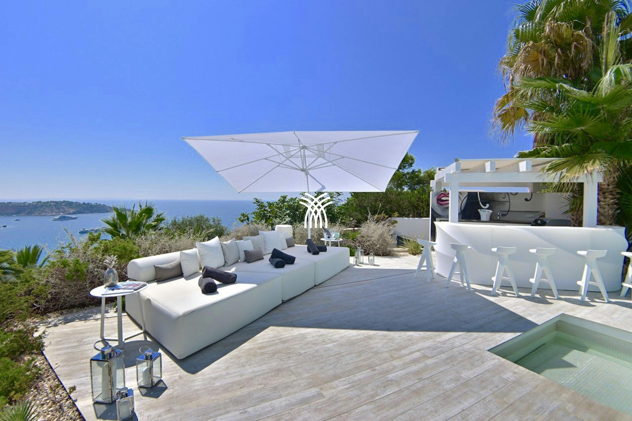 Perché au-dessus de la mer, les jardins en terrasses de la villa et ses espaces de vie extérieurs spacieux sont conçus pour capturer l'essence du luxe décontracté d'Ibiza. Un espace de repas ombragé pour dix personnes surplombe l'horizon, tandis que la piscine à débordement chauffée se fond harmonieusement dans le paysage, bordée d'un mur de verre et menant à une terrasse solarium inférieure avec un bar al-fresco élégant. Cet espace de bar animé comprend un barbecue, une table pour six personnes et un système sonore Sonos—parfait pour divertir sous le soleil ou les étoiles.