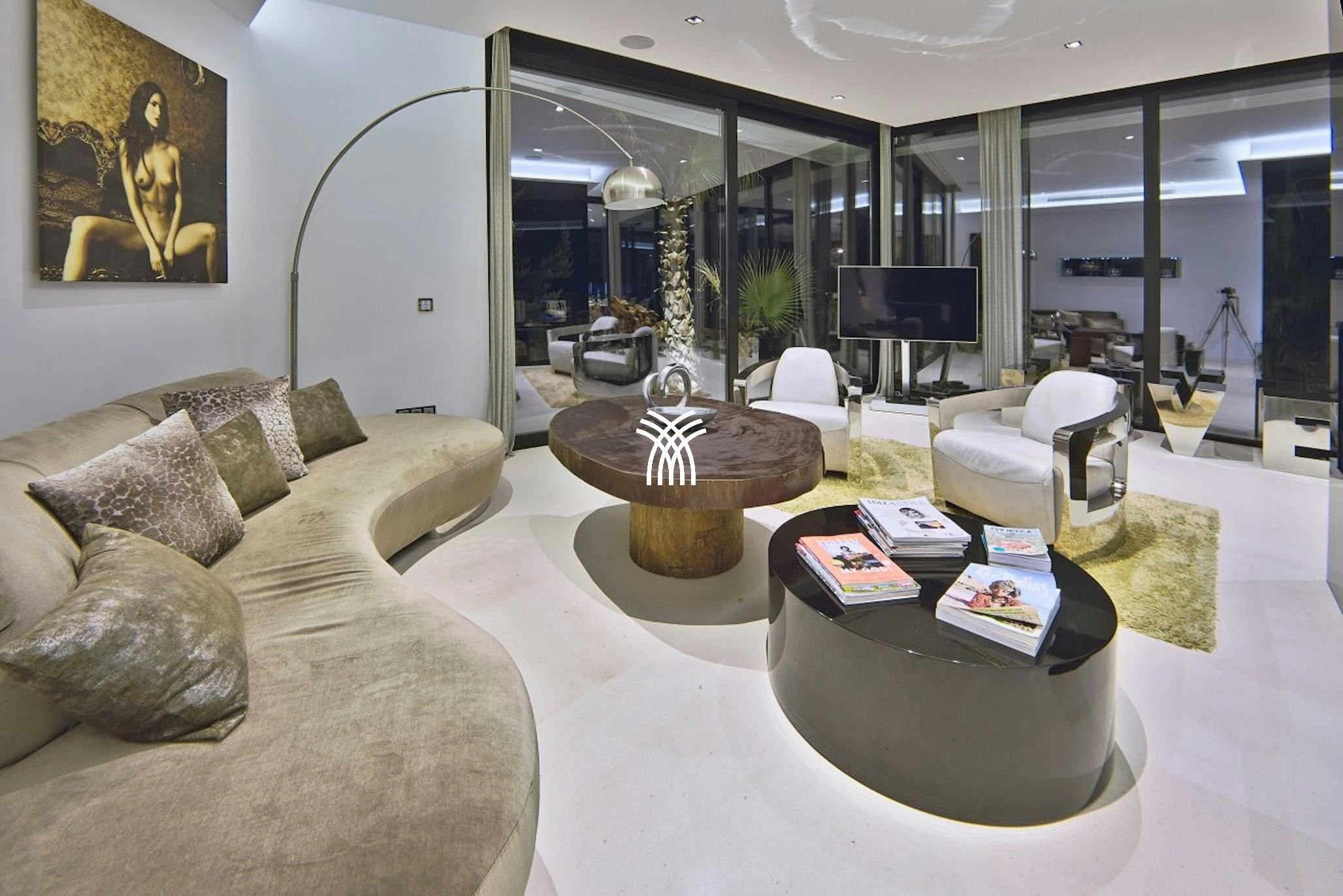 À l'intérieur, l'agencement ouvert présente une cuisine moderne et élégante, un salon spacieux avec système audio intégré, télévision par satellite, cheminée et une zone de repas avec un espace pour dix personnes. Les portes vitrées s'ouvrent directement sur la zone de la piscine, créant une connexion parfaite entre les espaces intérieurs et extérieurs.