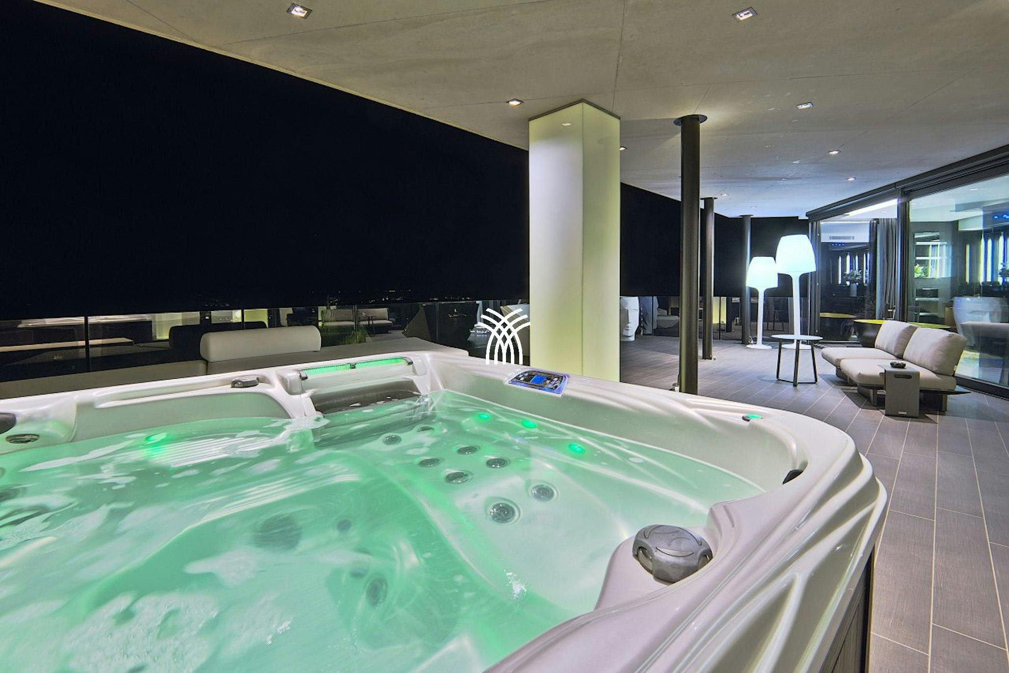 À l'étage, la suite principale est un sanctuaire privé, comprenant un lit king-size, une baignoire autoportante luxueuse et une terrasse spacieuse dotée d'un bain à remous pour profiter du coucher de soleil. Deux chambres doubles supplémentaires offrent des salles de bains attenantes avec des douches à effet pluie, combinant confort et élégance pour chaque invité.