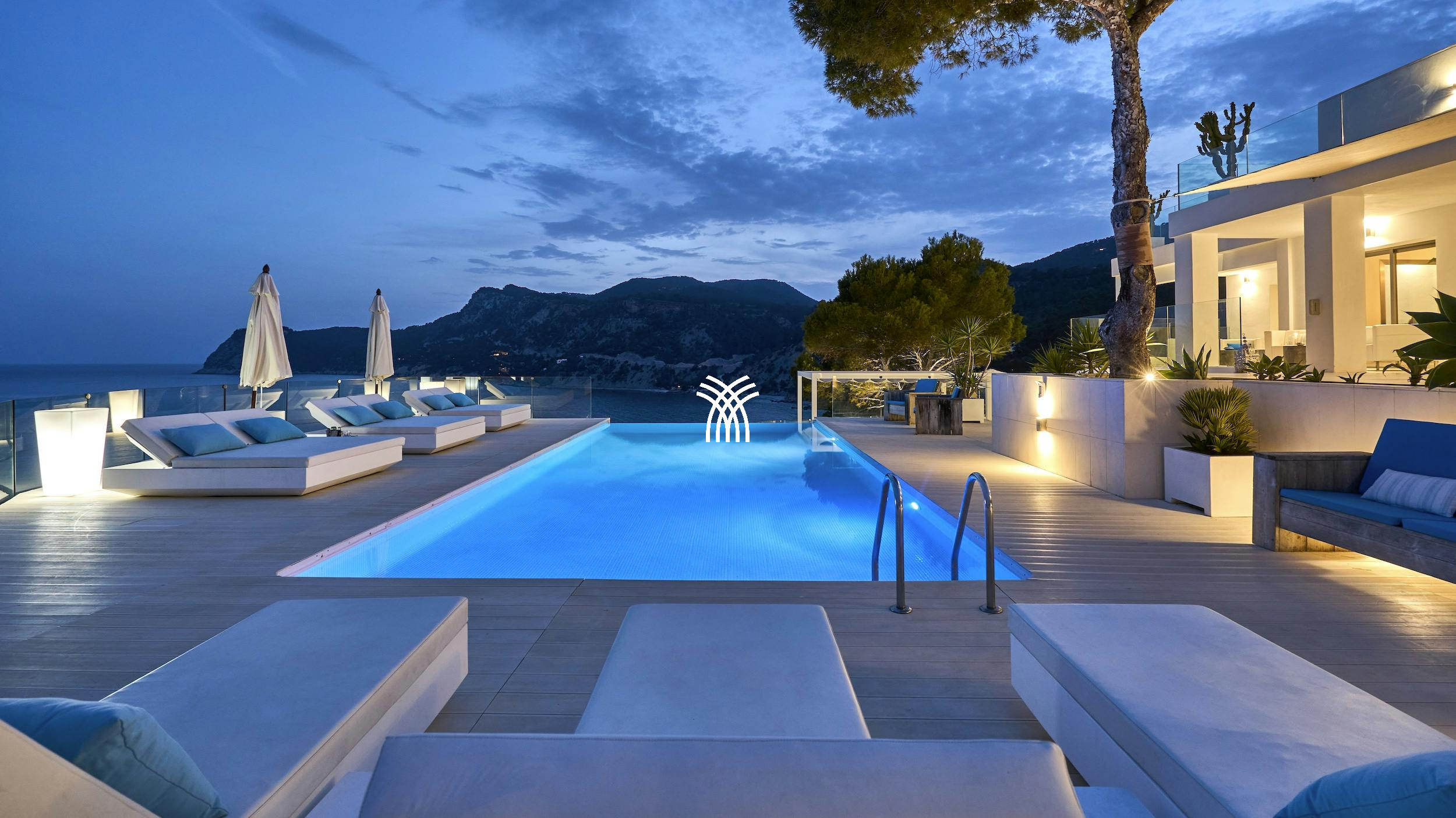 Le point focal de cette échappée magnifique à Ibiza est la piscine à débordement spectaculaire, où l'eau semble se fondre parfaitement avec la mer ouverte. Une terrasse blanche immaculée entoure la piscine, proposant des transats, un espace bar et des sièges détendus pour se prélasser pendant la journée ou déguster des cocktails sous les étoiles le soir. Un espace de repas ombragé par une voile, pouvant accueillir douze personnes, invite à de longs repas décontractés en famille ou entre amis, avec une vue sur la cime des arbres et l'horizon scintillant.