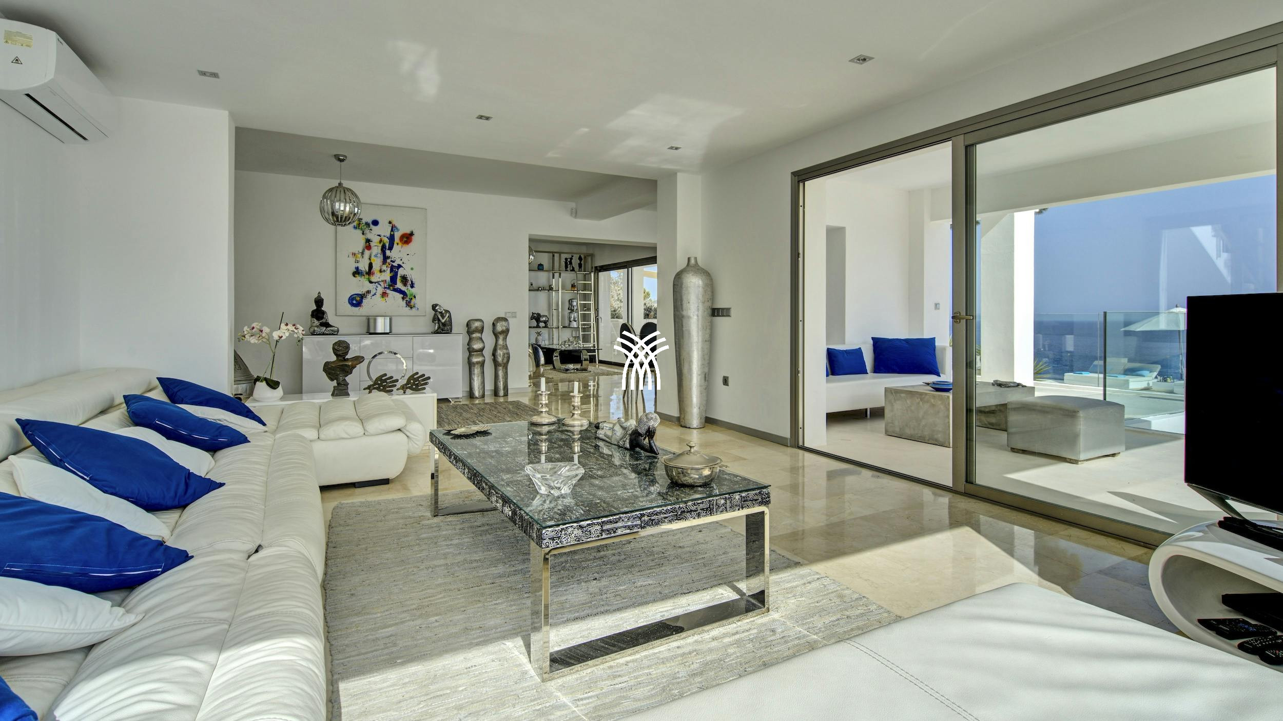 À l'intérieur, des fenêtres du sol au plafond encadrent les vues sur la mer sous tous les angles. Les espaces de vie et de salle à manger ouverts présentent des sièges en cuir blanc luxueux, des finitions élégantes et des éléments de design moderne qui complètent l'environnement naturel de la villa. La cuisine contemporaine est entièrement équipée pour des expériences culinaires décontractées et gastronomiques.