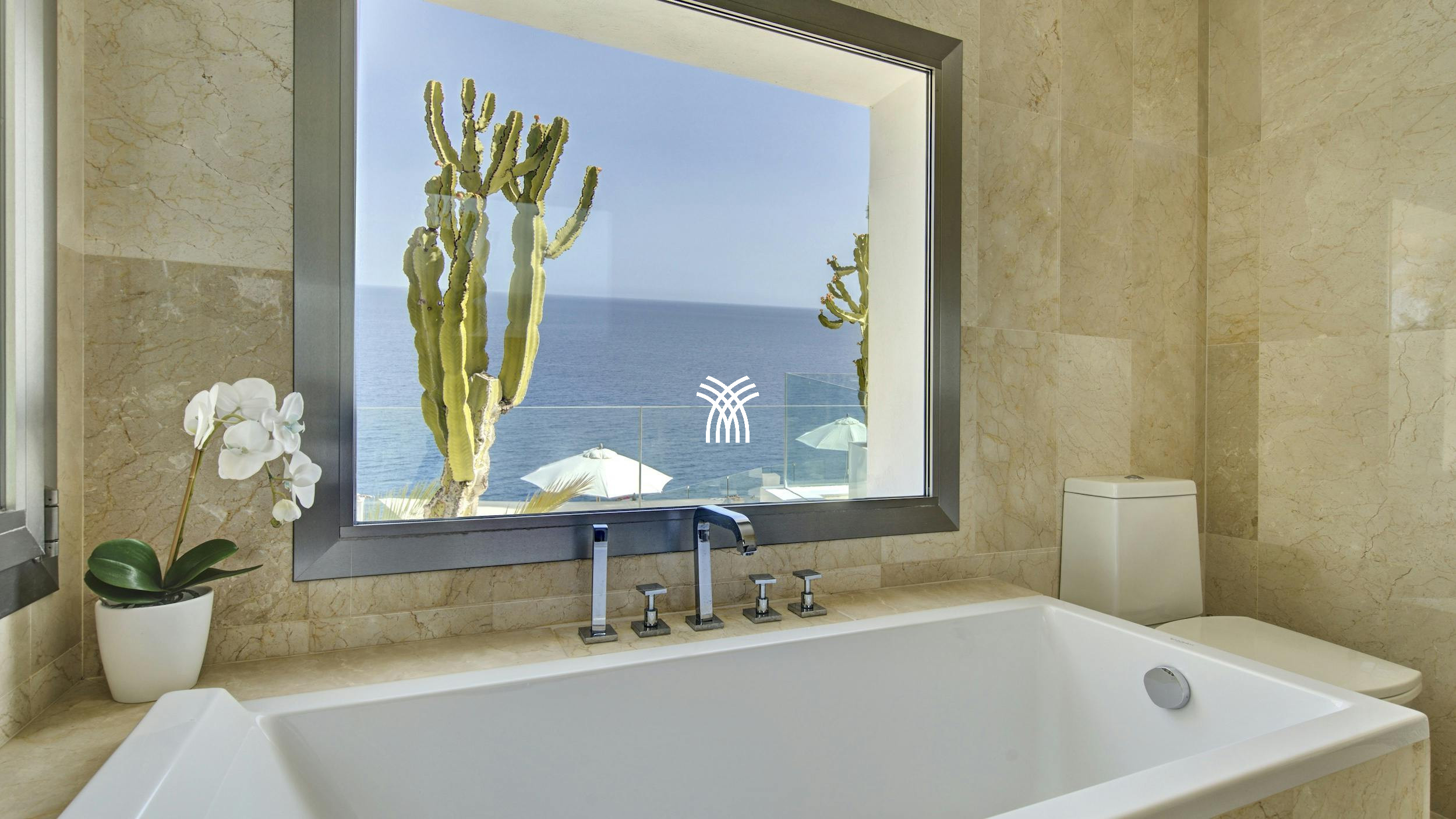 Chacune des chambres spacieuses a été soigneusement conçue dans des tons neutres doux avec des touches de couleur vibrantes, offrant toutes des vues mer spectaculaires et un accès direct à la terrasse. Des salles de bains élégantes avec salle de bain attenante, réalisées en pierre naturelle, offrent un confort de type spa dans un environnement paisible et baigné de lumière.