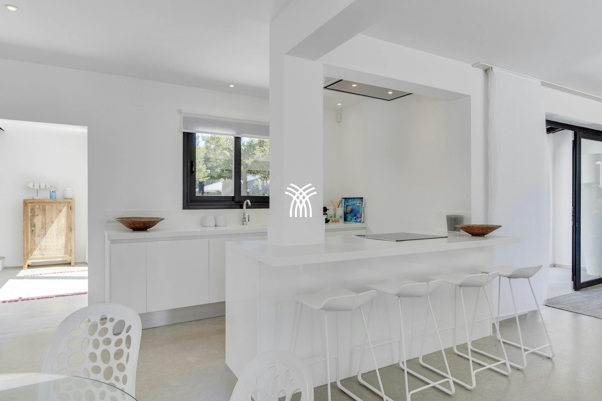 Avec une connexion parfaite entre les espaces intérieurs et extérieurs, l'intérieur lumineux de la villa est inondé de lumière naturelle. Des murs blanchis à la chaux et des sols en béton poli créent une esthétique épurée et minimaliste, tandis que des touches de couleur et des meubles moelleux apportent chaleur et caractère à chaque pièce. Le salon à aire ouverte se prolonge sans effort dans une cuisine moderne équipée d'appareils haut de gamme et d'un bar petit-déjeuner douillet donnant sur le jardin.