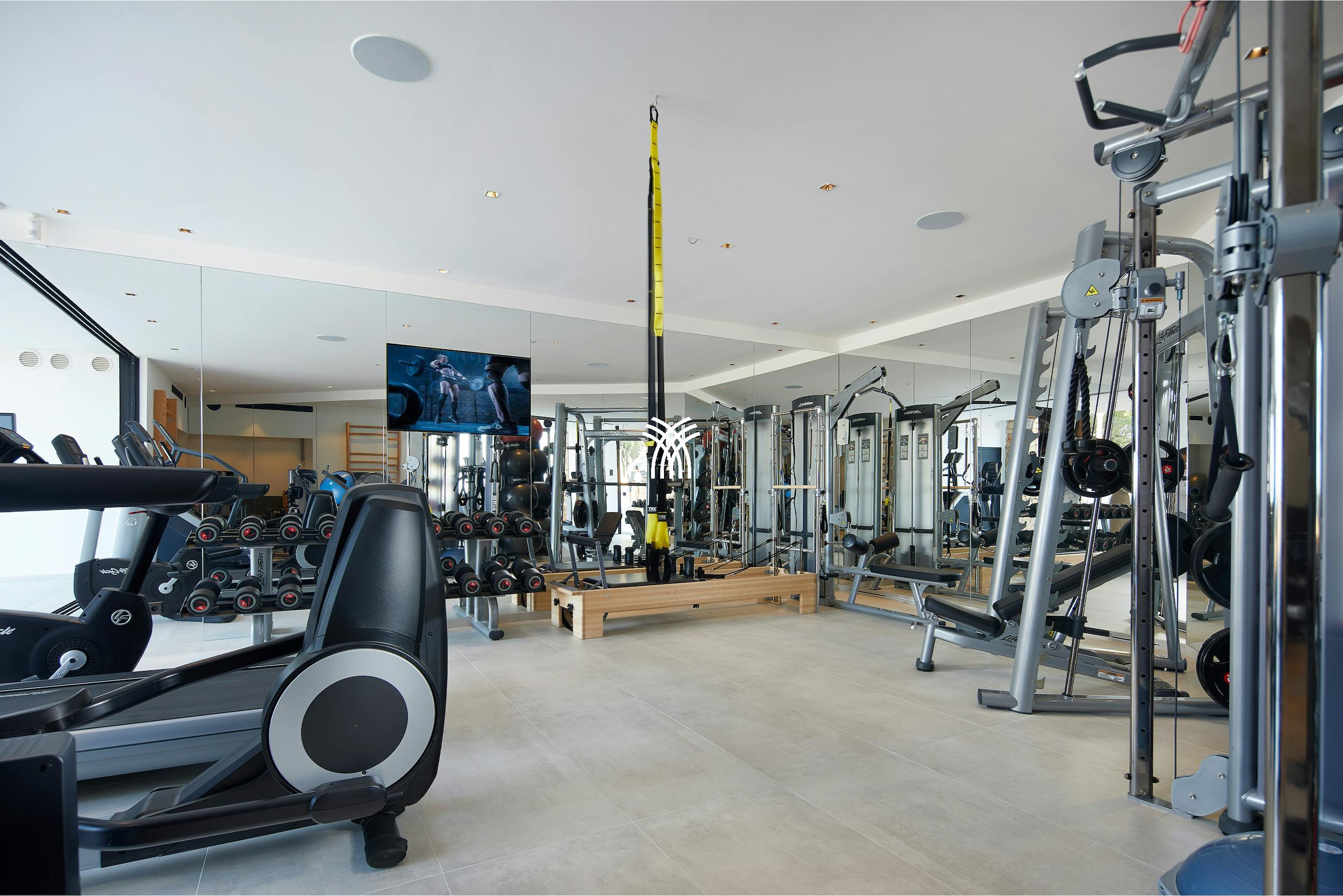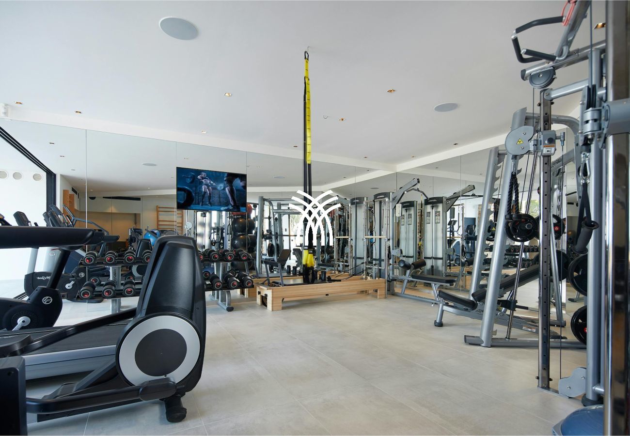 L’extérieur est pensé comme un véritable resort : piscine à débordement, solarium, bar extérieur, espace barbecue, salon de détente, jardin tropical, terrain de jeux pour les enfants et feu de camp pour admirer les couchers de soleil. La villa dispose également d’un gymnase professionnel équipé LifeFitness, d’un bureau pour travailler en toute sérénité et d’un système de sécurité complet avec caméras.