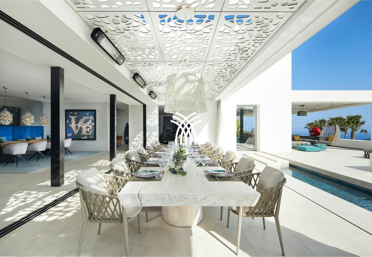 À l'intérieur, les espaces lumineux et aérés de la villa sont soigneusement décorés avec des tons de vert de mer doux et une esthétique moderne raffinée. L'espace de vie spacieux dispose de sièges de salon confortables sous un plafond à double hauteur, et l'élégant espace à manger pour dix personnes s'ouvre sur des vues de la piscine et de la mer. La cuisine entièrement équipée garantit tout ce dont vous avez besoin pour un séjour sans faille et confortable.