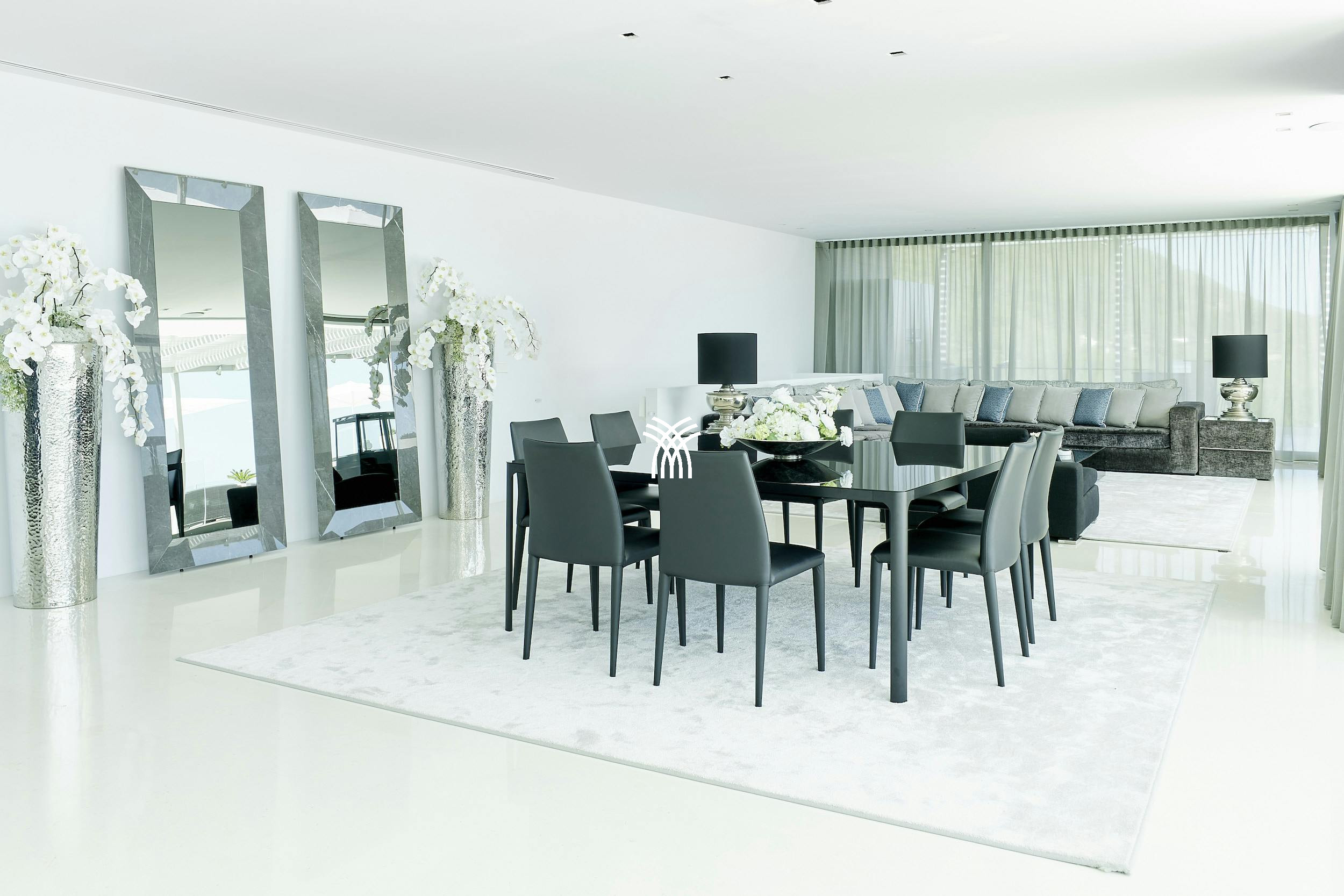 À l'intérieur, la villa dégage une élégance naturelle. Des intérieurs blancs et frais, des sols en béton poli et des sièges de salon somptueux définissent l'espace de vie principal, qui est rehaussé par une cheminée d'hiver, un système audio surround Bose et la télévision satellite internationale. La cuisine élégante et entièrement équipée comprend des appareils haut de gamme tels qu'une machine à café Gaggenau et un refroidisseur de vin Liebherr. À côté, la salle à manger formelle offre une atmosphère intime avec vue sur la cour paisible.