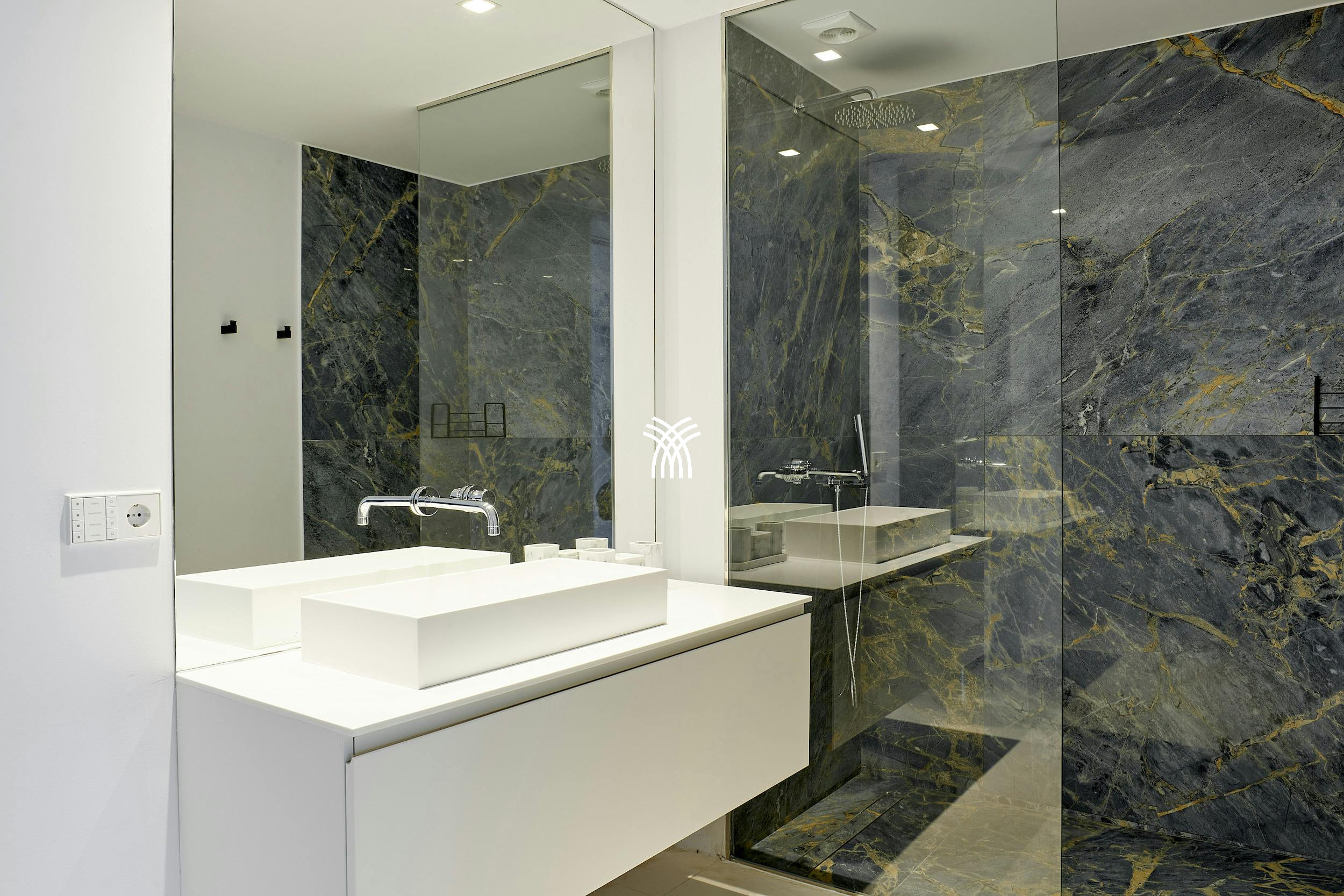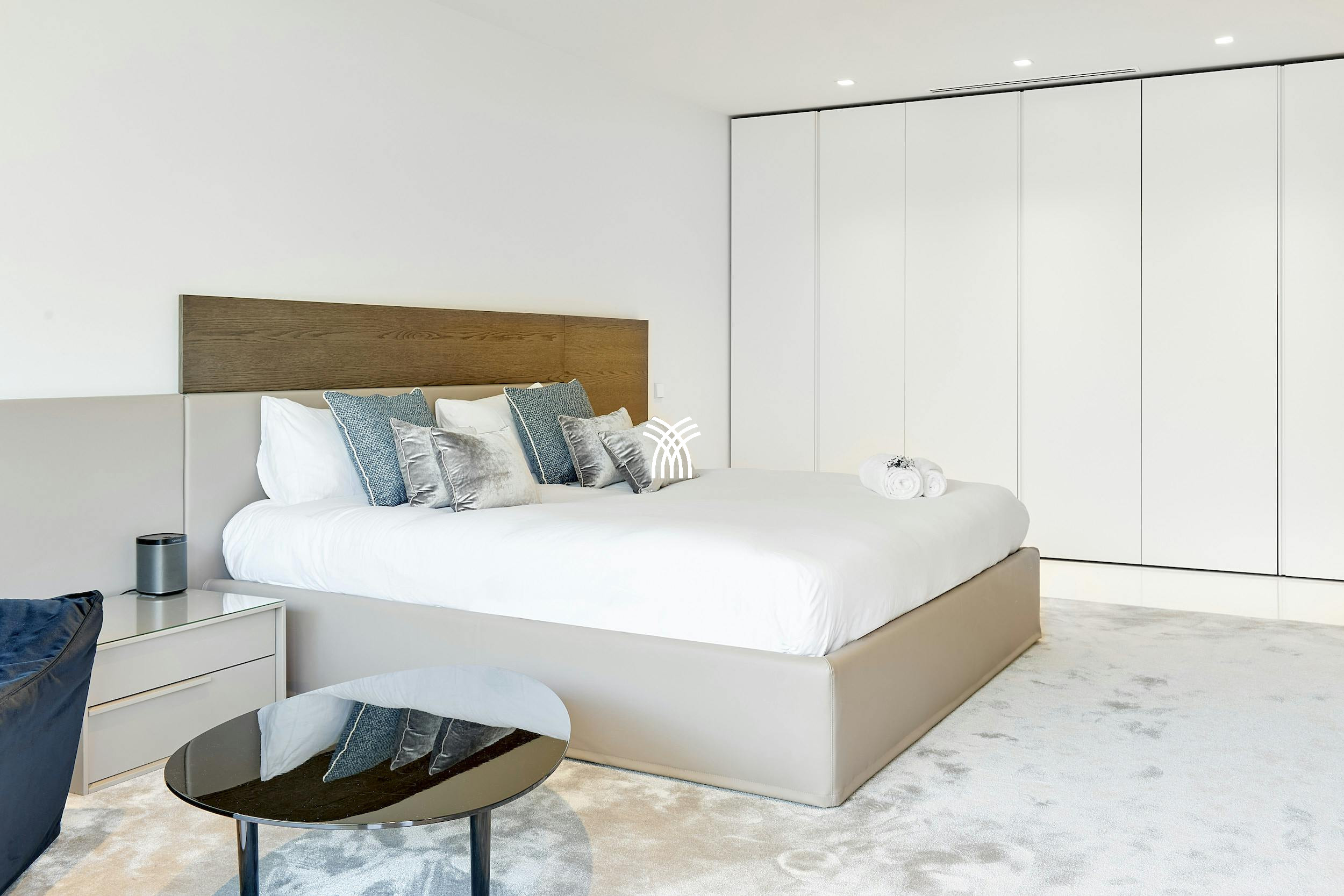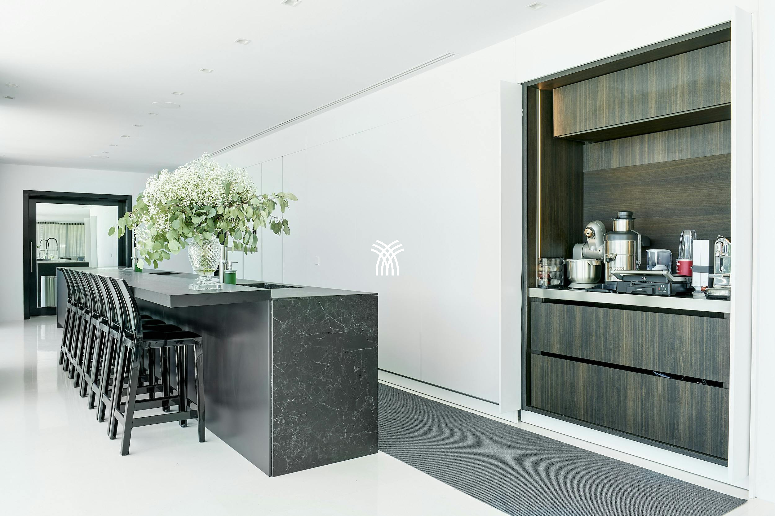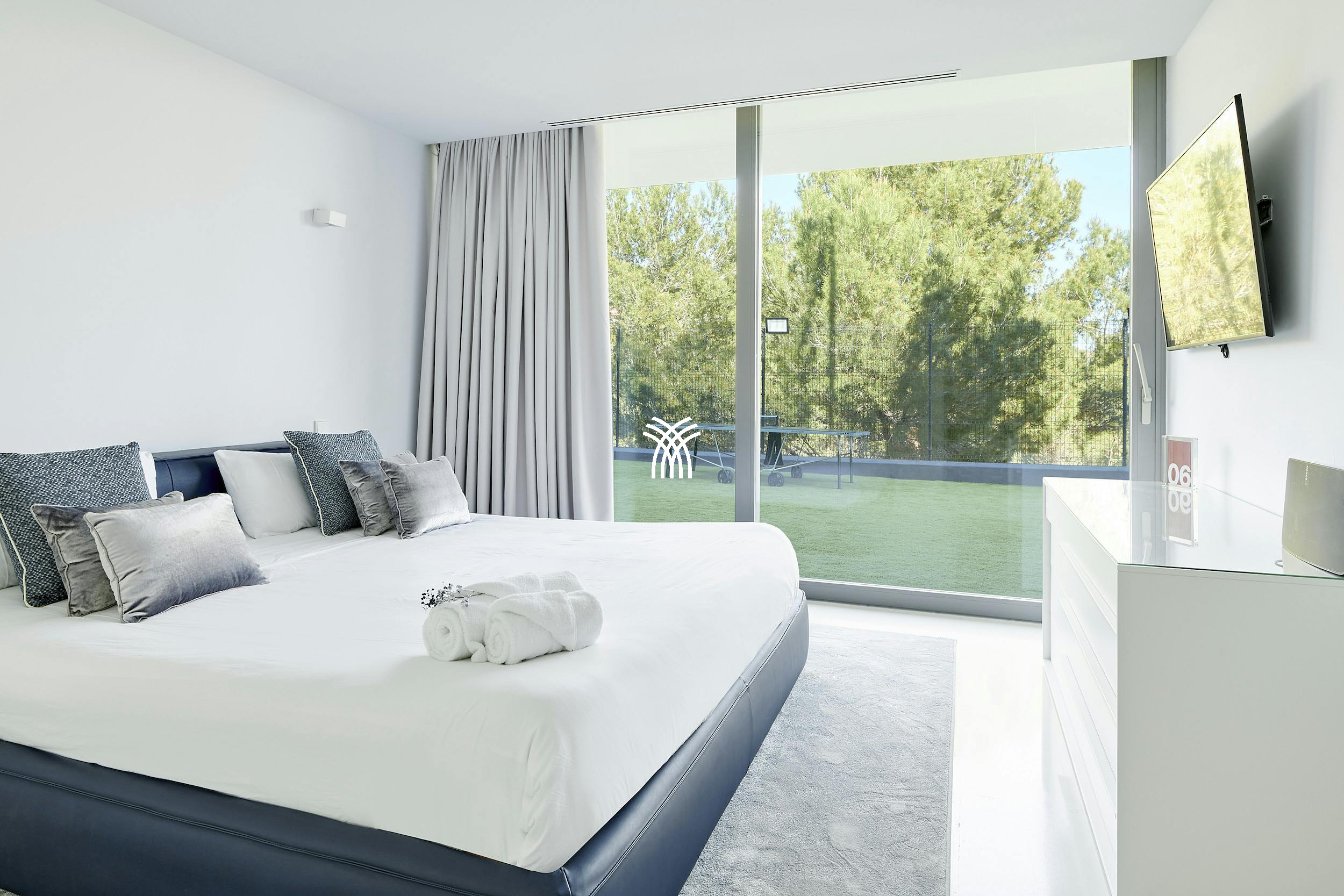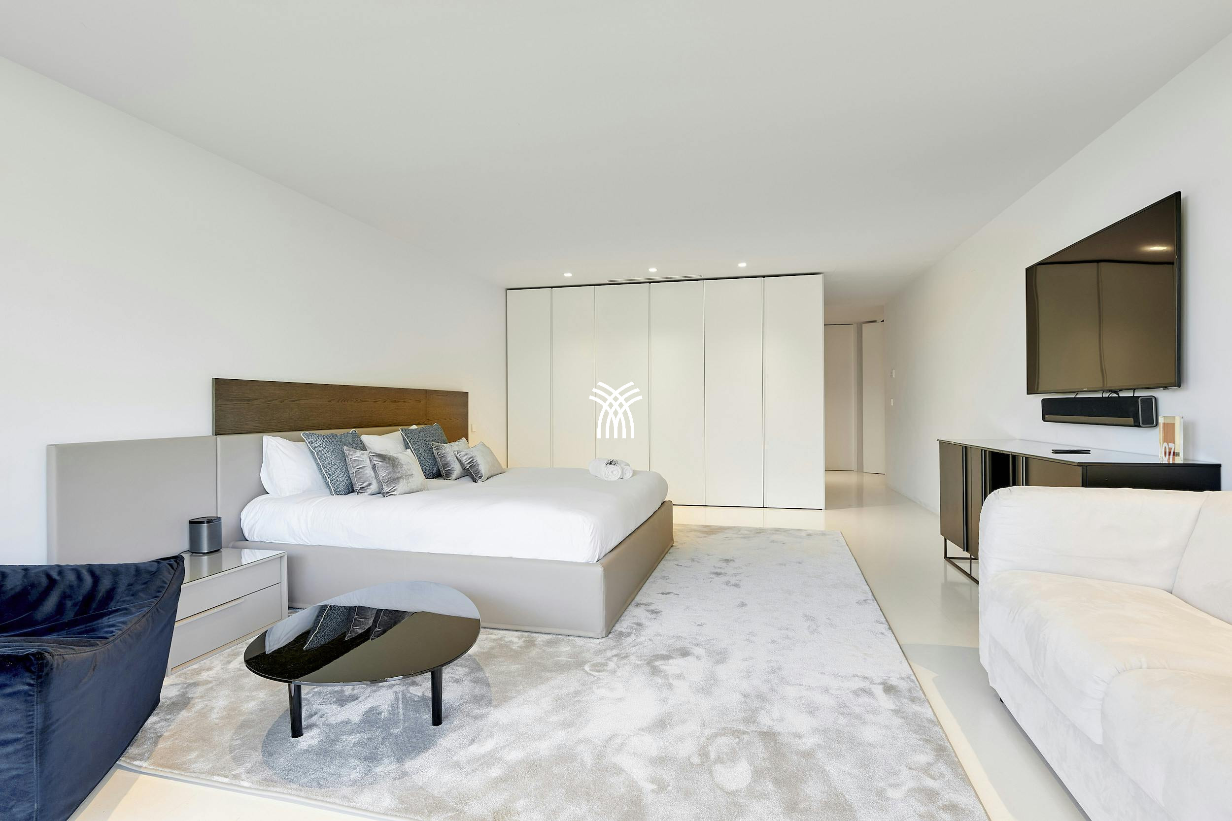 À l'intérieur, la villa dégage un style moderne raffiné avec des intérieurs signés par l'architecte renommé Bruno Erpicum. Des portes coulissantes du sol au plafond mélangent harmonieusement les espaces intérieurs et extérieurs, laissant la lumière naturelle inonder le salon ouvert, la cuisine design et l'espace à manger élégant. Des tons doux, des textures moelleuses et des finitions brillantes créent une atmosphère sereine et sophistiquée, parfaite pour se détendre ou recevoir.