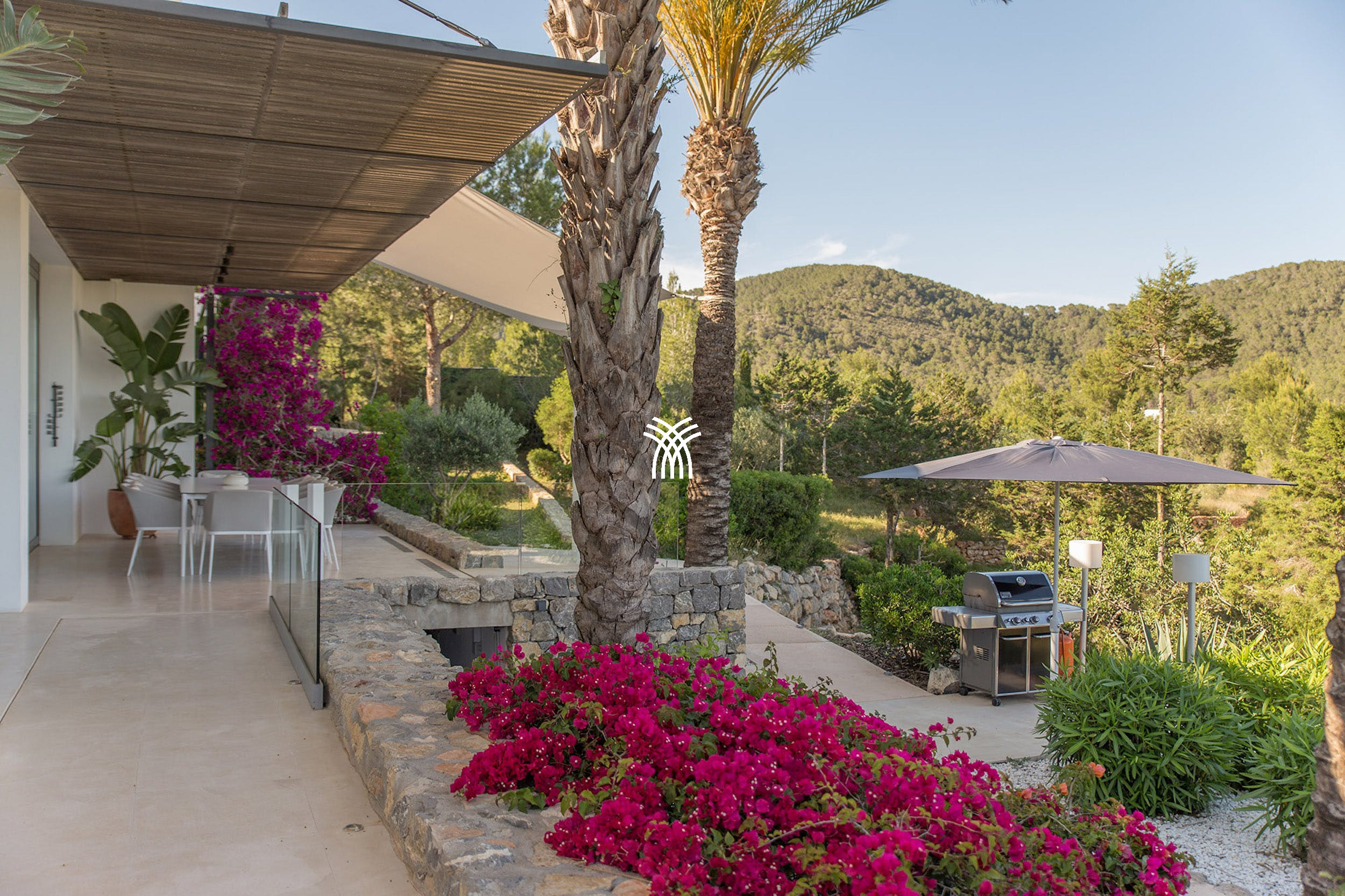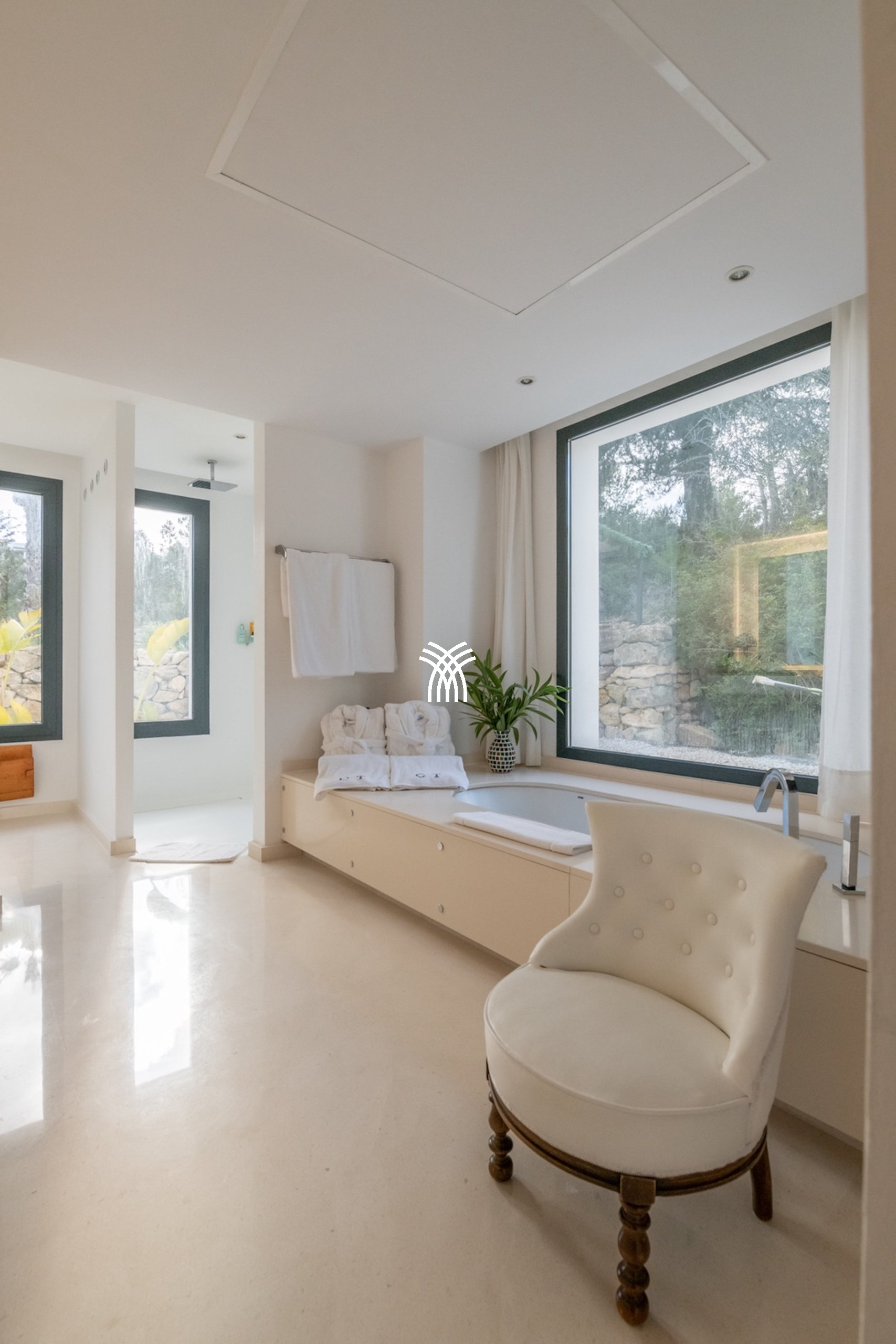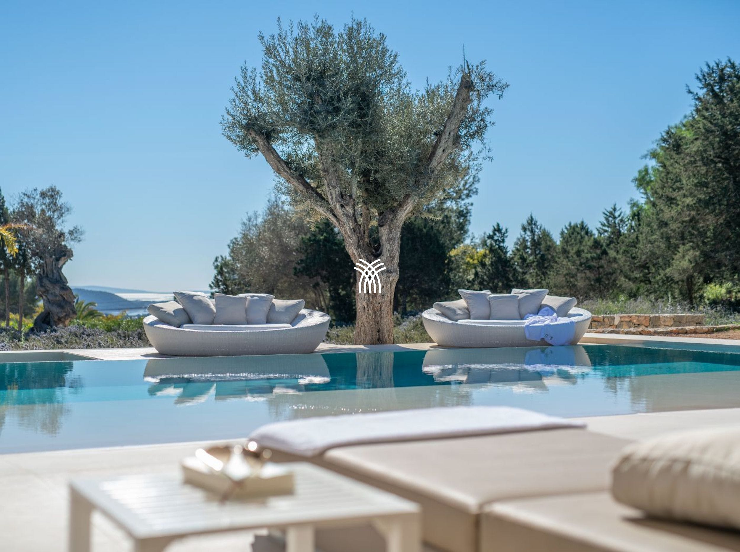 Des gazebos élégants, des oliviers anciens et des salons ombragés et confortables vous invitent à vous détendre au bord de la piscine, tandis que des terrasses surélevées offrent des vues captivantes sur le lever et le coucher du soleil le long de la côte sud d'Ibiza. Que ce soit en sirotant une boisson fraîche à l'ombre ou en dînant sous les étoiles, les extérieurs de la villa offrent un cadre magique pour chaque moment.