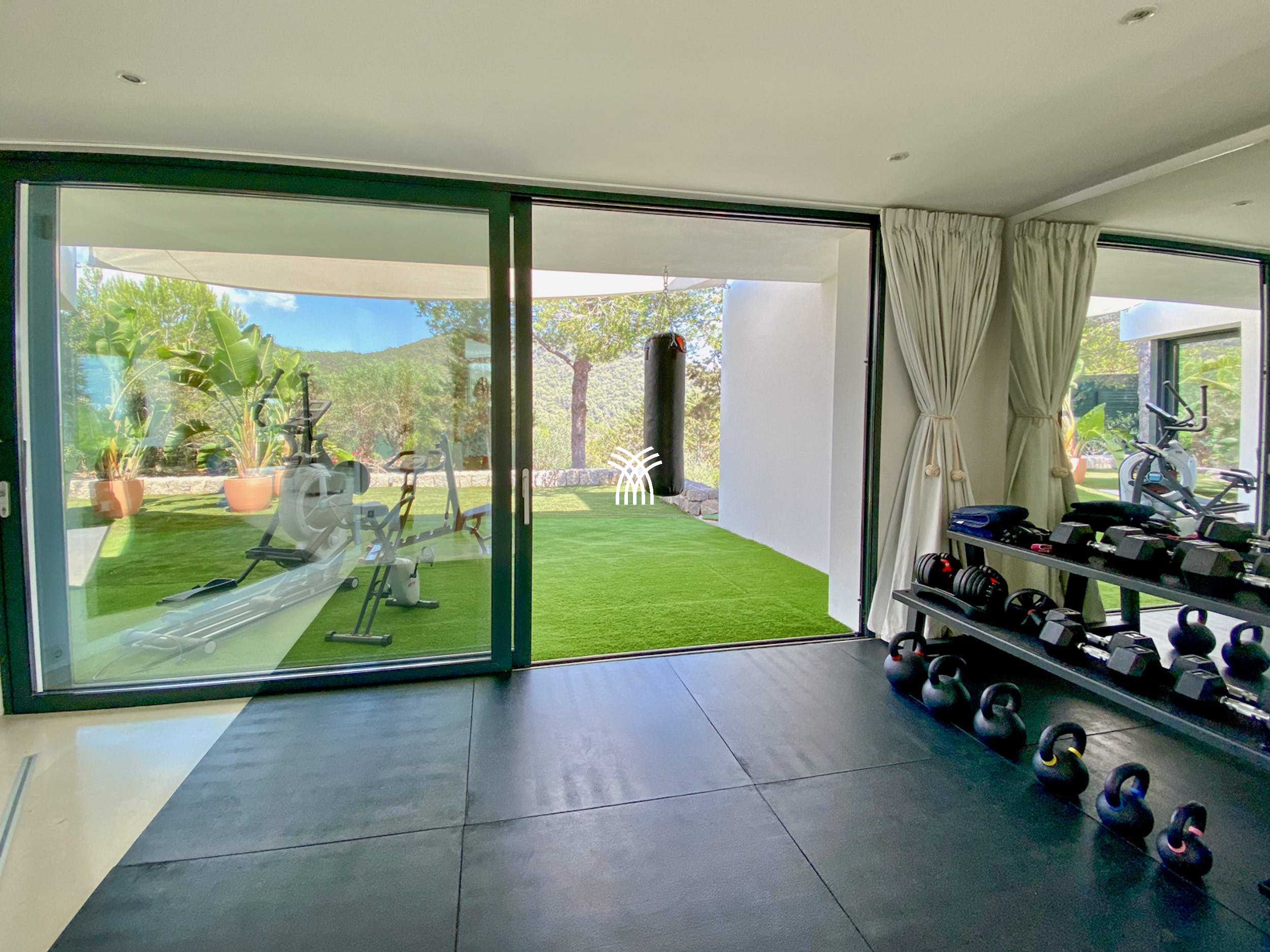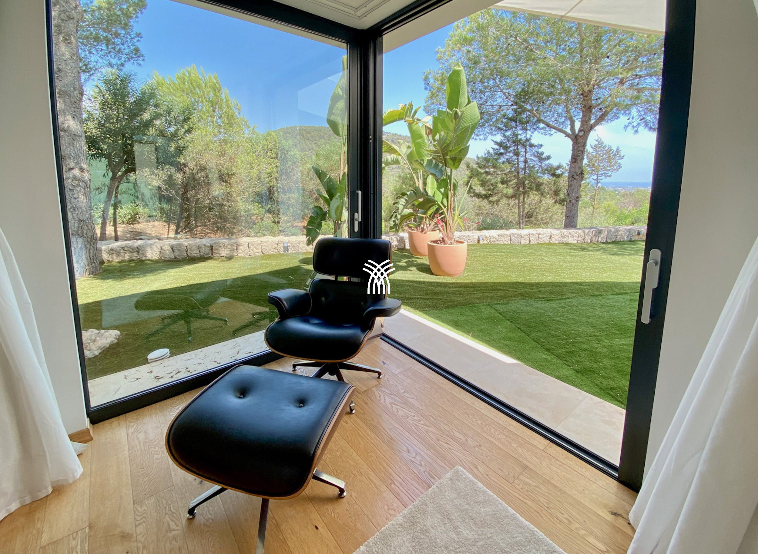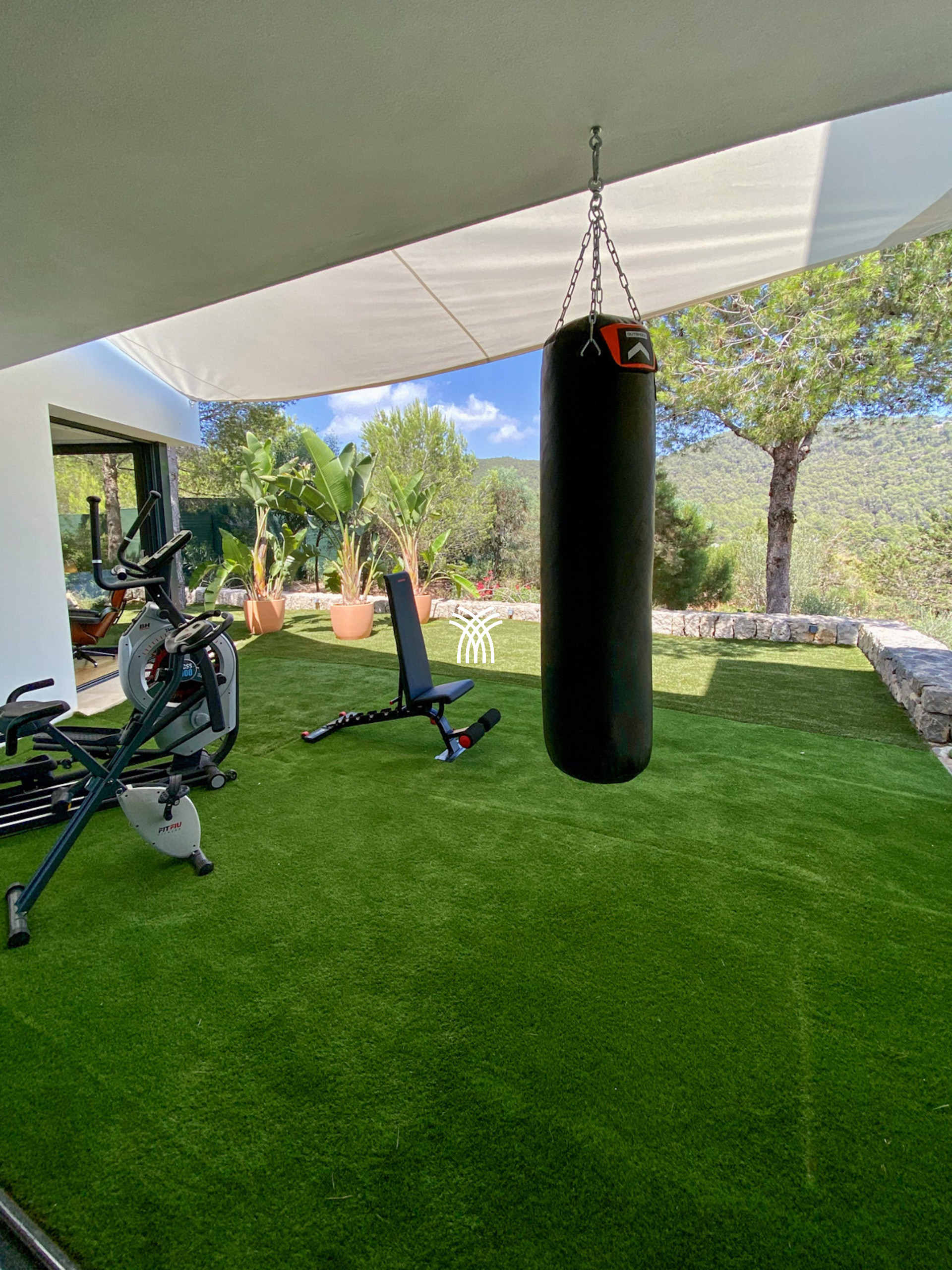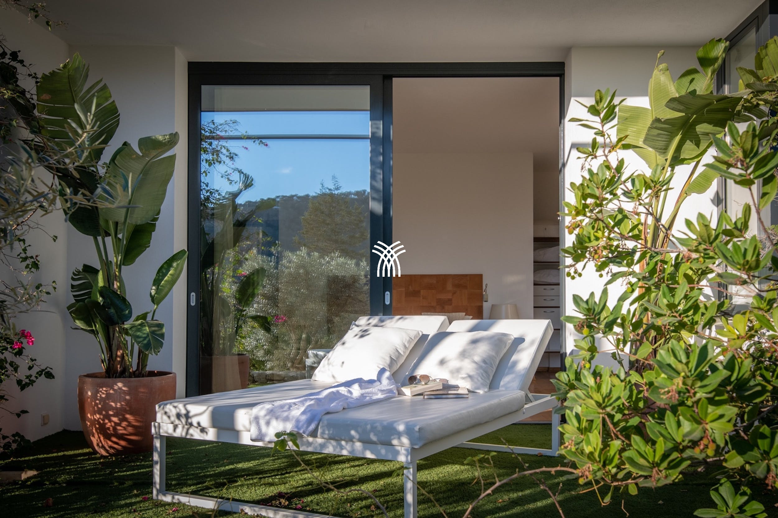 Des gazebos élégants, des oliviers anciens et des salons ombragés et confortables vous invitent à vous détendre au bord de la piscine, tandis que des terrasses surélevées offrent des vues captivantes sur le lever et le coucher du soleil le long de la côte sud d'Ibiza. Que ce soit en sirotant une boisson fraîche à l'ombre ou en dînant sous les étoiles, les extérieurs de la villa offrent un cadre magique pour chaque moment.