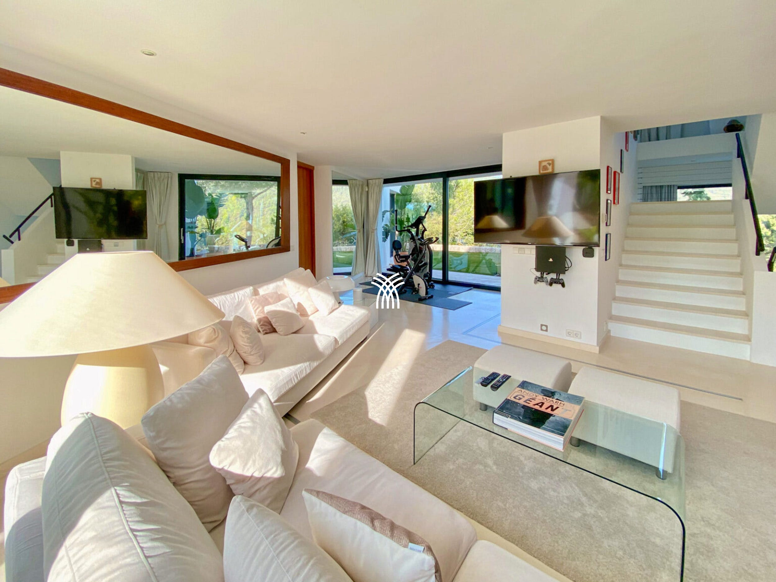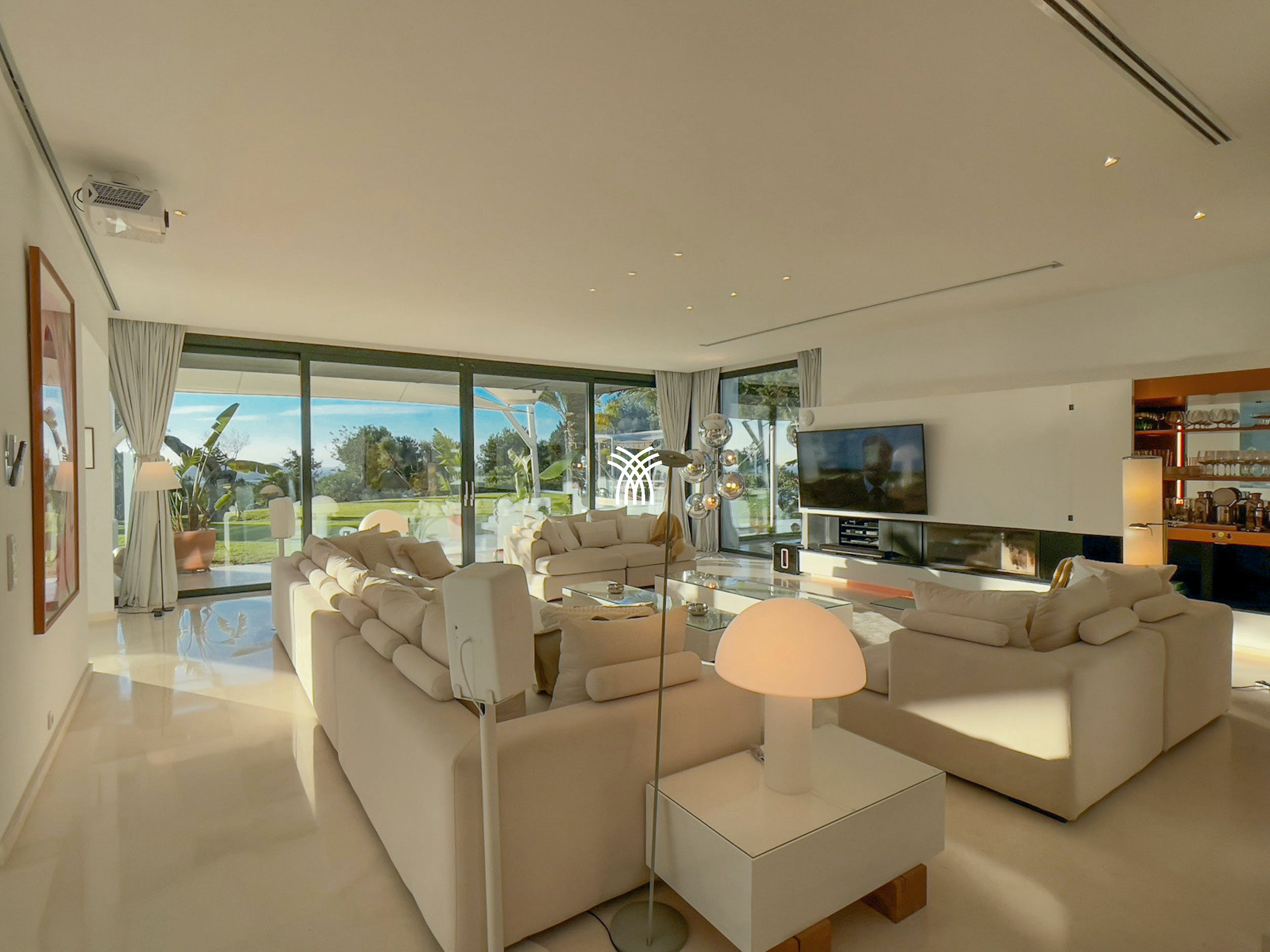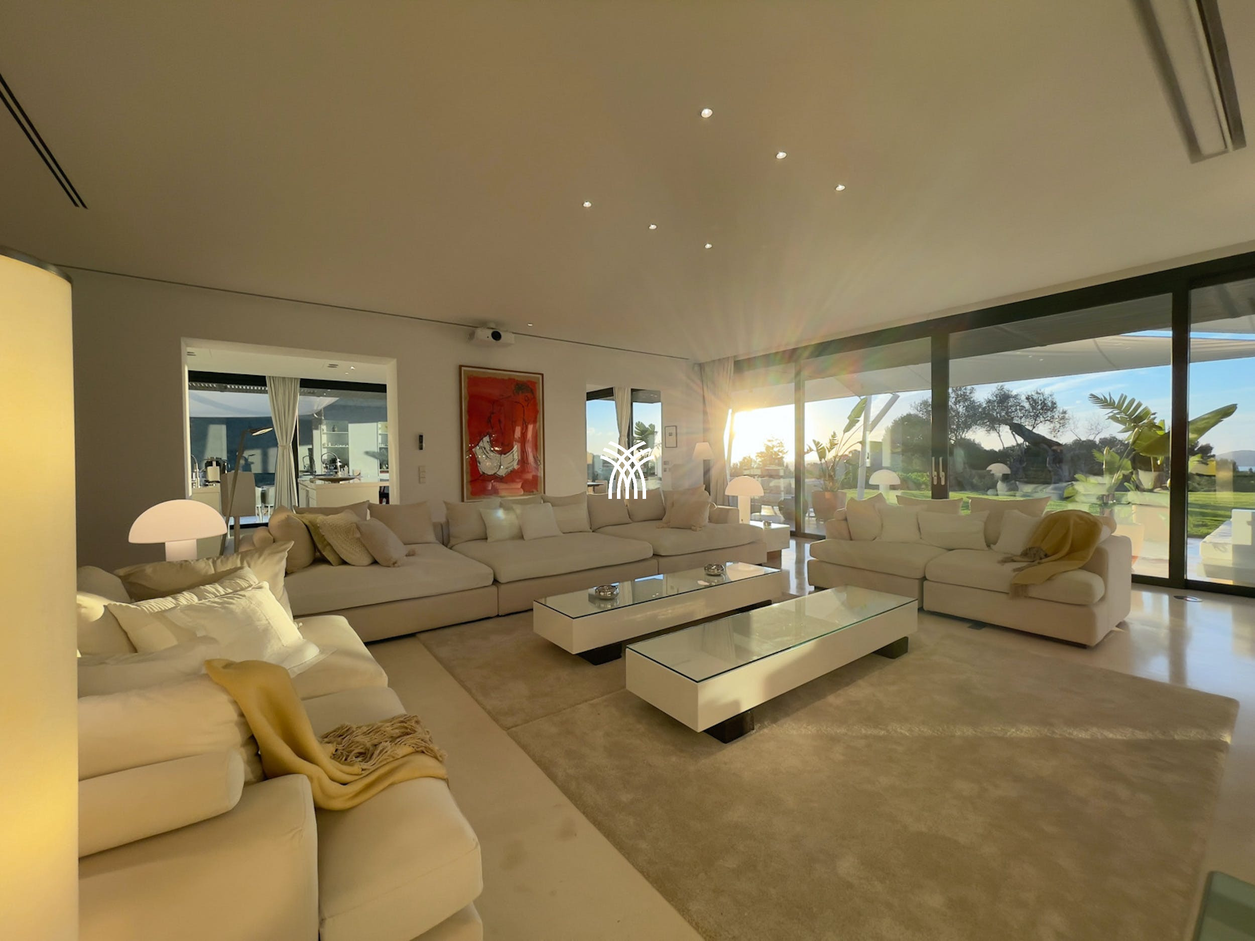 Conçue pour ceux qui apprécient la beauté, le confort et la tranquillité, cette villa élégante offre une disposition ouverte spacieuse avec une cuisine moderne entièrement équipée, comprenant un îlot élégant de 4 mètres et une salle à manger pour dix personnes. L'ample espace de vie s'étend harmonieusement à travers des portes coulissantes vitrées vers les terrasses ensoleillées et la terrasse de la piscine, offrant une vue imprenable et ininterrompue sur la mer Méditerranée.