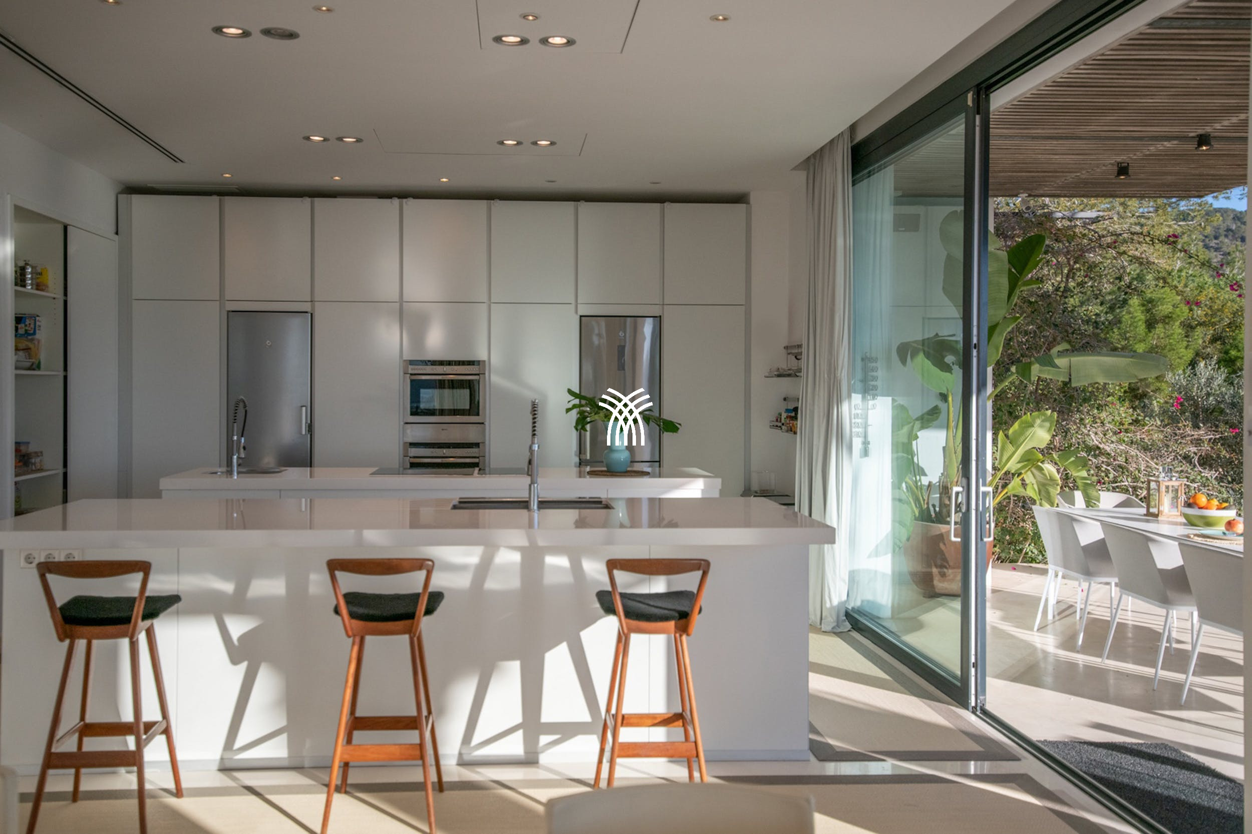 À l'intérieur, la villa continue de séduire par son design épuré et son ambiance sereine. La lumière du soleil pénètre à travers les portes coulissantes vitrées dans des espaces de vie ouverts et spacieux. La cuisine moderne est équipée pour des expériences gastronomiques et s'ouvre sur un espace de repas en plein air élégant, entouré d'arbustes aromatiques et de verdure. Un coin petit-déjeuner ensoleillé et un bar brillant offrent des options de restauration décontractées, tandis que le grand salon intérieur présente des canapés élégants en crème, des sols polis et un accès direct à une terrasse donnant sur la mer.