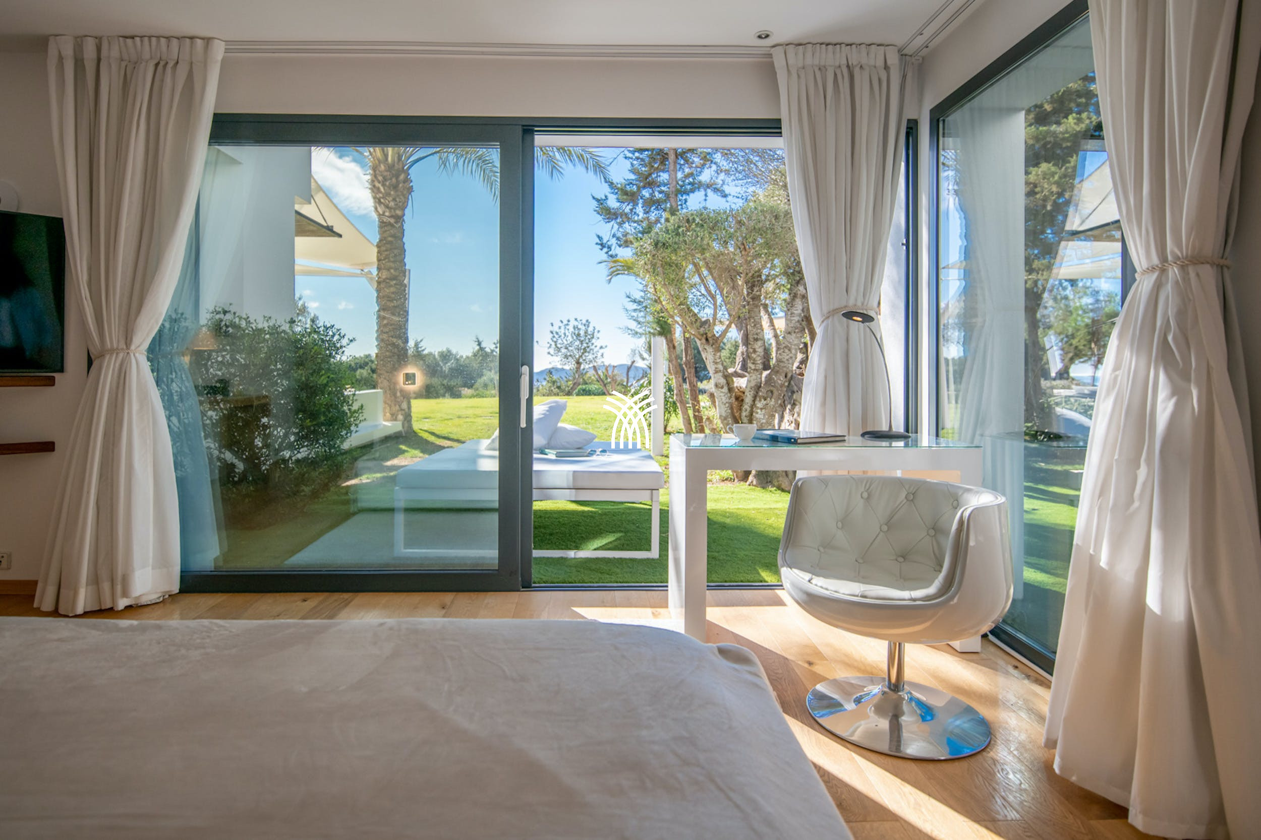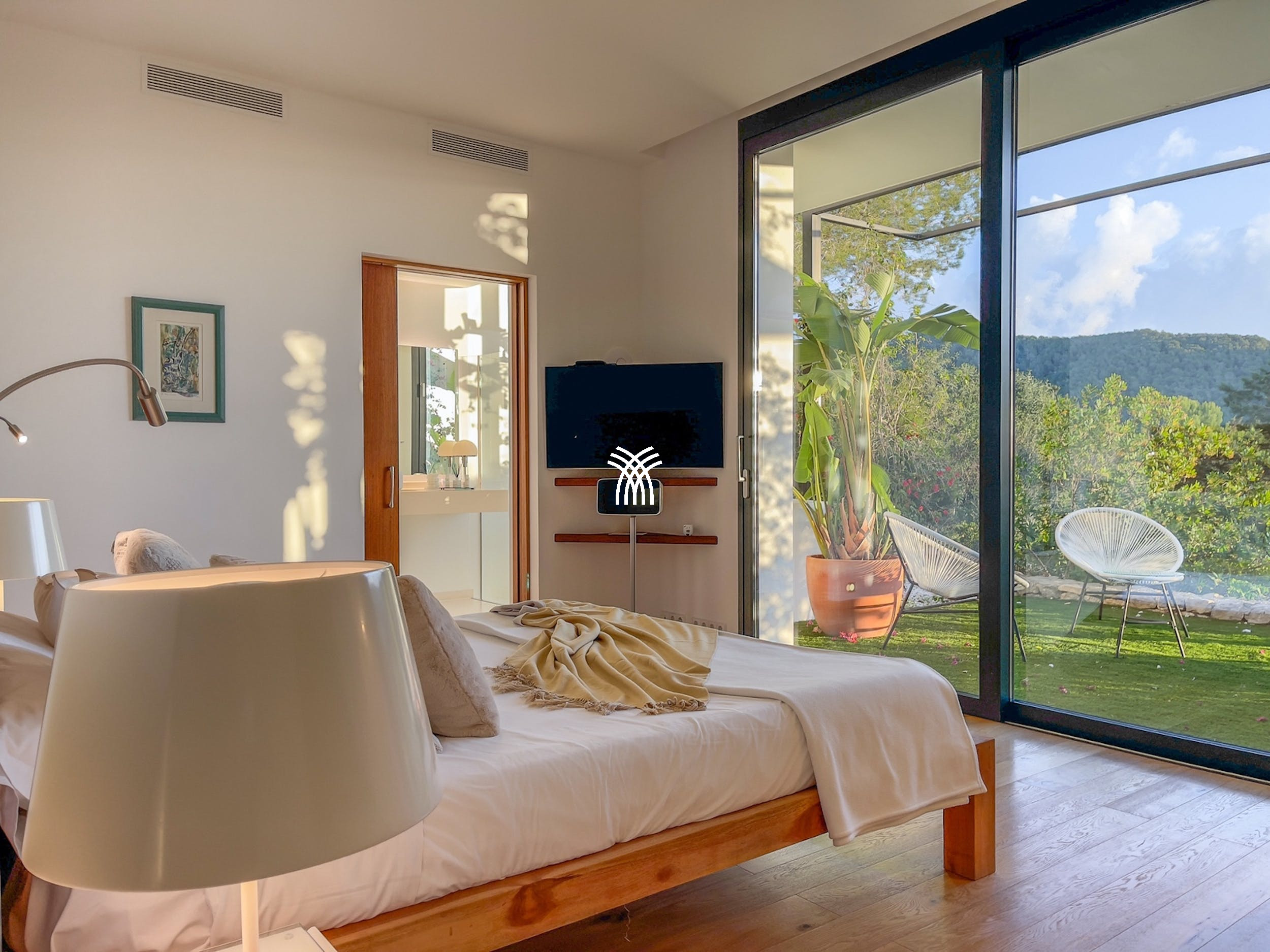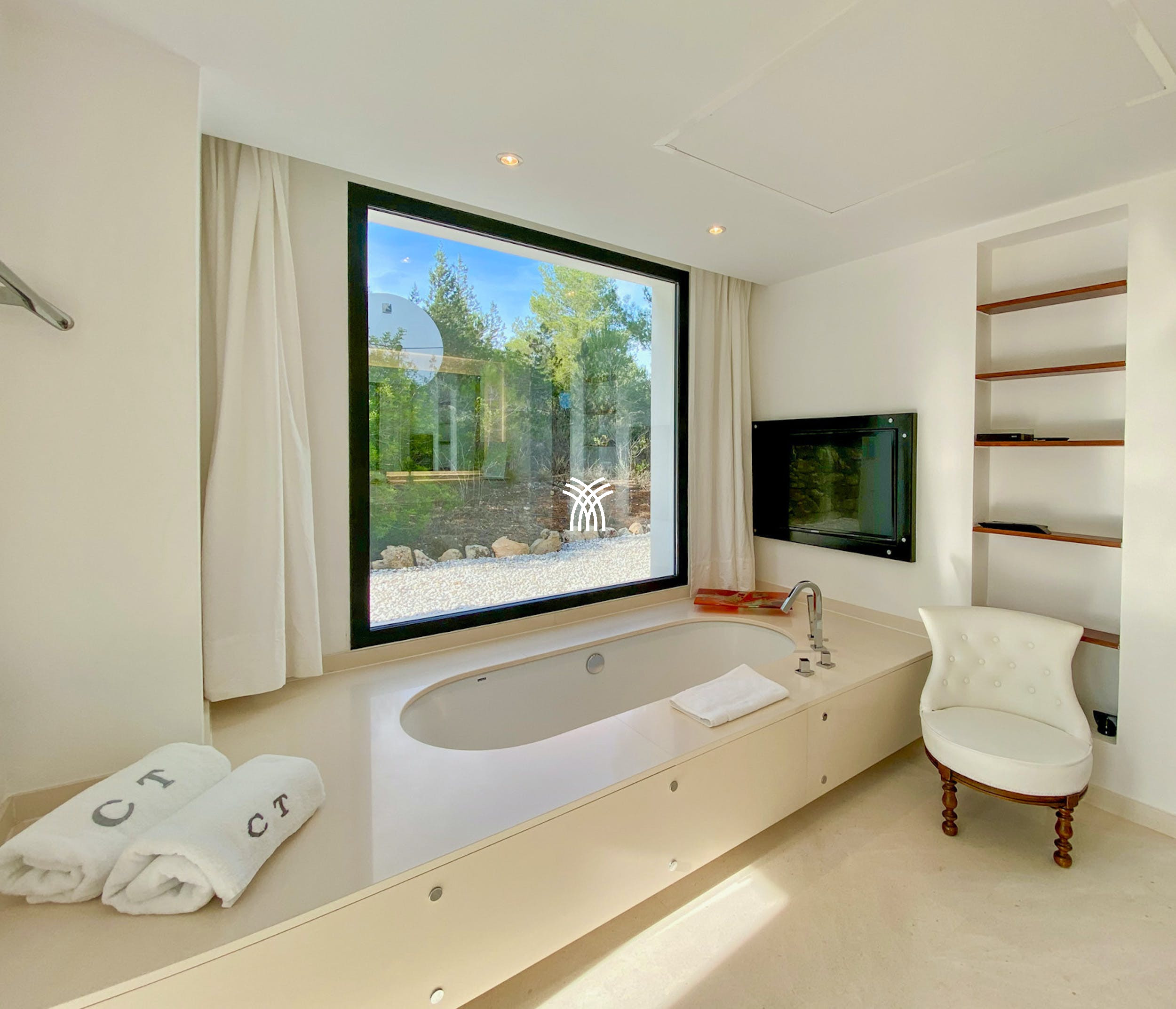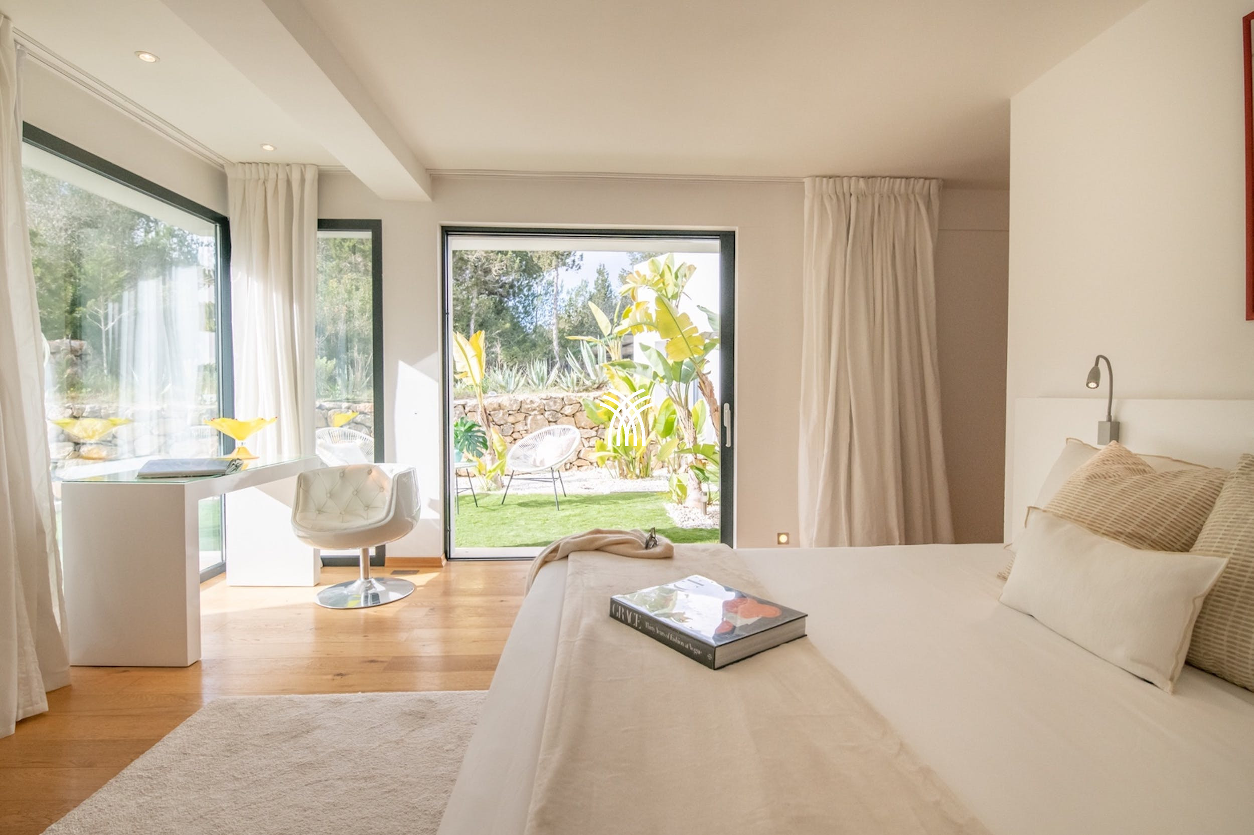 La Villa Viviana propose trois magnifiques chambres doubles avec salles de bains attenantes. Deux sont situées dans la maison principale, chacune offrant des vues panoramiques sur la mer, la climatisation et le chauffage au sol. La suite de l'étage supérieur offre plus d'intimité, une grande terrasse et une vue imprenable sur Es Vedra et la côte environnante.