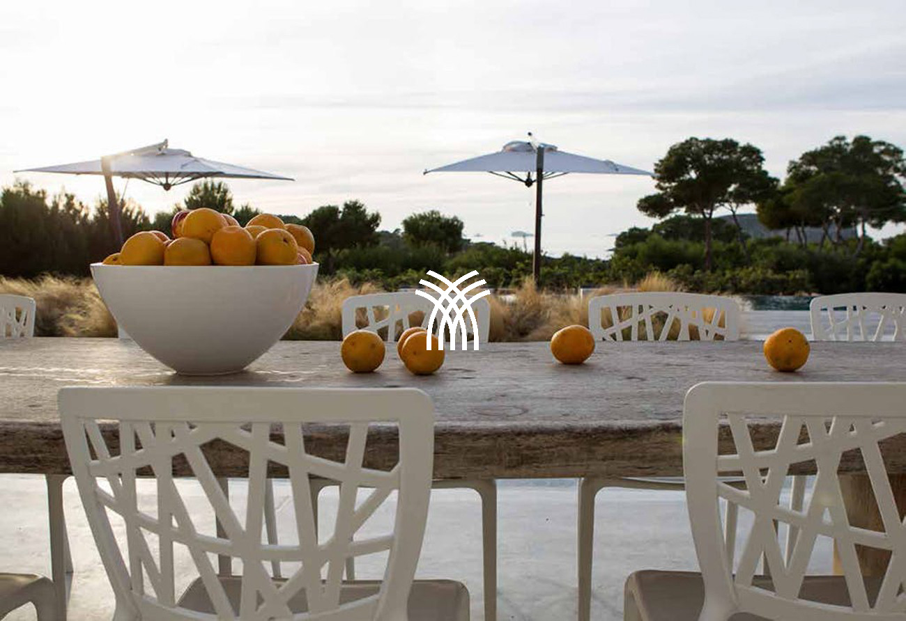 Le point focal de cette échappée magnifique à Ibiza est la piscine à débordement spectaculaire, où l'eau semble se fondre parfaitement avec la mer ouverte. Une terrasse blanche immaculée entoure la piscine, proposant des transats, un espace bar et des sièges détendus pour se prélasser pendant la journée ou déguster des cocktails sous les étoiles le soir. Un espace de repas ombragé par une voile, pouvant accueillir douze personnes, invite à de longs repas décontractés en famille ou entre amis, avec une vue sur la cime des arbres et l'horizon scintillant.