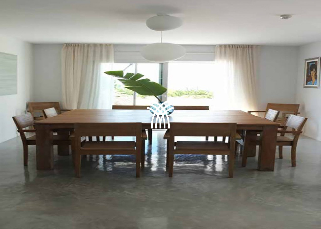 À l'intérieur, la villa dégage une élégance naturelle. Des intérieurs blancs et frais, des sols en béton poli et des sièges de salon somptueux définissent l'espace de vie principal, qui est rehaussé par une cheminée d'hiver, un système audio surround Bose et la télévision satellite internationale. La cuisine élégante et entièrement équipée comprend des appareils haut de gamme tels qu'une machine à café Gaggenau et un refroidisseur de vin Liebherr. À côté, la salle à manger formelle offre une atmosphère intime avec vue sur la cour paisible.