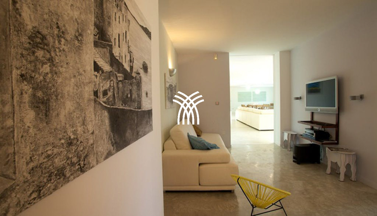 À l'intérieur, Villa Sabrina présente des intérieurs qui combinent l'élégance minimaliste et un confort total. Des tons blancs frais, des sols polis et des textures naturelles évoquent une ambiance calme et sereine. Le salon et la salle à manger spacieux en plan ouvert se connectent harmonieusement à la terrasse, tandis qu'une salle média confortable offre une échappatoire cinématographique. La cuisine entièrement équipée est idéale pour préparer des repas familiaux ou des événements, avec une vue charmante sur le jardin.