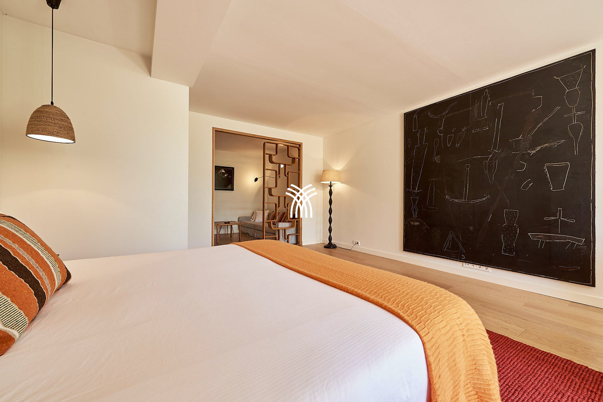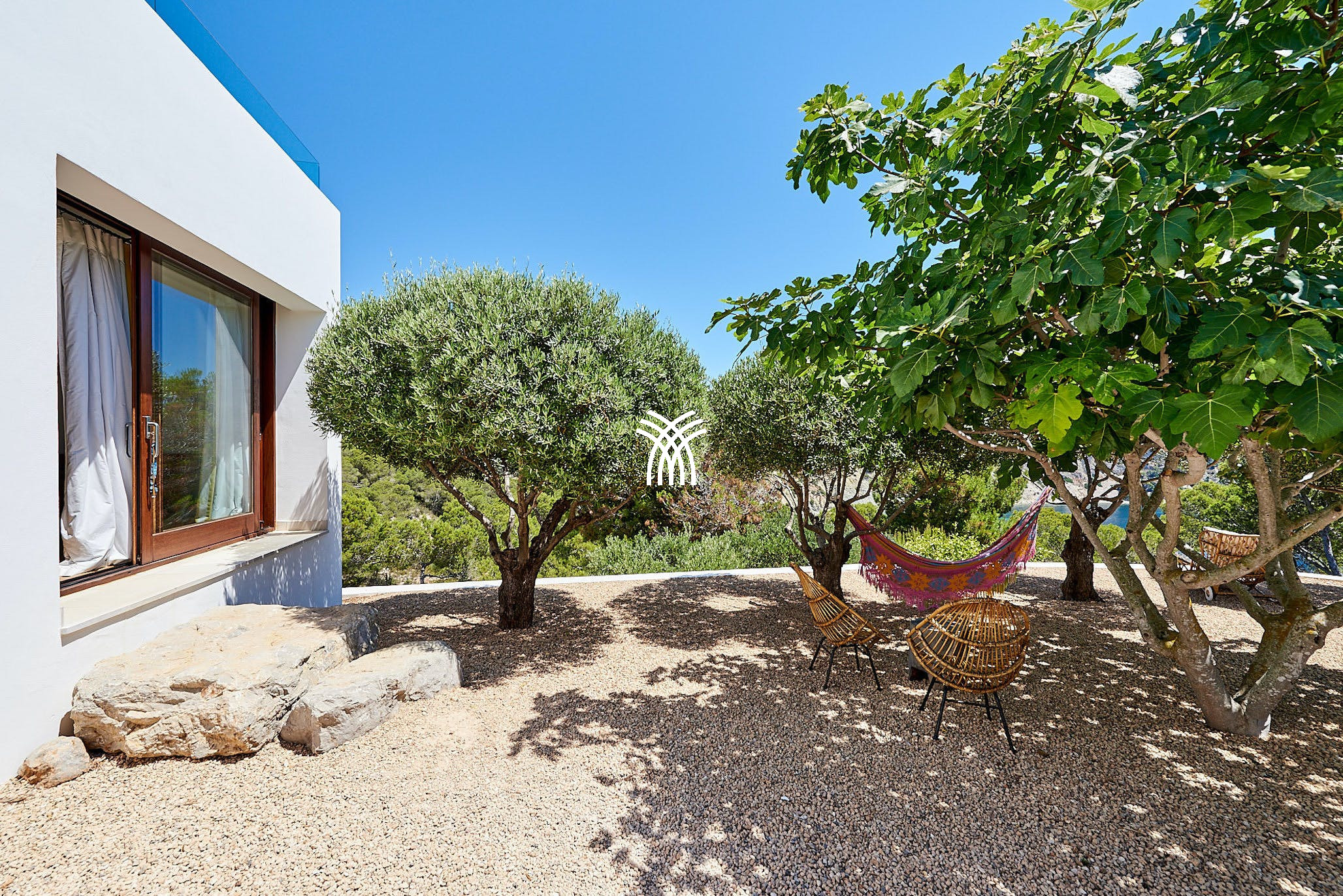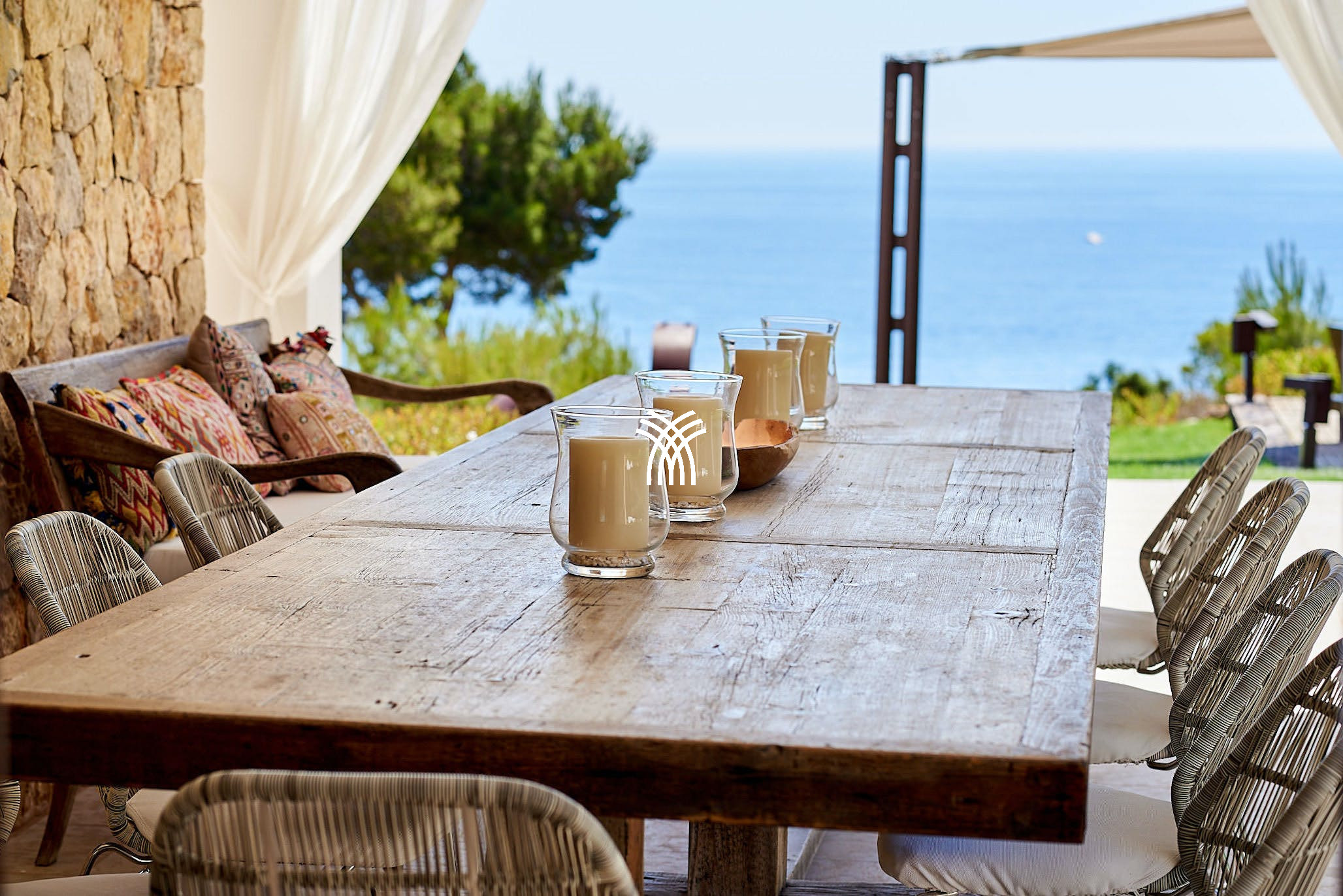 Les terrasses ombragées de la villa présentent des canapés moelleux, un espace repas pour dix personnes et des salons élégants en plein air sous des auvents en forme de voiles—parfaits pour une solitude paisible et des rassemblements animés. À l'intérieur, les espaces lumineux combinent l'élégance ibizenne moderne avec une touche rétro des années 50. L'espace de vie ouvert comprend des salons confortables, des œuvres d'art éclectiques et une table à manger qui se fond harmonieusement dans l'extérieur.