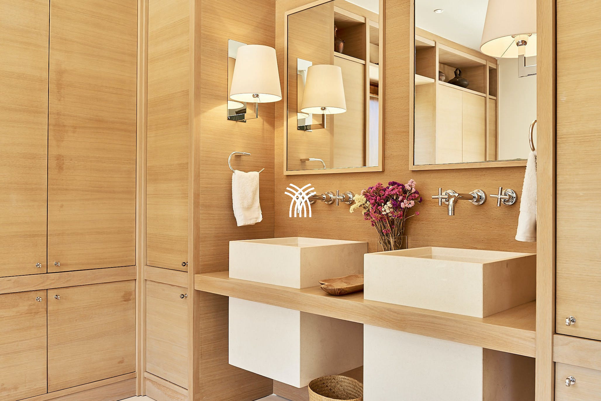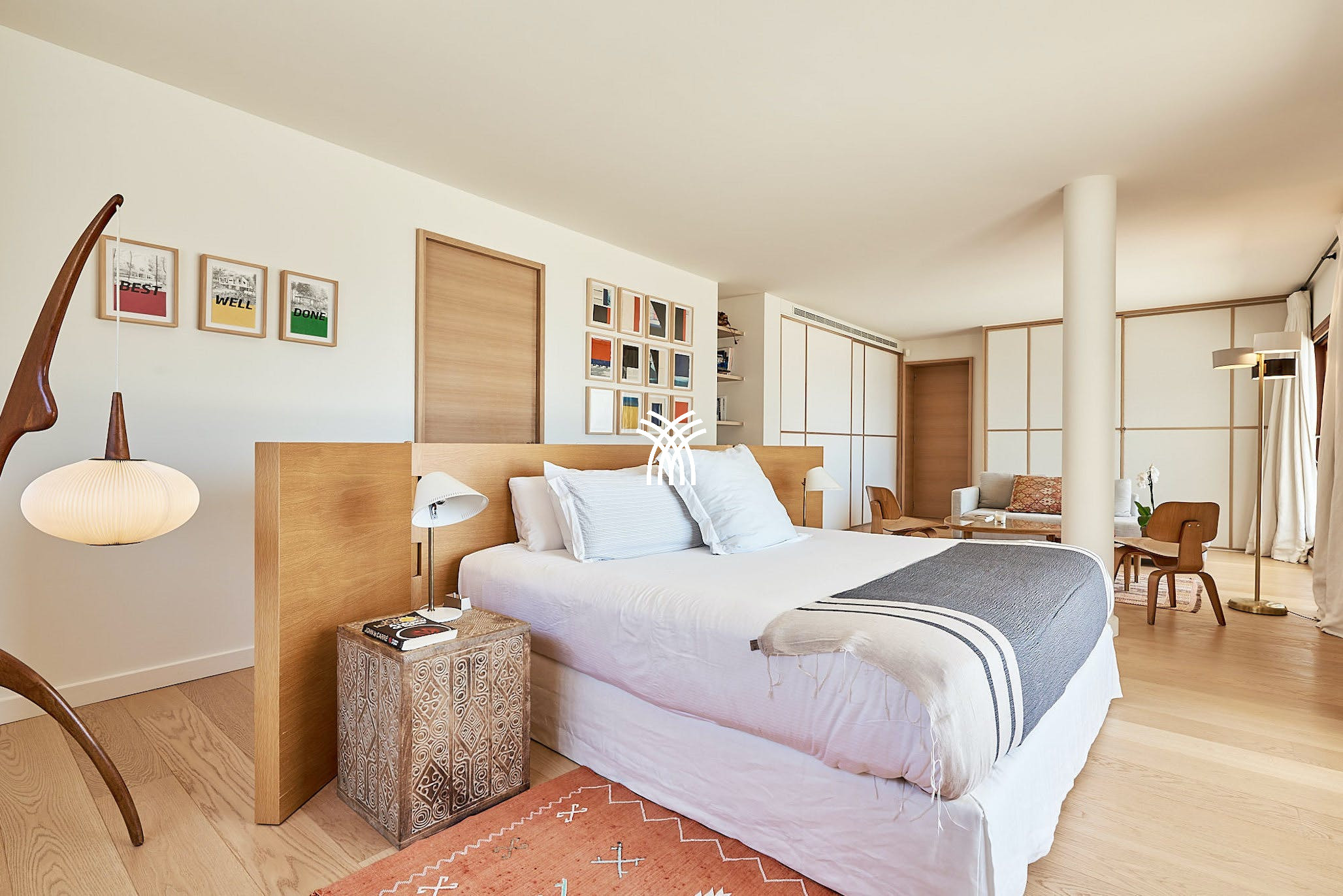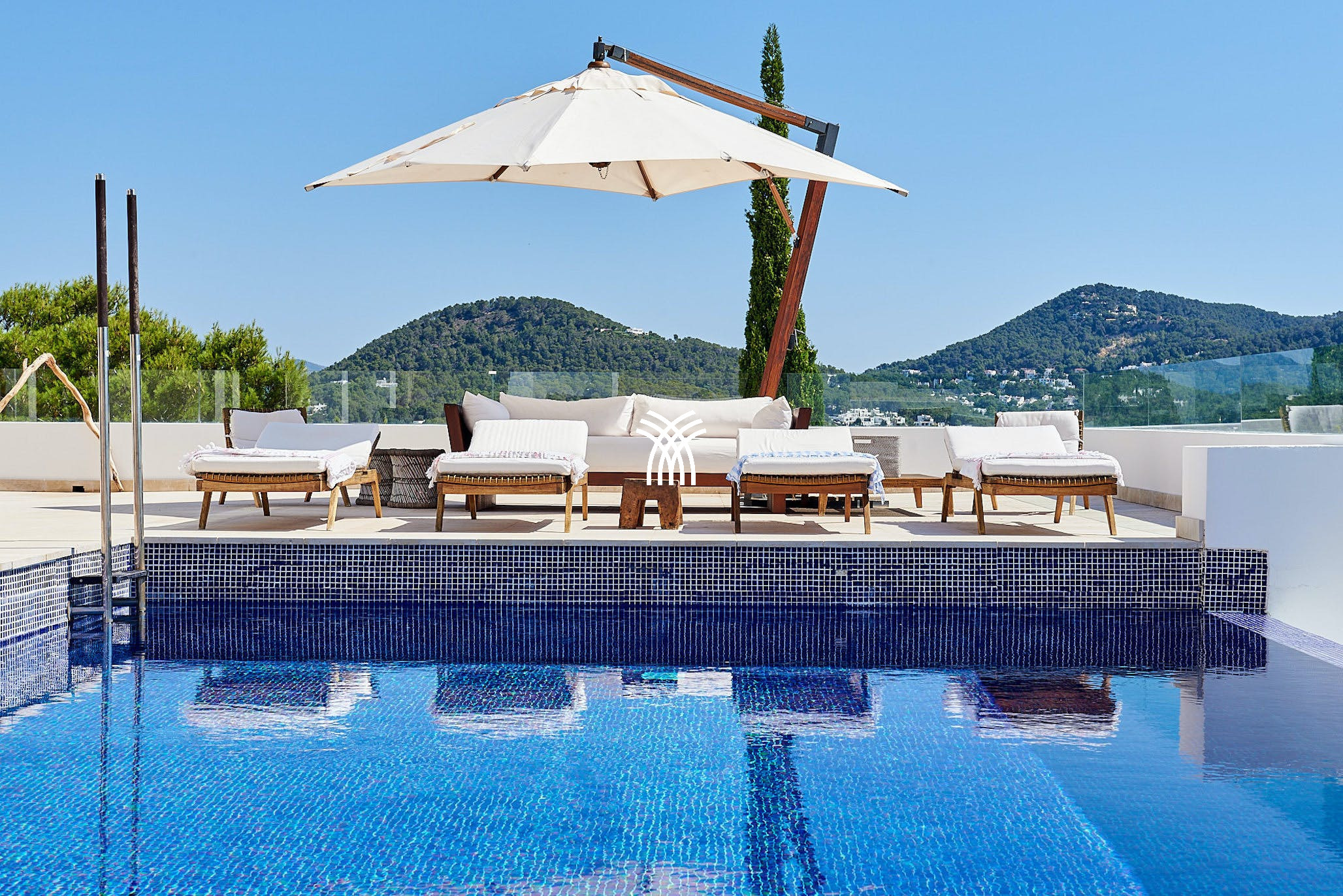 Les terrasses ombragées de la villa présentent des canapés moelleux, un espace repas pour dix personnes et des salons élégants en plein air sous des auvents en forme de voiles—parfaits pour une solitude paisible et des rassemblements animés. À l'intérieur, les espaces lumineux combinent l'élégance ibizenne moderne avec une touche rétro des années 50. L'espace de vie ouvert comprend des salons confortables, des œuvres d'art éclectiques et une table à manger qui se fond harmonieusement dans l'extérieur.