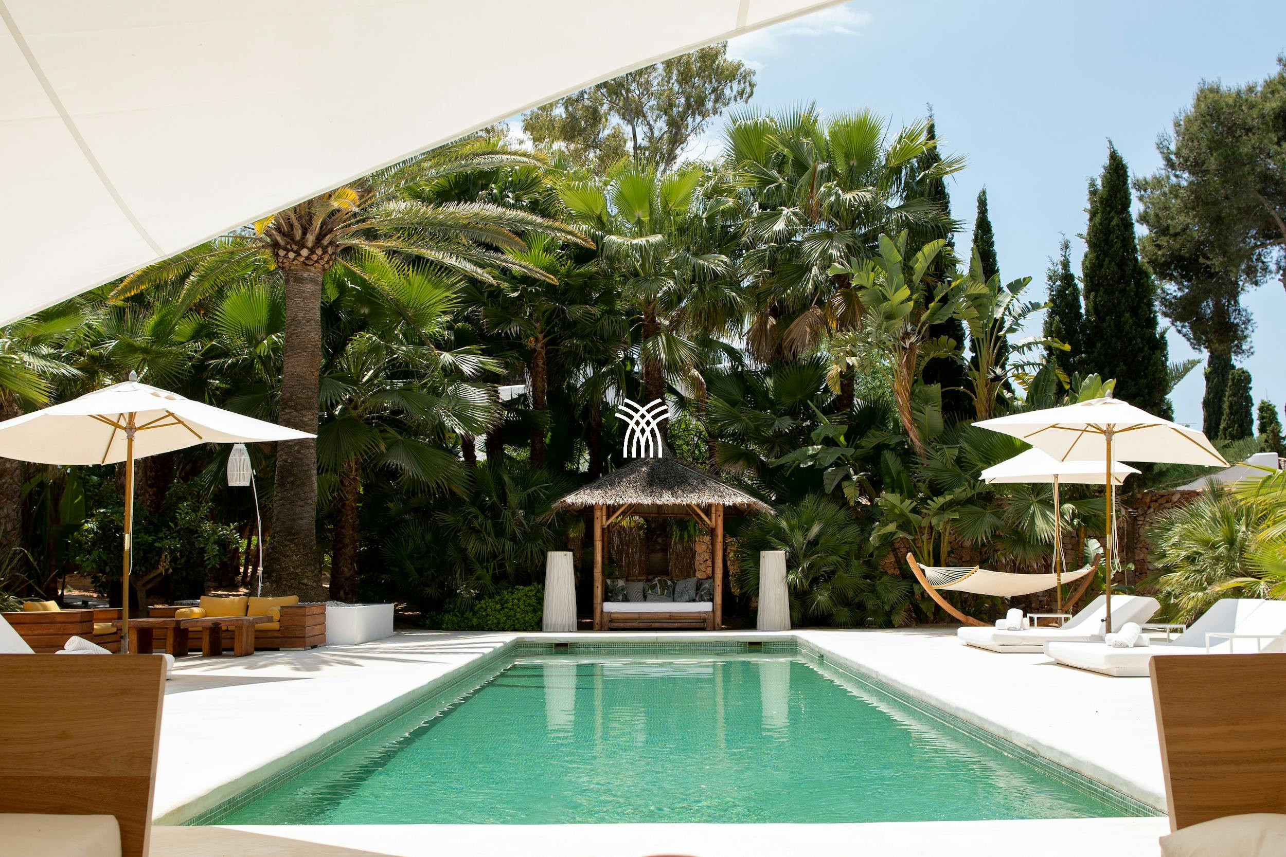 Au cœur de la propriété se trouve une spectaculaire piscine de 17 mètres avec un deck blanc immaculé qui exhale l'élégance intemporelle du style art déco. Autour de la piscine, des transats doubles de style balinais, des gazebos élégants en forme de voile et des lits de repos rustiques cachés créent plusieurs espaces de détente sereine nichés dans les jardins. Que vous preniez un bain de soleil près de l'eau ou que vous vous relaxiez à l'ombre des arbres, les espaces extérieurs sont parfaits pour des loisirs de luxe.