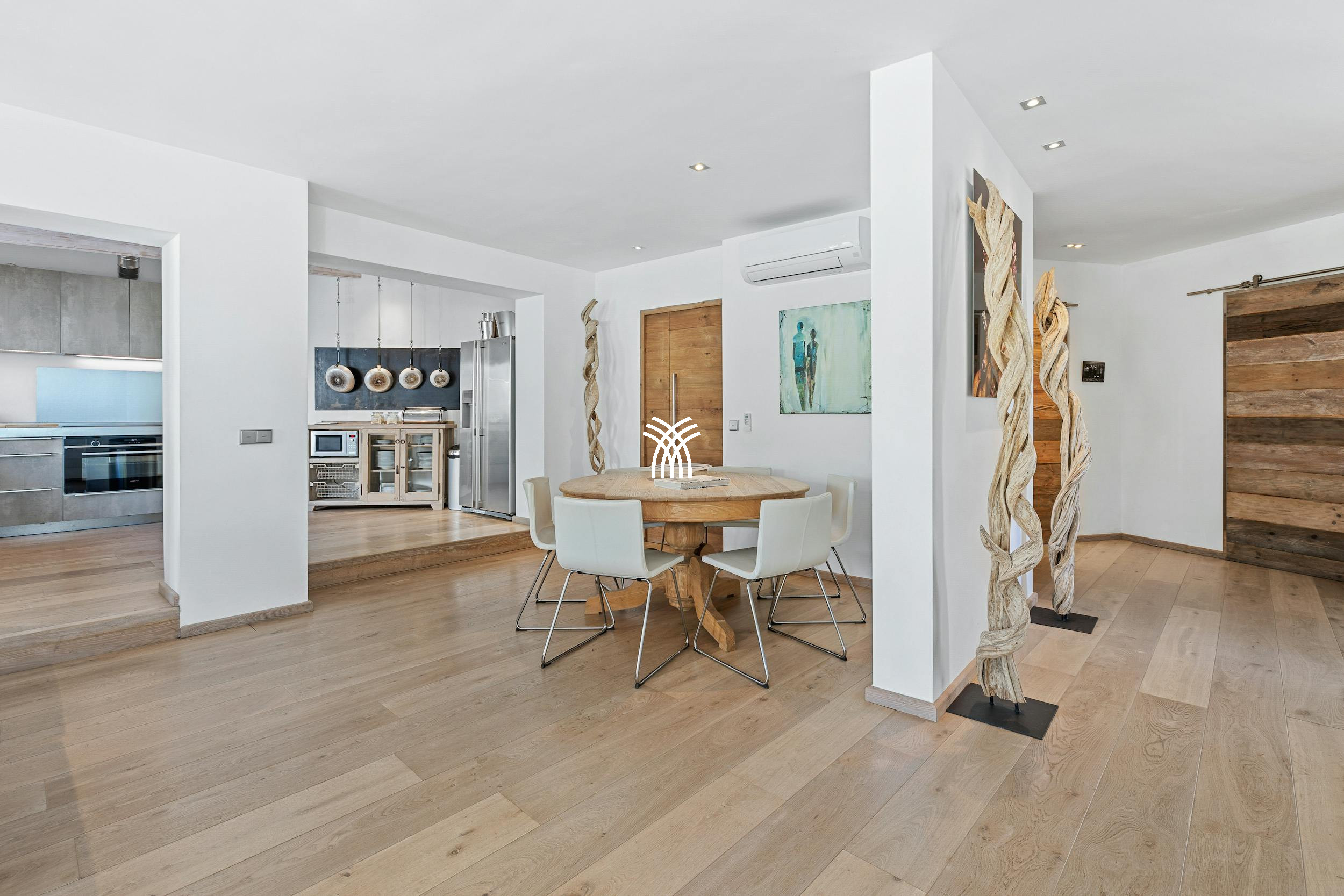 À l'intérieur, les espaces lumineux et aérés de la villa sont soigneusement décorés avec des tons de vert de mer doux et une esthétique moderne raffinée. L'espace de vie spacieux dispose de sièges de salon confortables sous un plafond à double hauteur, et l'élégant espace à manger pour dix personnes s'ouvre sur des vues de la piscine et de la mer. La cuisine entièrement équipée garantit tout ce dont vous avez besoin pour un séjour sans faille et confortable.