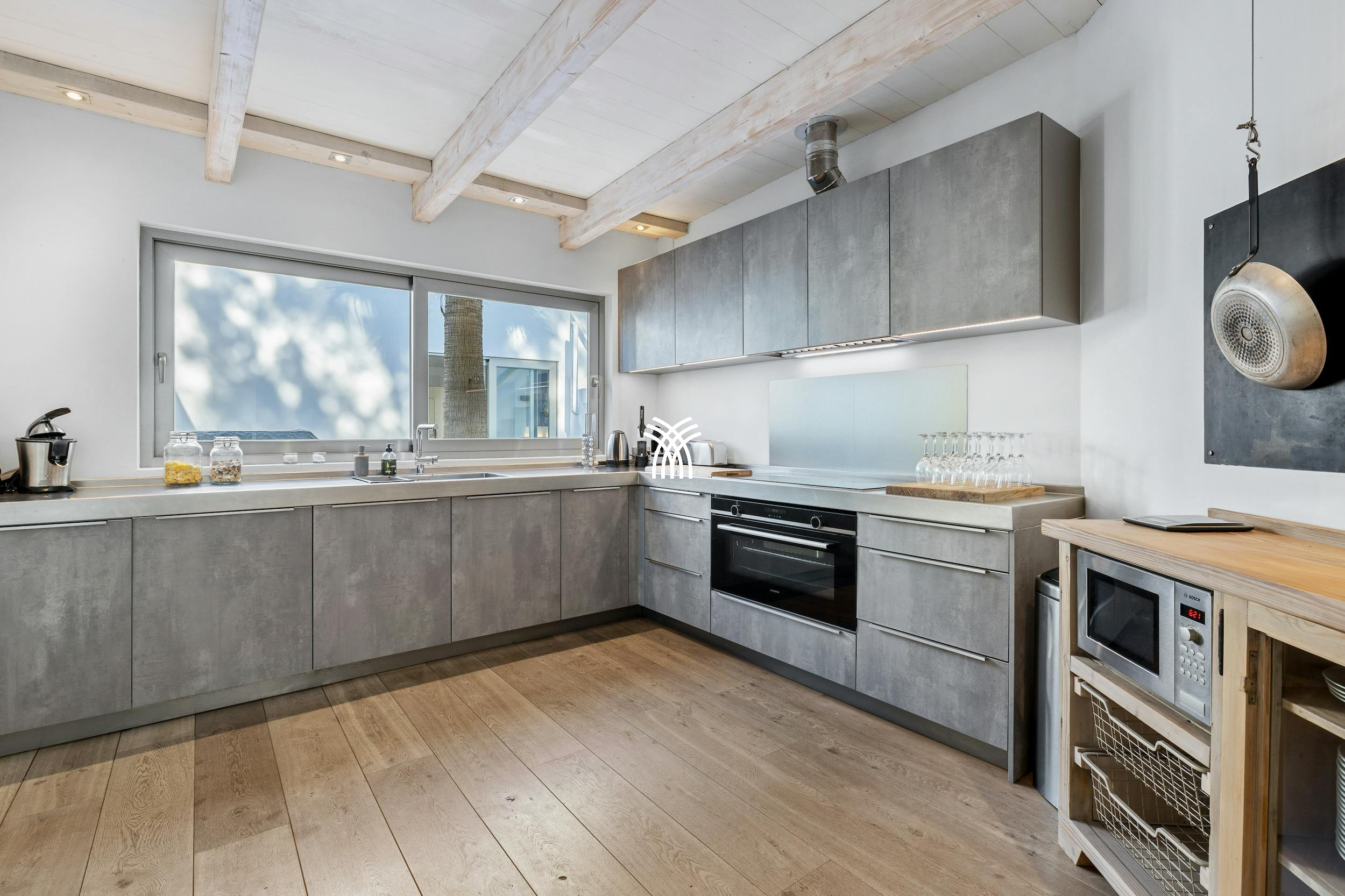 À l'intérieur, les intérieurs de la villa combinent un style côtier contemporain avec des finitions de luxe. Des bois aux tons clairs, des linges doux et des touches d'acier inoxydable élégantes créent une atmosphère calme et élégante. La disposition en plan ouvert relie une cuisine de qualité professionnelle à l'espace de salle à manger intérieur, favorisant un espace convivial pour socialiser et partager des repas.