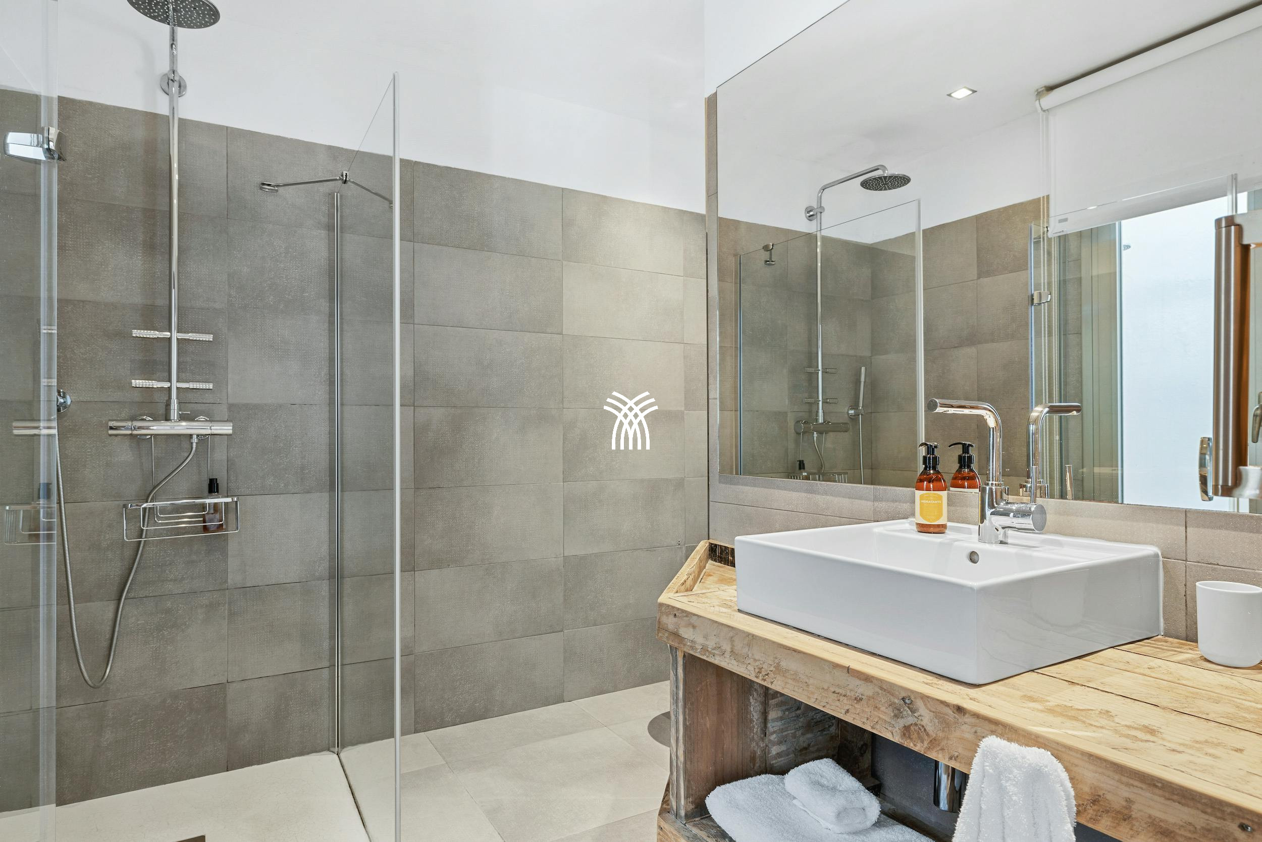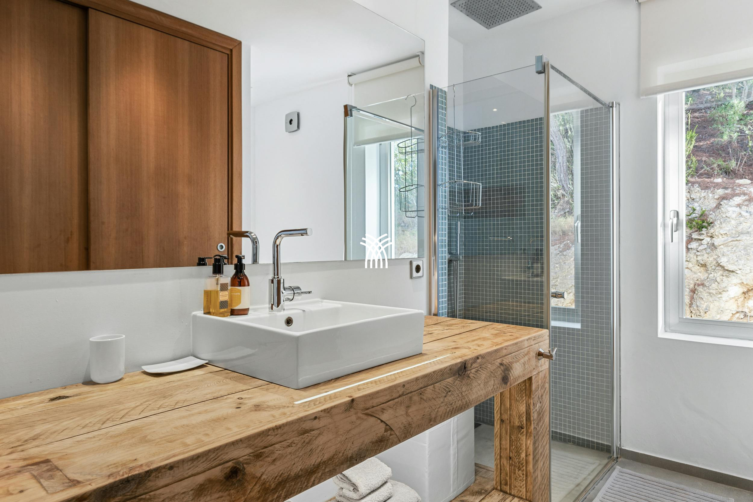 À l'étage, un atrium unique au sol vitré avec des sièges s'ouvre sur une terrasse supérieure sereine avec des transats, un endroit parfait pour savourer la vue et embrasser le calme de votre environnement. La disposition polyvalente de la villa comprend un appartement indépendant avec une petite cuisine, un salon, un lit double convertible et une salle de bain élégante, offrant de l'intimité pour les invités ou le personnel. Trois chambres doubles, chacune avec une salle de bain élégante, peuvent être aménagées en lits jumeaux, tandis que la suite principale spacieuse dispose d'une baignoire jacuzzi et d'une douche de salle de bain luxueuse.