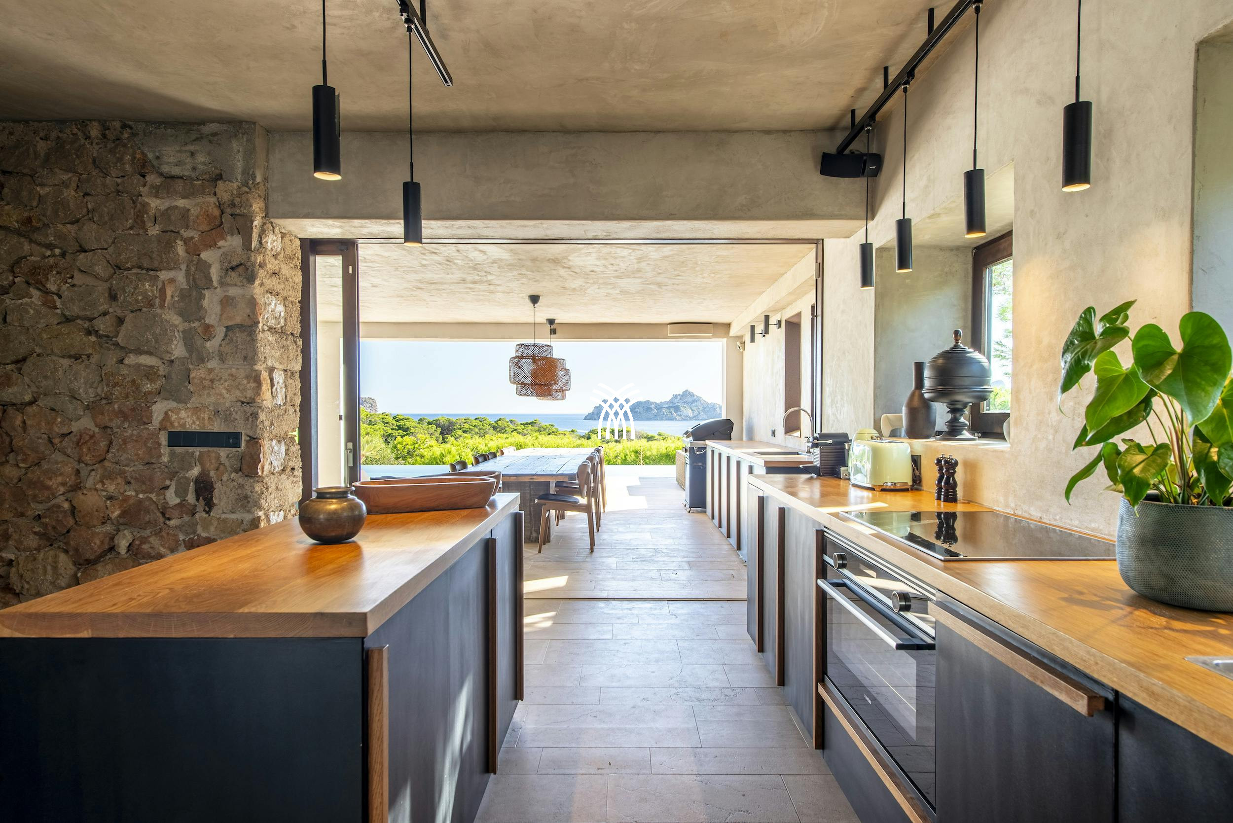 Conçue pour ceux qui apprécient la beauté, le confort et la tranquillité, cette villa élégante offre une disposition ouverte spacieuse avec une cuisine moderne entièrement équipée, comprenant un îlot élégant de 4 mètres et une salle à manger pour dix personnes. L'ample espace de vie s'étend harmonieusement à travers des portes coulissantes vitrées vers les terrasses ensoleillées et la terrasse de la piscine, offrant une vue imprenable et ininterrompue sur la mer Méditerranée.