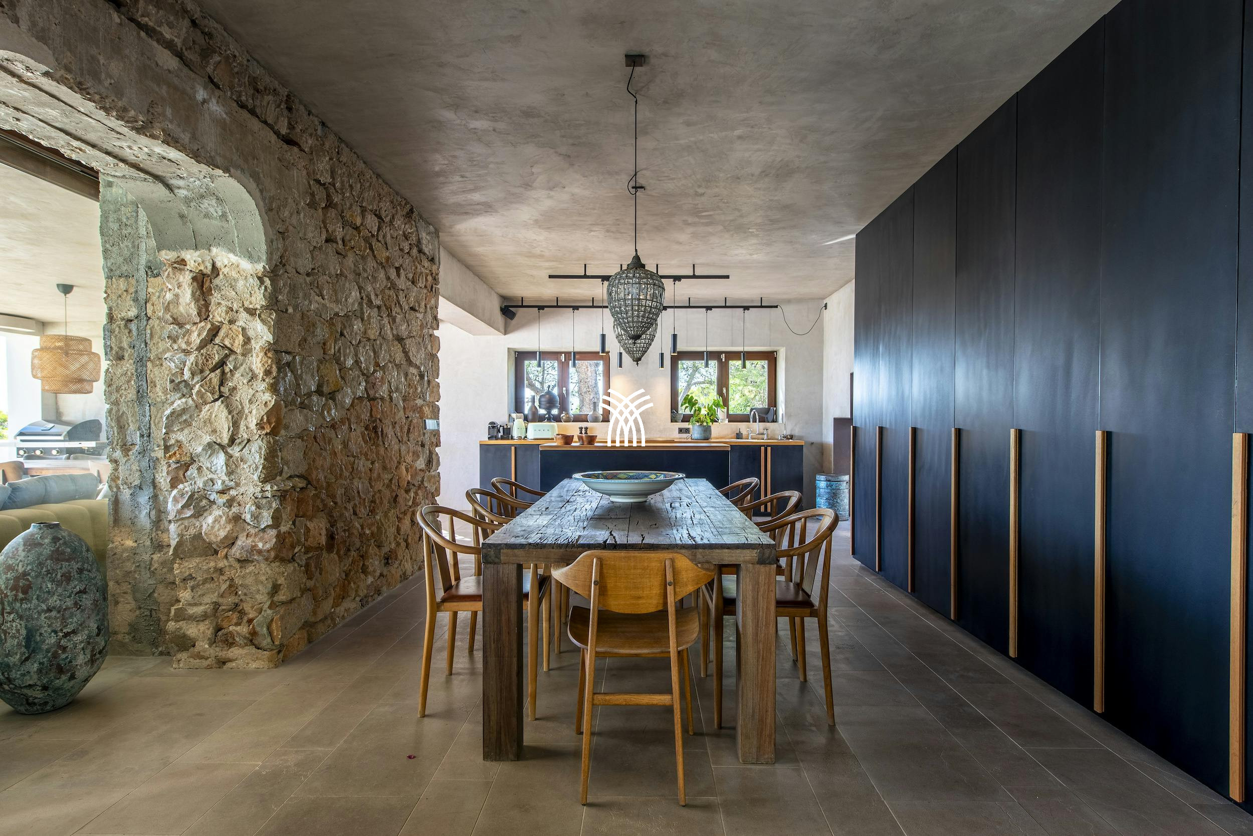 À l'intérieur, les espaces lumineux et aérés de la villa sont soigneusement décorés avec des tons de vert de mer doux et une esthétique moderne raffinée. L'espace de vie spacieux dispose de sièges de salon confortables sous un plafond à double hauteur, et l'élégant espace à manger pour dix personnes s'ouvre sur des vues de la piscine et de la mer. La cuisine entièrement équipée garantit tout ce dont vous avez besoin pour un séjour sans faille et confortable.