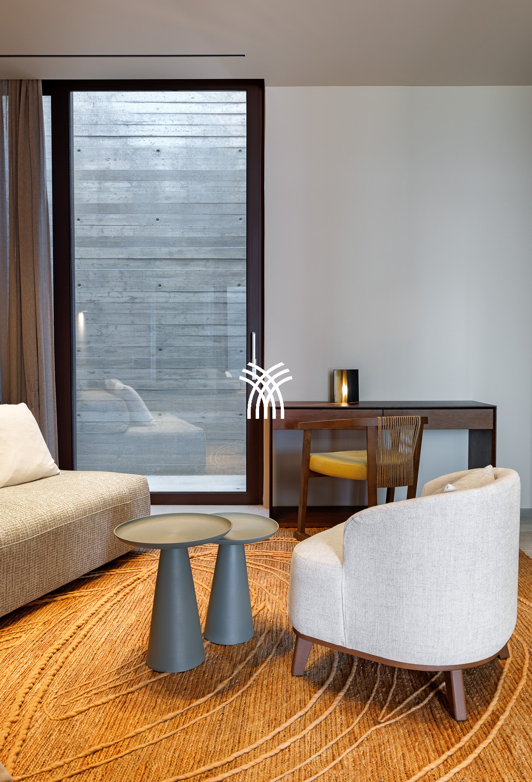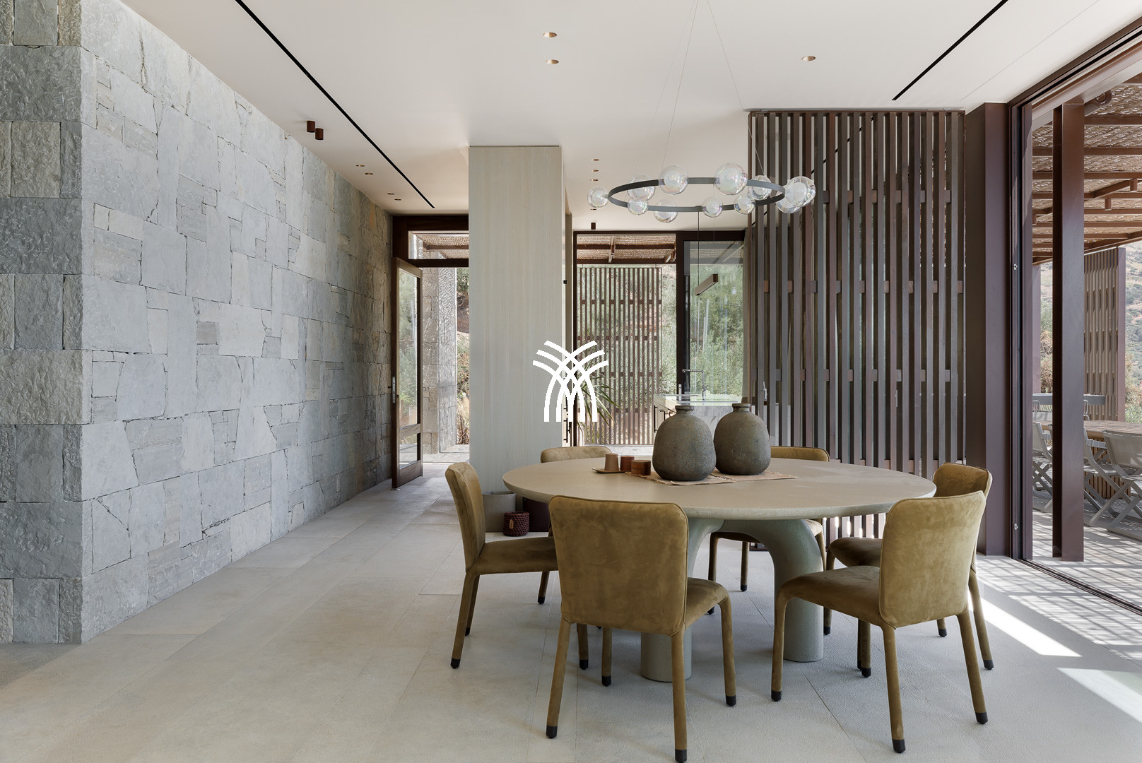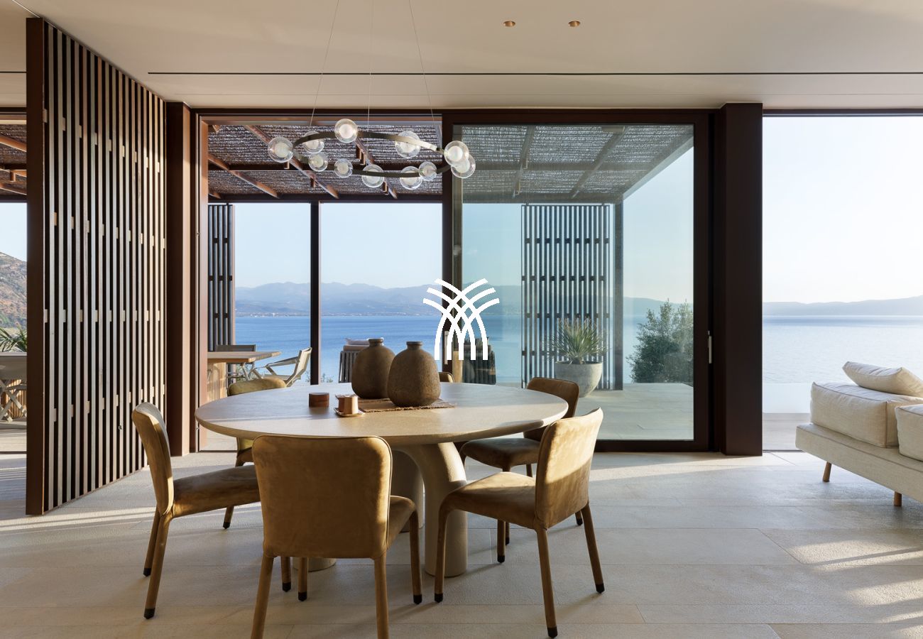 Les espaces intérieurs de la villa sont tout aussi impressionnants. La cuisine entièrement équipée invite les hôtes à savourer des saveurs locales, parfaites pour des repas conviviaux dans la salle à manger élégante ou dans la cuisine et le bar extérieurs. Les espaces de vie extérieurs, ombragés par des pergolas, comprennent une grande table en bois naturel pouvant accueillir jusqu’à 14 personnes et un coin petit-déjeuner confortable, idéal pour un café matinal ou un apéritif en soirée. Le salon intérieur, avec ses meubles élégants et ses sièges spacieux, offre un refuge confortable pour se détendre ou socialiser.