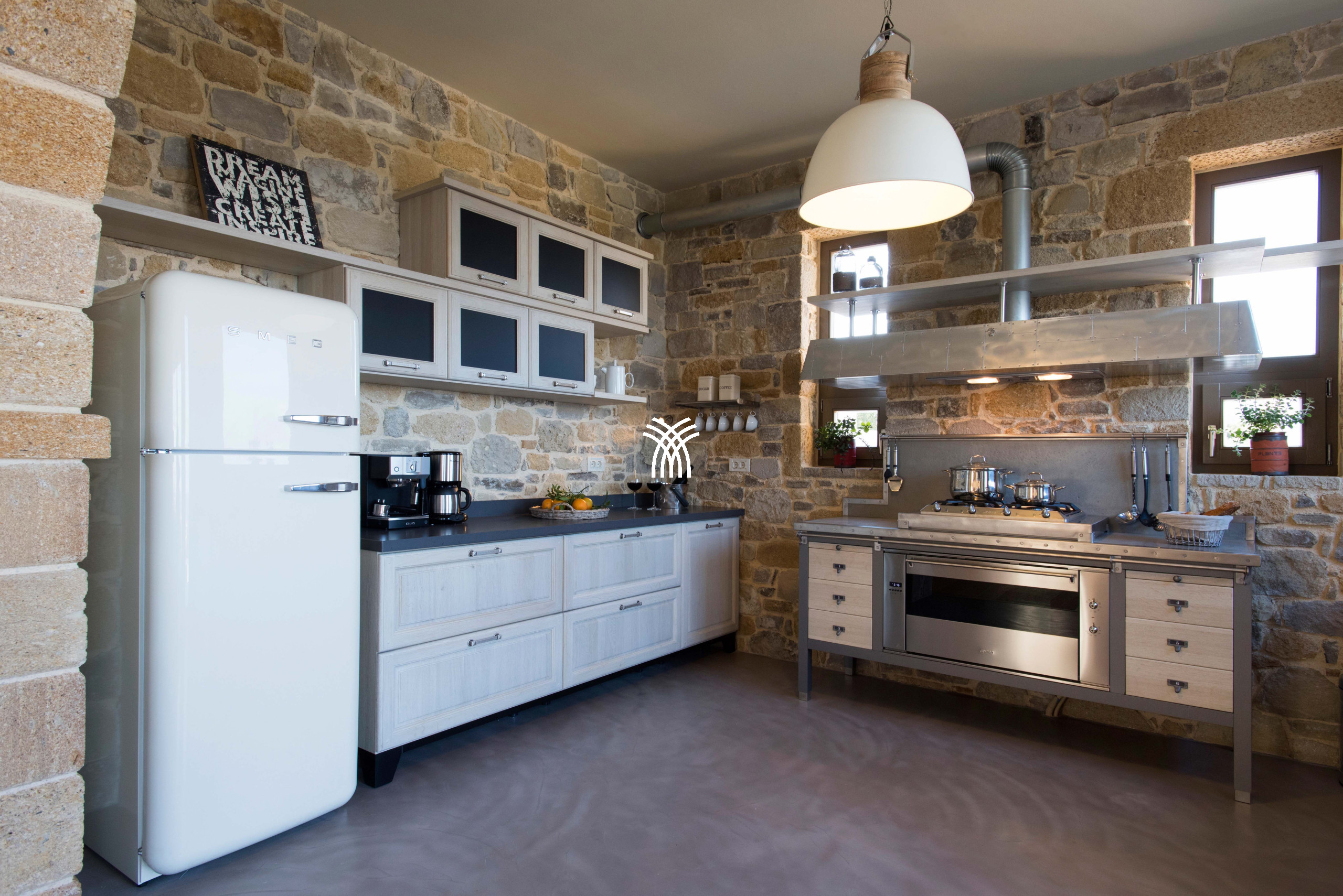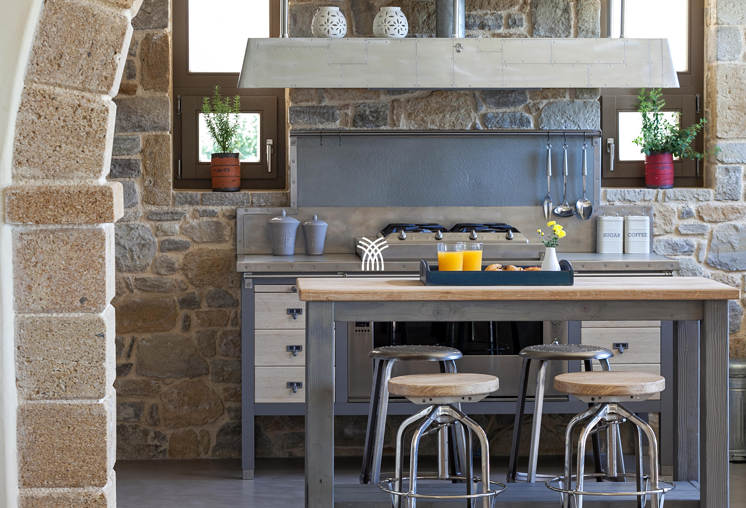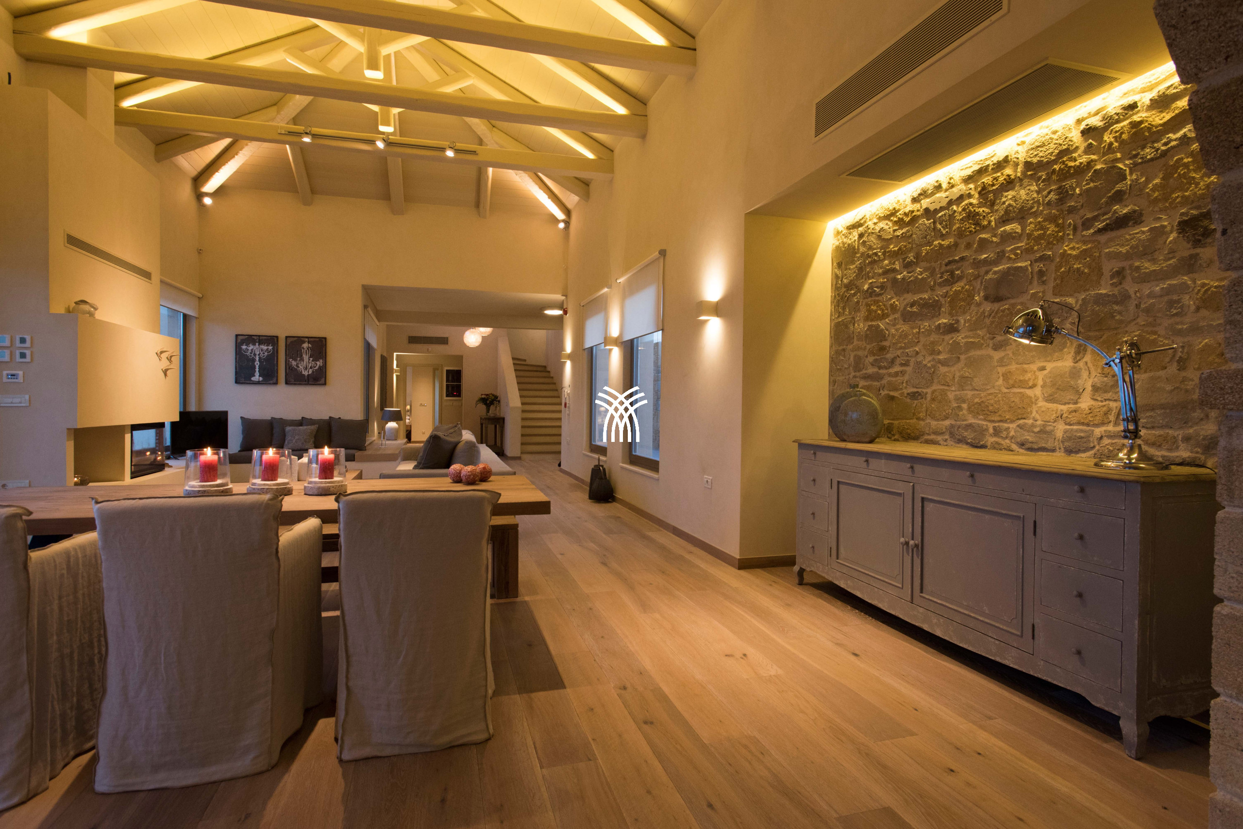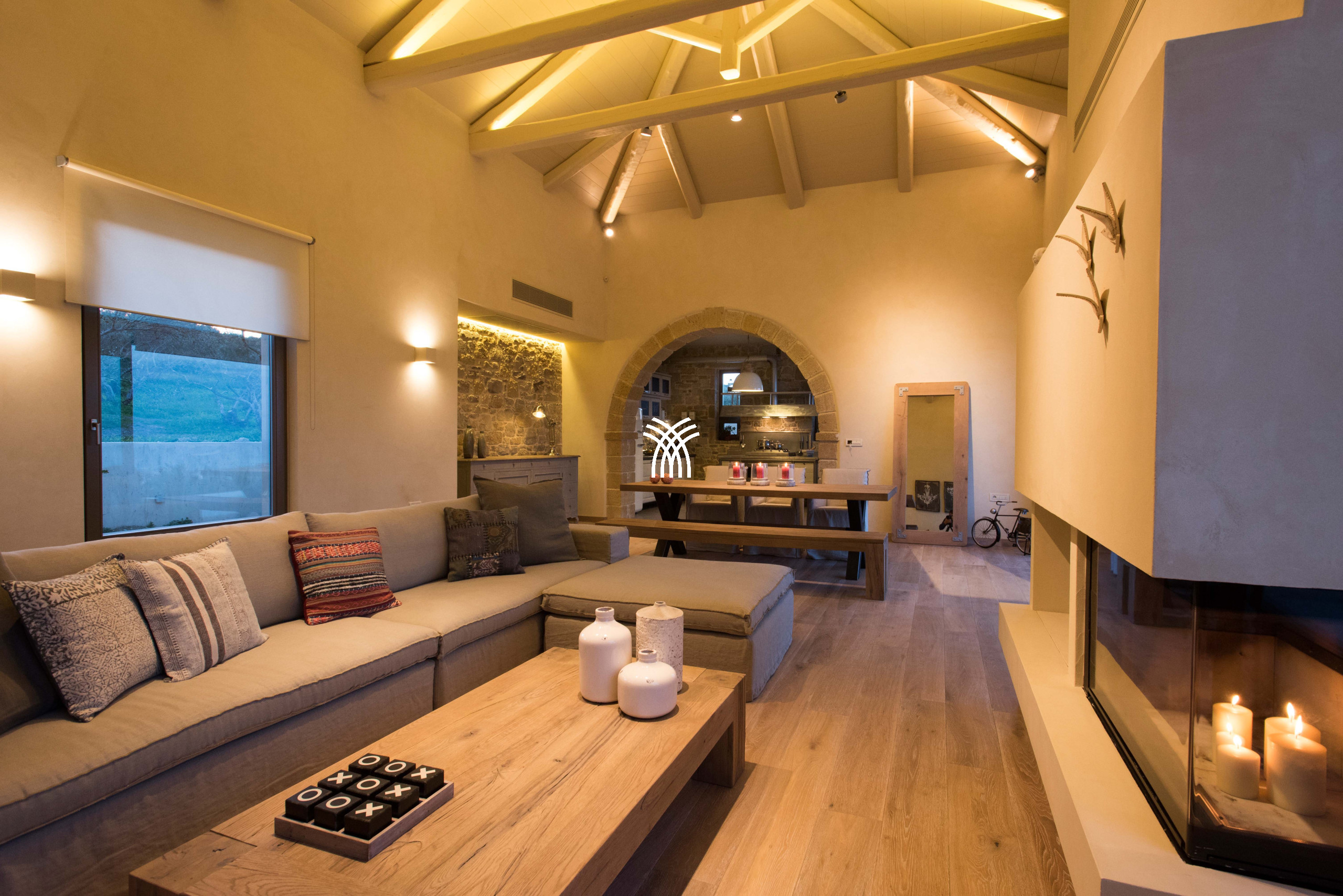 L’intérieur est aménagé avec une intelligence rare. Le séjour lumineux, composé de canapés profonds et enveloppants, s’organise autour d’une cheminée écologique, tandis qu’une grande table en bois fait face à la mer. La cuisine, signée Marchi, reprend les codes d’un design rétro revisité, à la fois audacieux, fonctionnel et chaleureux. Elle dialogue avec une salle à manger ponctuée d’une table en bois brut et de sièges confortables, invitant aux grands repas conviviaux qui font la réputation du mode de vie crétois.