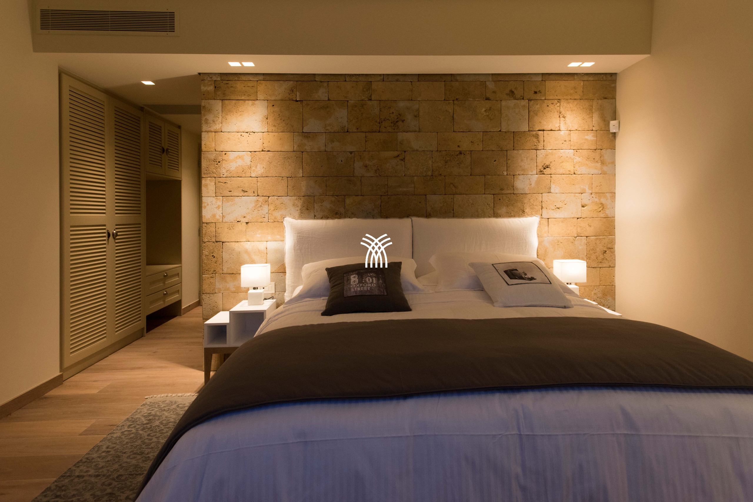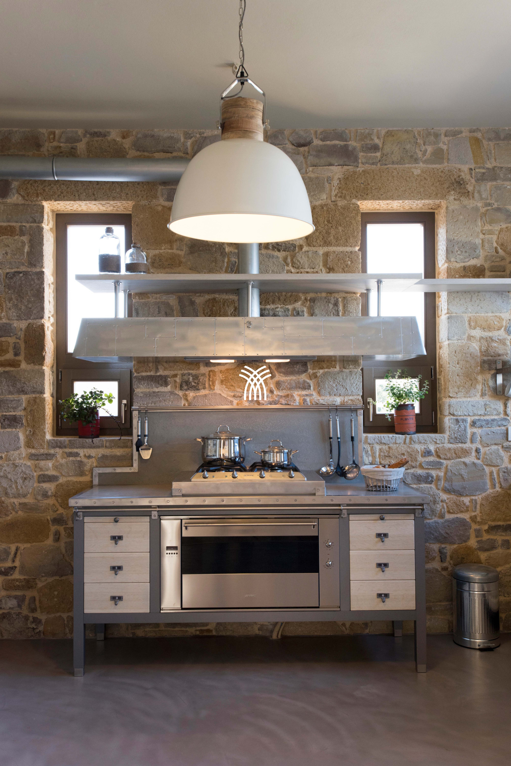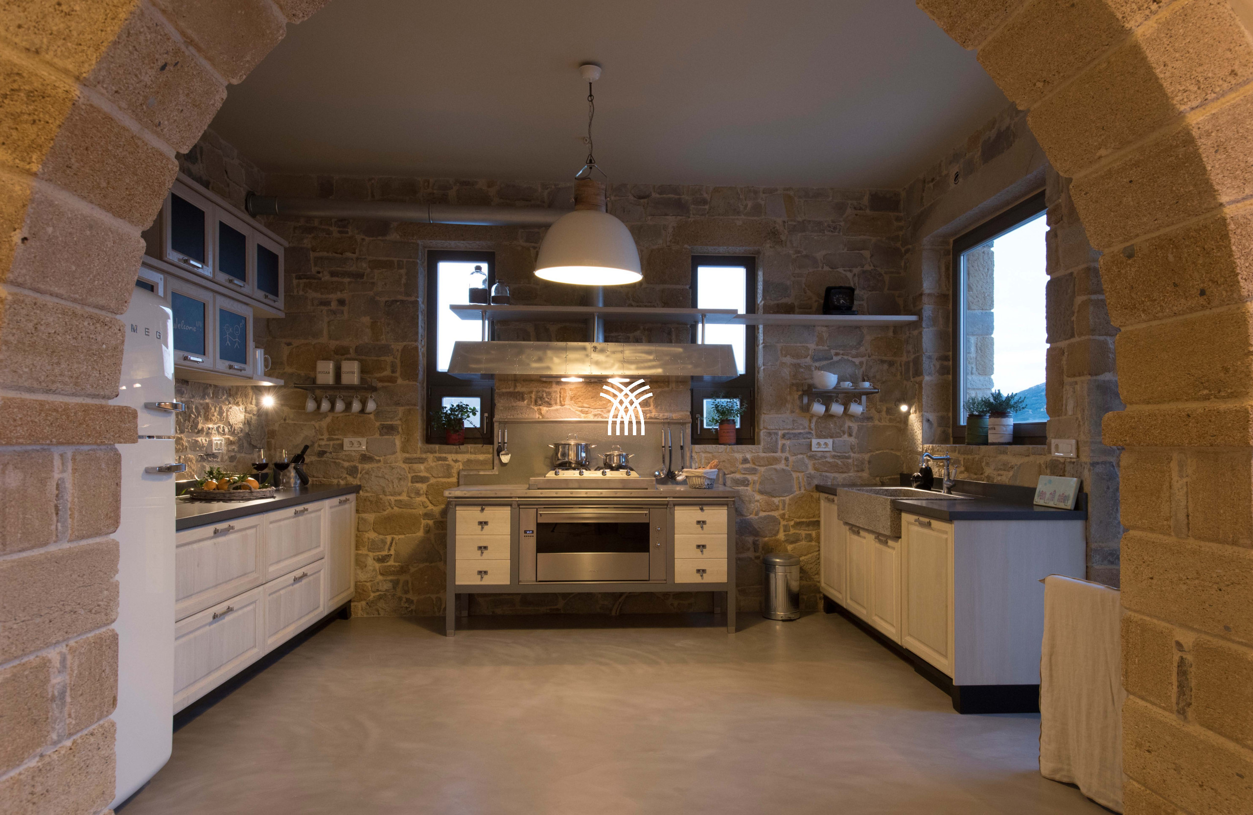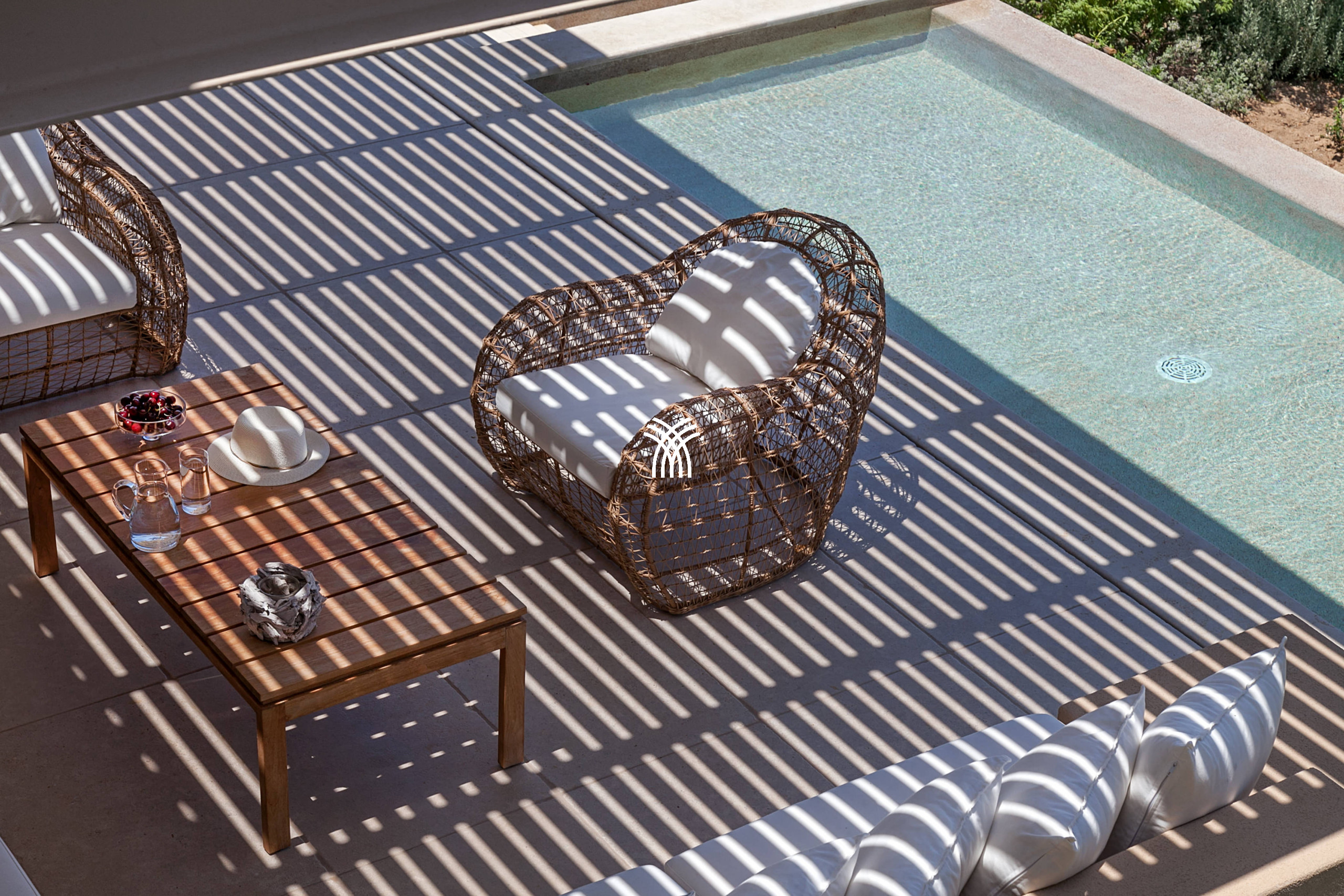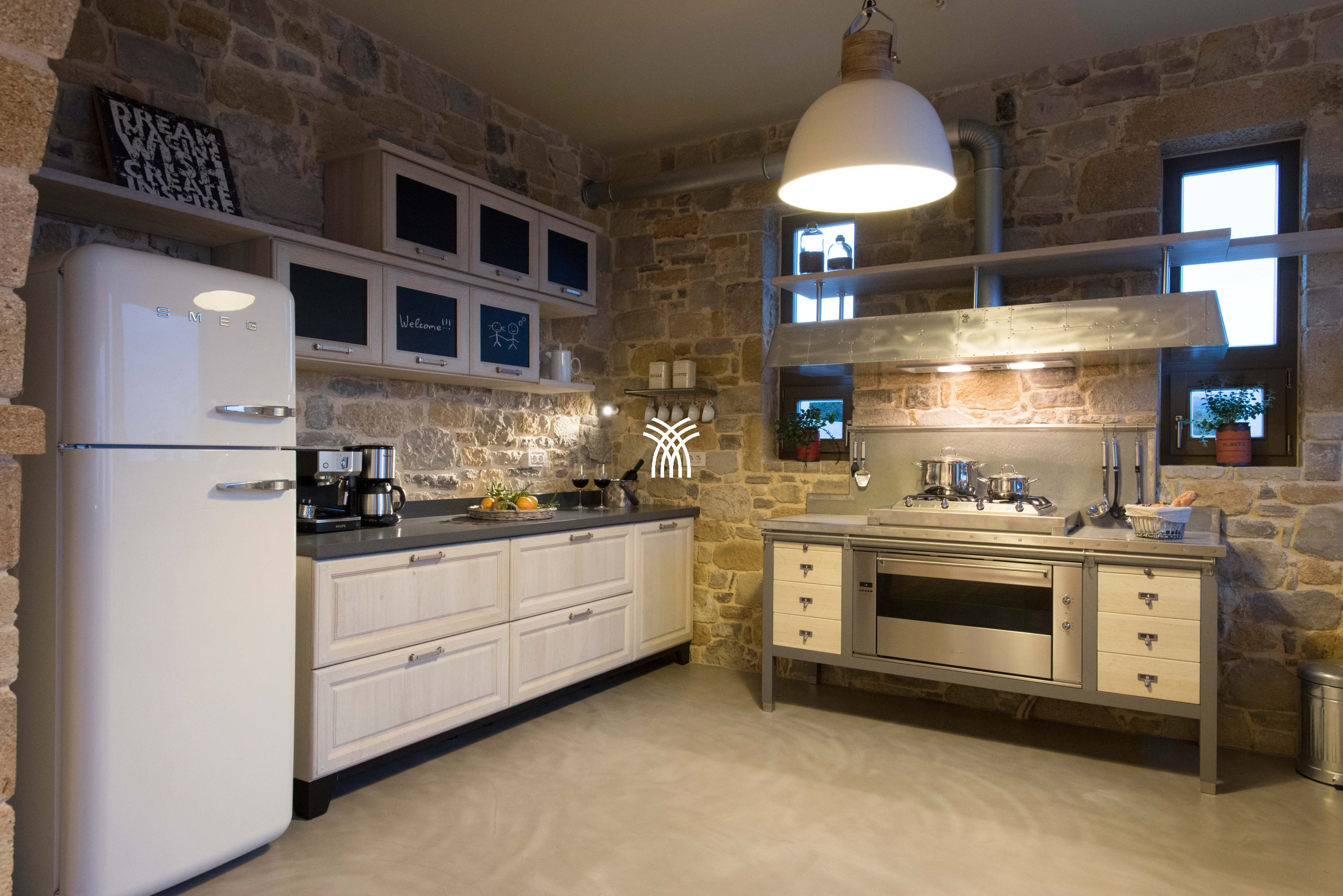 L’intérieur est aménagé avec une intelligence rare. Le séjour lumineux, composé de canapés profonds et enveloppants, s’organise autour d’une cheminée écologique, tandis qu’une grande table en bois fait face à la mer. La cuisine, signée Marchi, reprend les codes d’un design rétro revisité, à la fois audacieux, fonctionnel et chaleureux. Elle dialogue avec une salle à manger ponctuée d’une table en bois brut et de sièges confortables, invitant aux grands repas conviviaux qui font la réputation du mode de vie crétois.