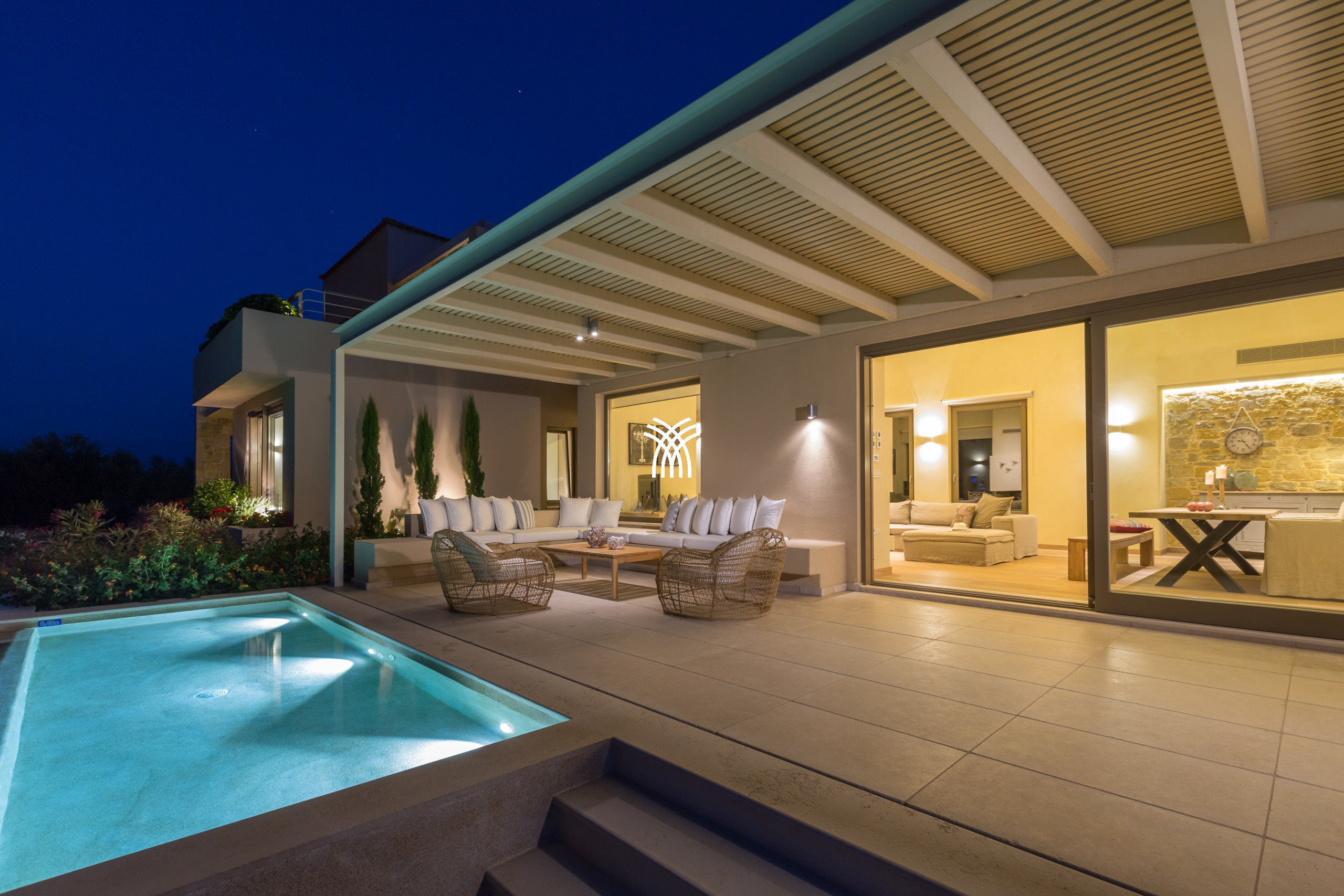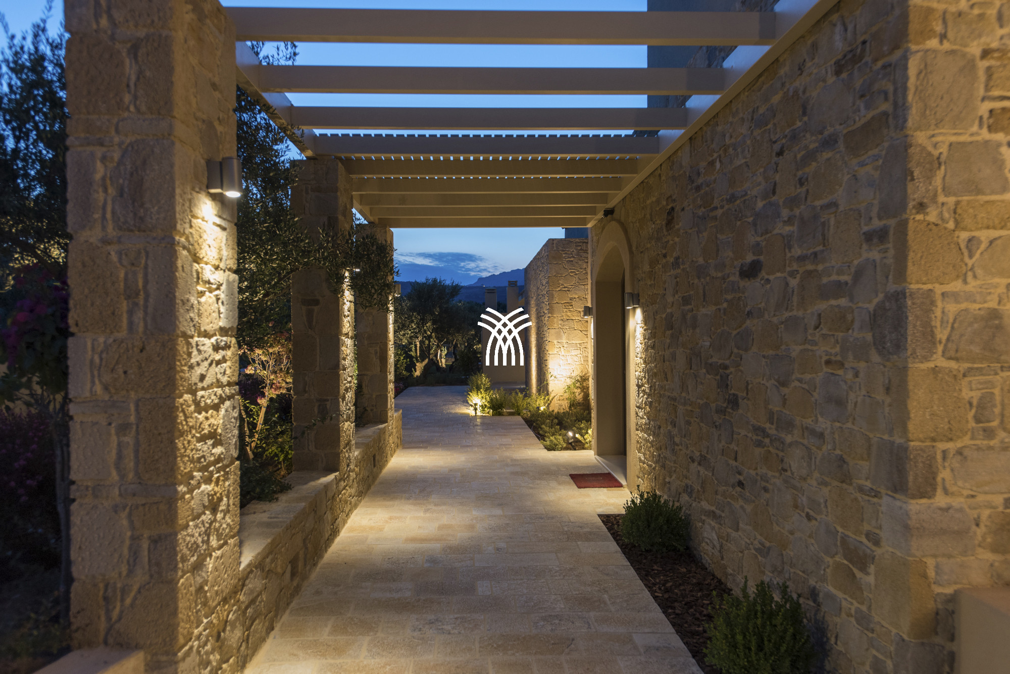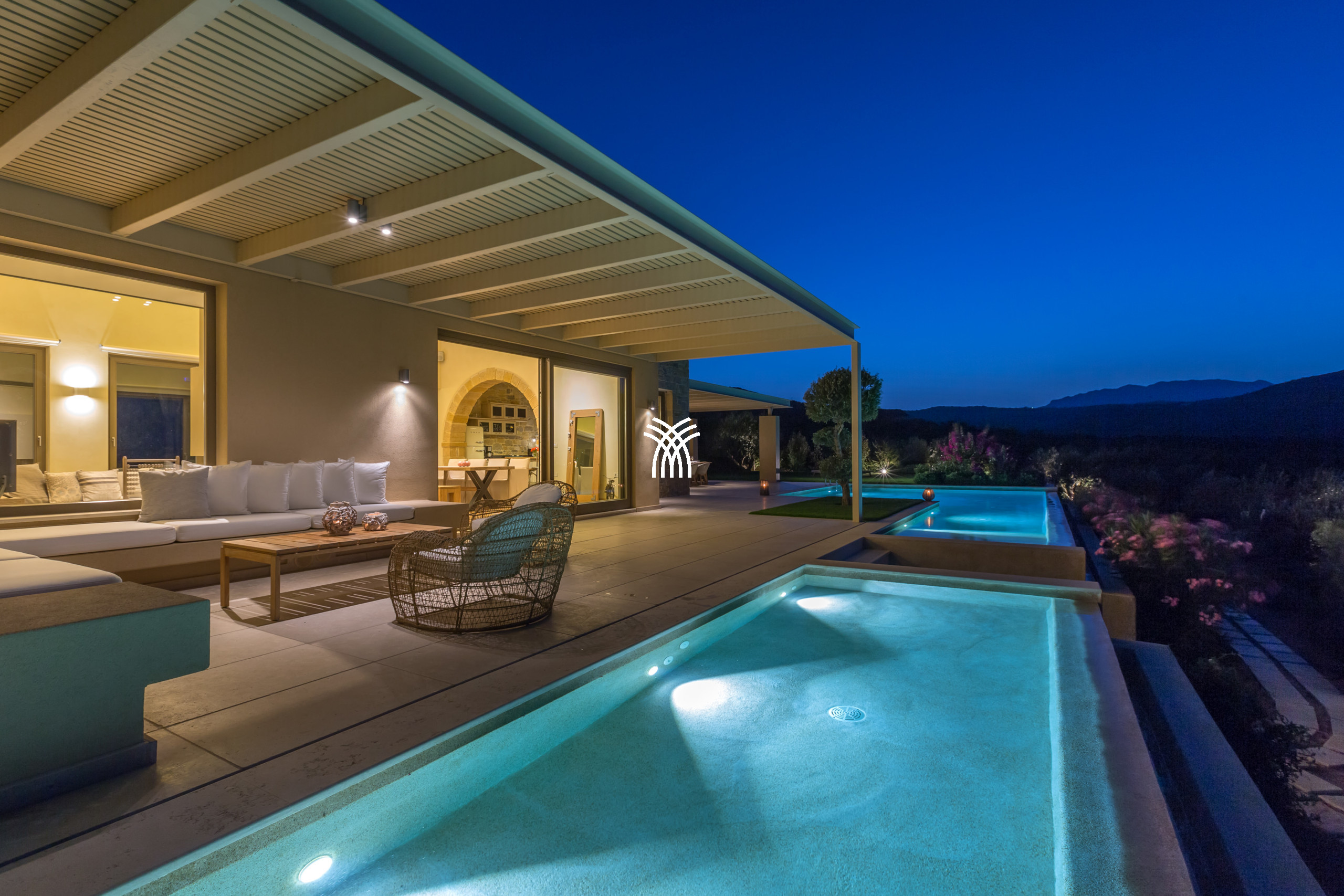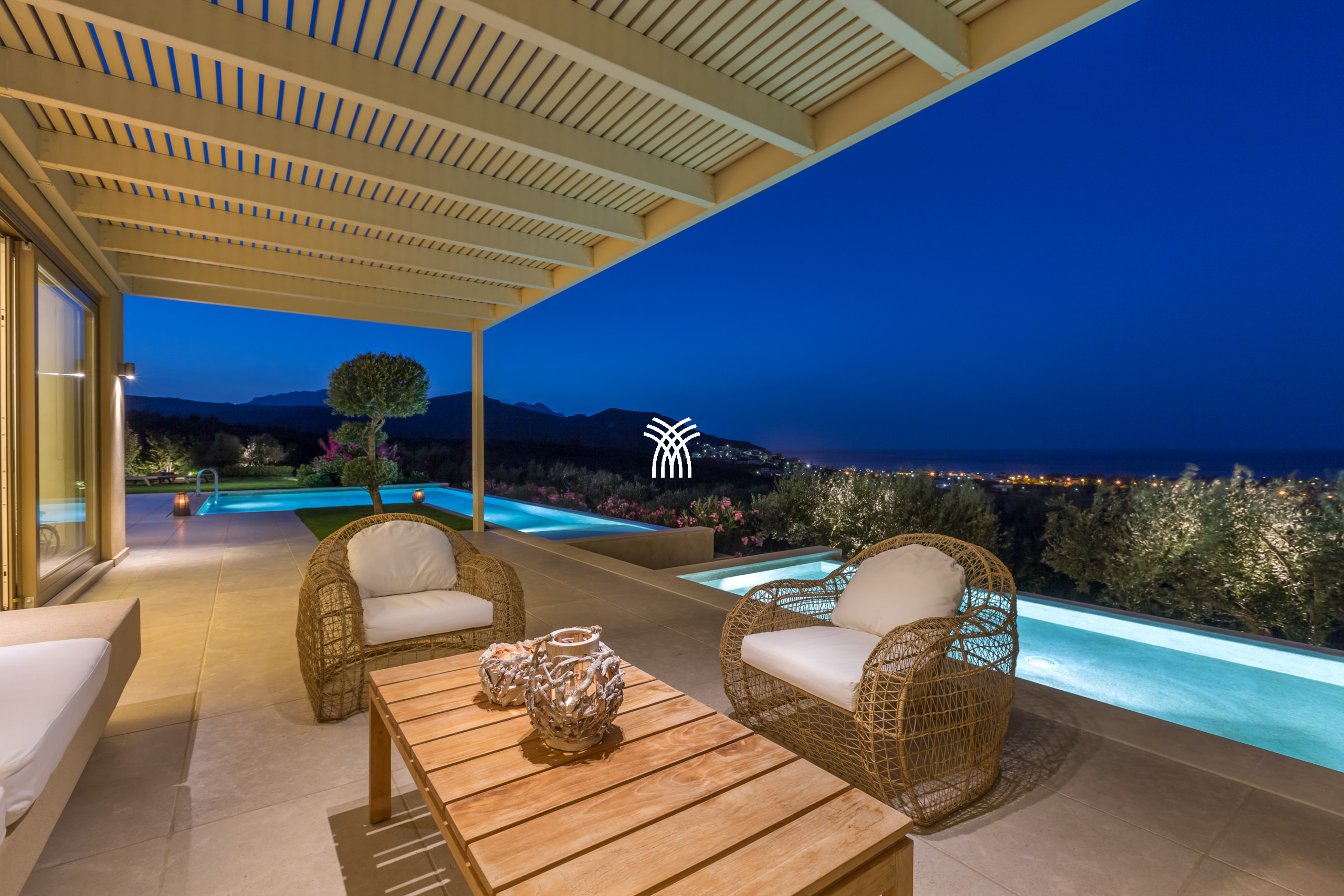 La Villa Ianara est une retraite d’exception posée sur un domaine de trois hectares, où la Crète se révèle dans toute sa splendeur. Pensée selon les principes de l’architecture bioclimatique, elle marie avec une grande finesse performance écologique, matériaux naturels et esthétique contemporaine. Les nuances d’ocre et de gris de la pierre locale dialoguent avec les larges poutres de bois, créant une atmosphère douce, organique, presque minérale. À l’intérieur, le mobilier mêle modernité et esprit vintage, avec des teintes terreuses et lumineuses qui enveloppent les espaces d’une sérénité rare. Les plafonds culminent à 4,5 mètres dans le séjour, accentuant une impression de volume et de liberté, tandis que les baies vitrées ouvrent la demeure sur des panoramas marins et montagneux à couper le souffle.