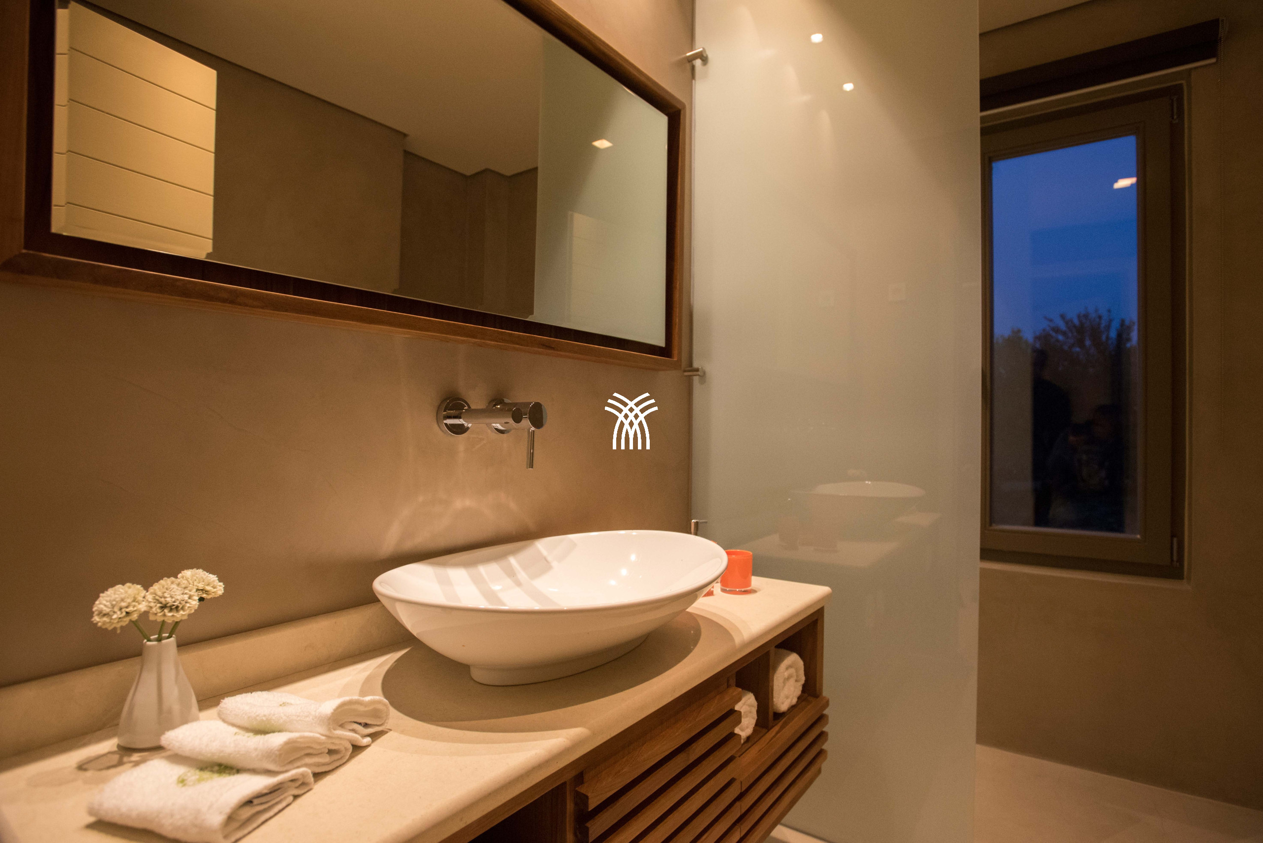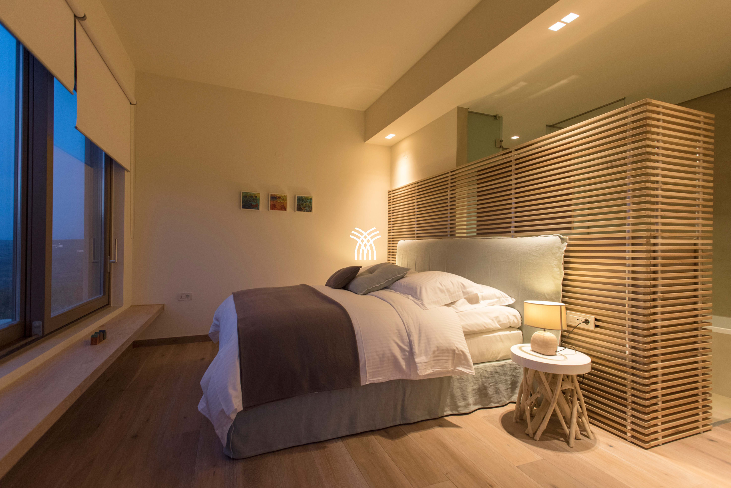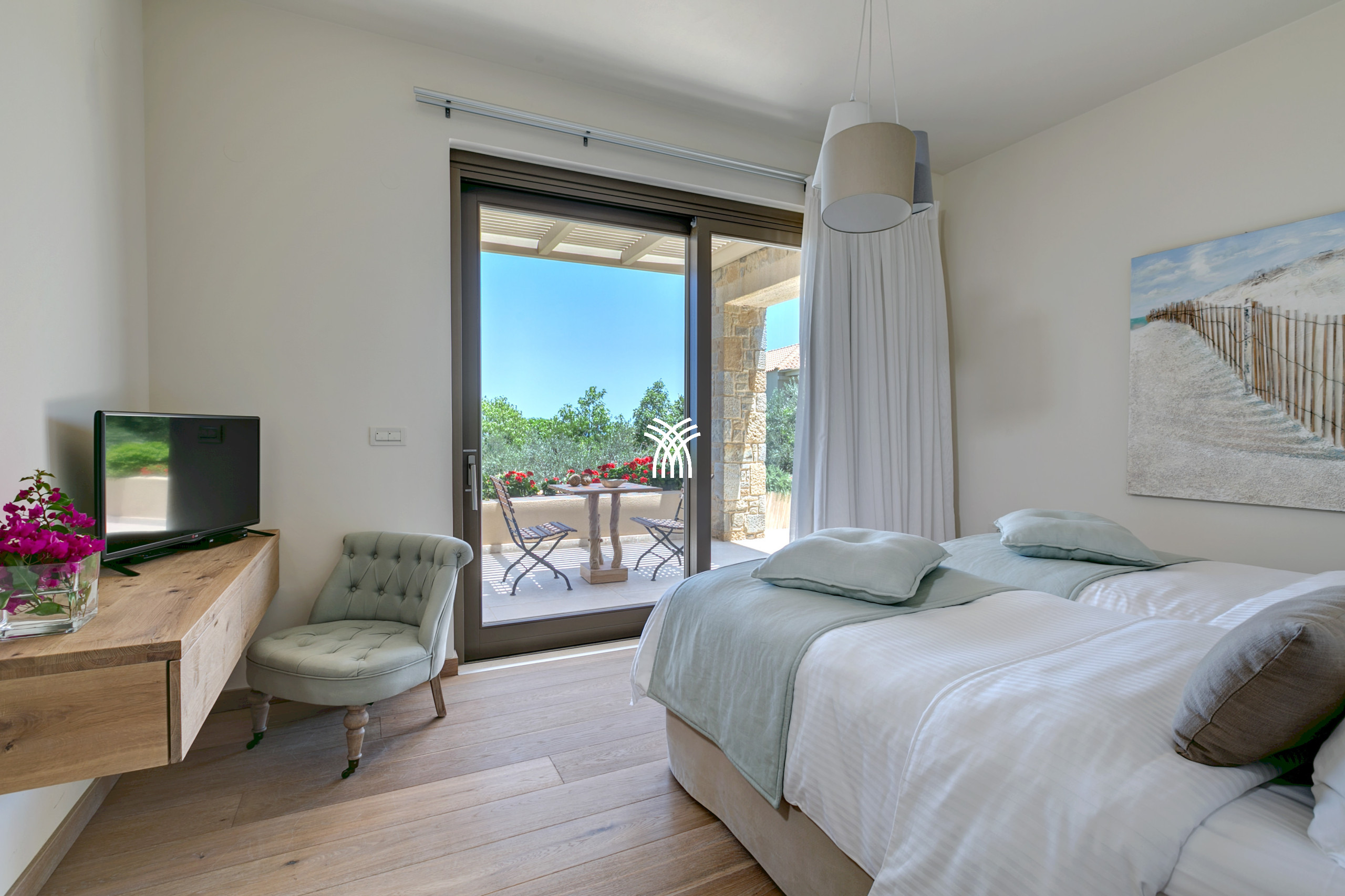 Les quatre chambres de la villa sont de véritables cocons, équipées de lits haut de gamme COCO-MAT, de linge en satin et lin, de coussins ajustables et de salles de bain en béton ciré, spacieuses et intuitives. Deux chambres occupent le rez-de-chaussée et s’ouvrent sur un patio ombragé idéal pour lire, méditer ou simplement contempler le paysage. À l’étage, la suite principale dispose d’un balcon meublé offrant une vue apaisante sur la mer et les collines. Une quatrième chambre, située au niveau inférieur, bénéficie d’un accès direct à un espace extérieur intime, bordé d’arbres et de fleurs.