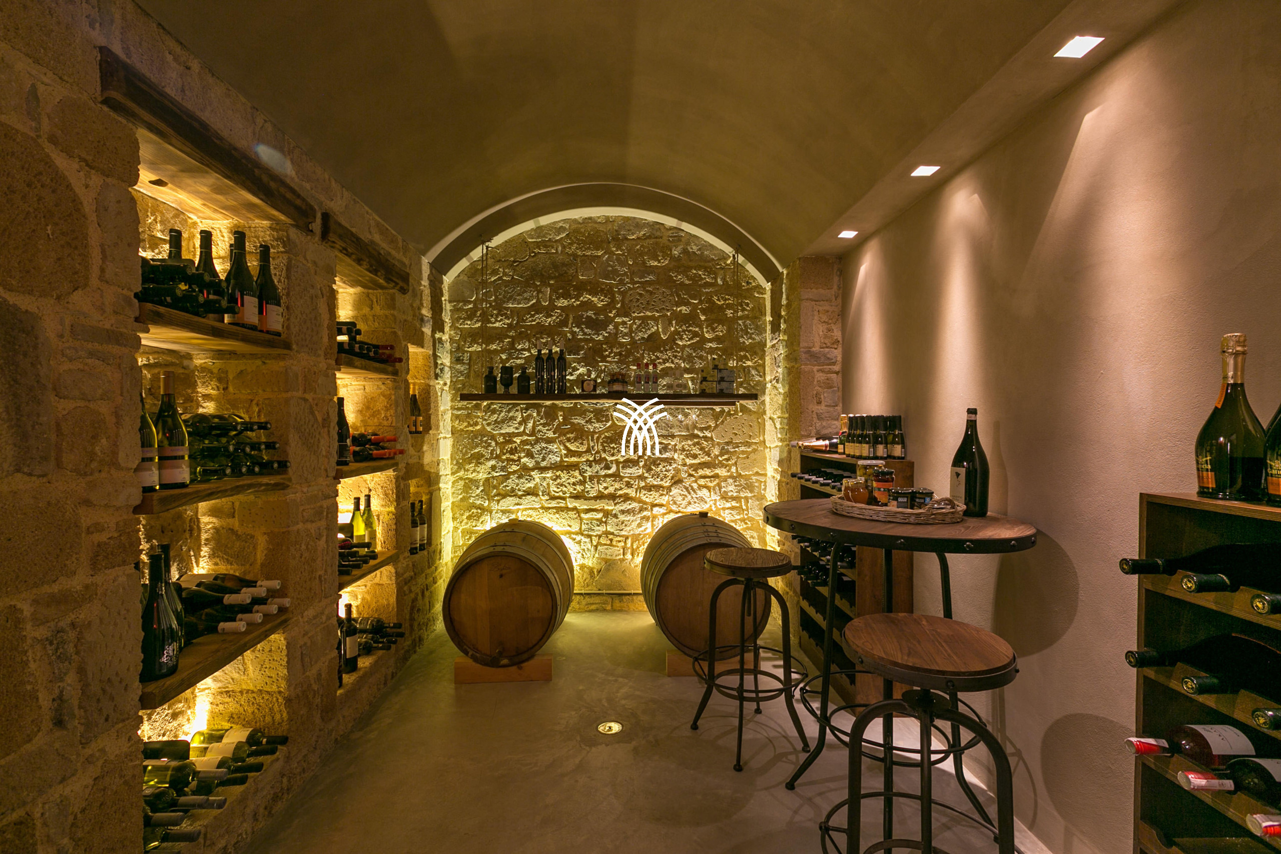 Le niveau inférieur regorge de trésors : un cellier voûté abrite les vins produits par les propriétaires ainsi qu’une sélection de grands crus grecs. Une salle de sport lumineuse permet de s’entraîner face à la nature, tandis que des pièces utilitaires parfaitement organisées facilitent la vie quotidienne.