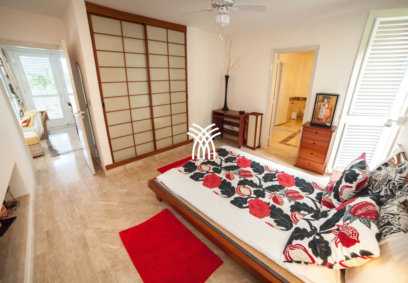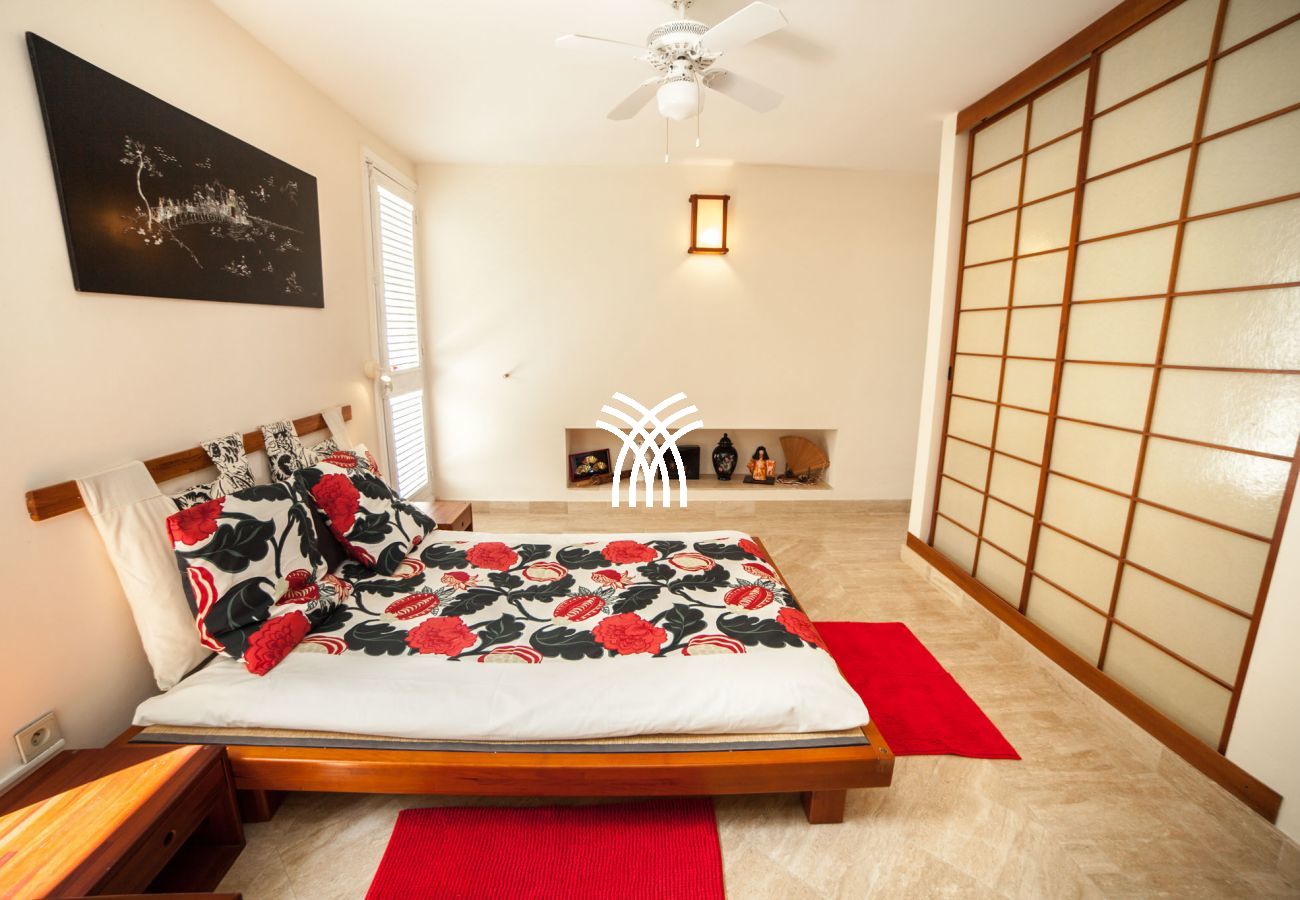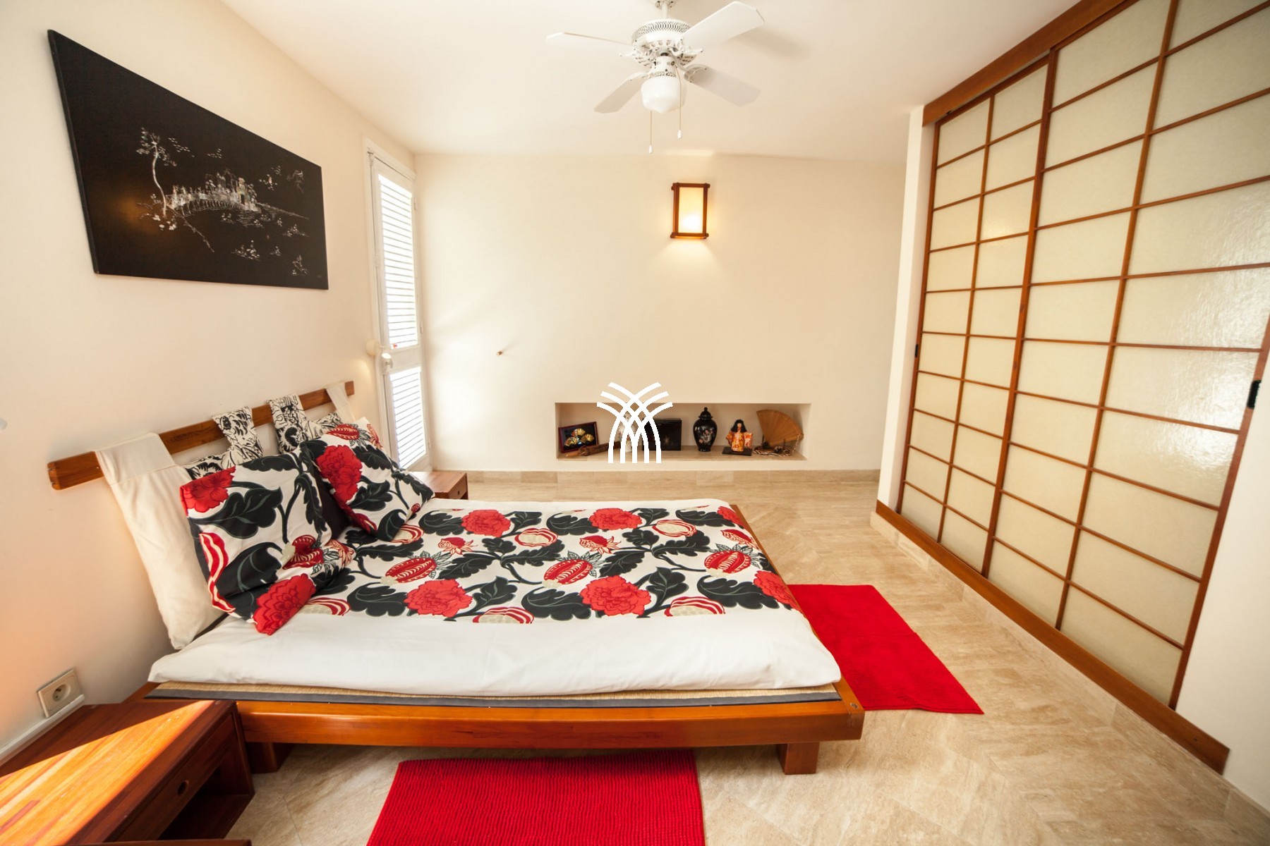 La chambre principale, située au premier étage, est très grande avec une terrasse et vue sur la mer, dressing et salle de bains. Les 3 autres chambres ont une décoration japonaise, brésilienne et tropicale.