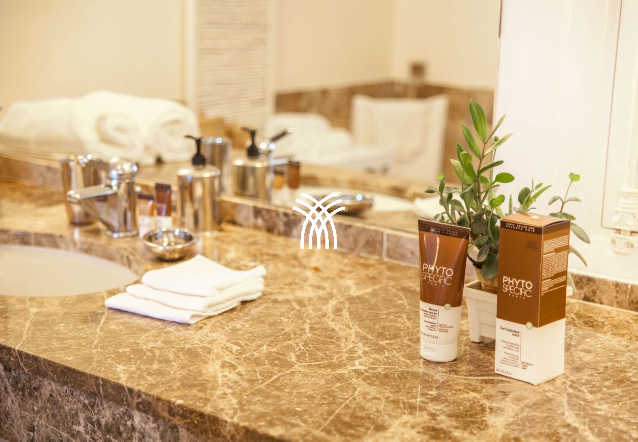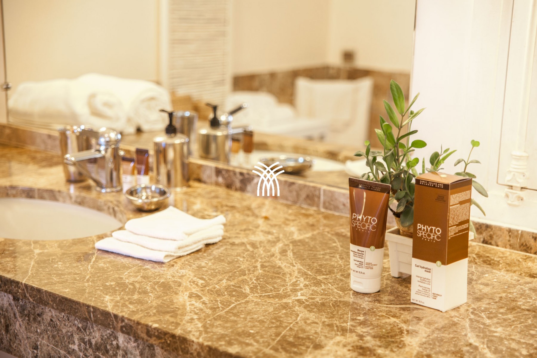 Lit king size (200 x 200 cm), dressing, salle de bain avec douche, double vasque, WC et bidet, terrasse avec une table et 2 chaises.