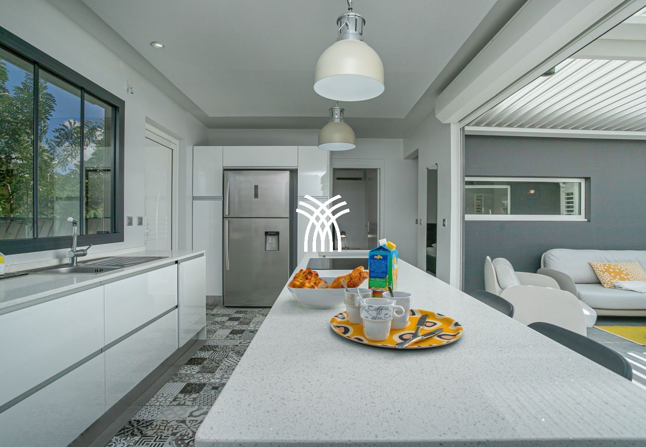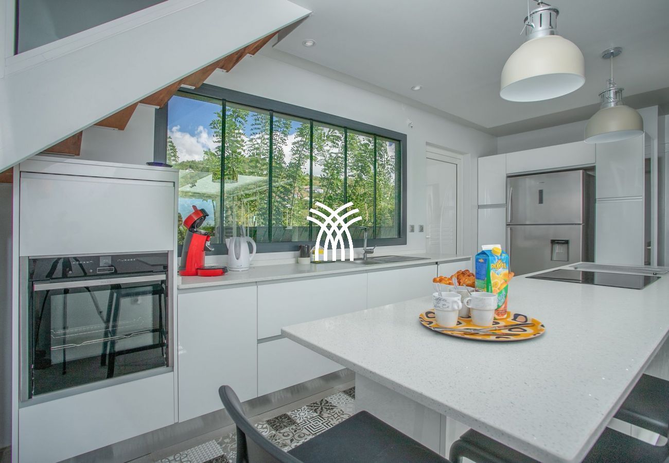 La Villa Bella incarne l’art de recevoir avec élégance. Sa cuisine équipée, au design moderne en blanc et gris, est un espace convivial où préparer des repas devient un plaisir partagé. Ouverte sur la terrasse, elle offre un aperçu de la mer, parfait pour savourer les saveurs locales dans un cadre enchanteur. Le salon, décoré dans un style contemporain, met en valeur la charpente traditionnelle aux poutres apparentes, rappelant l’authenticité créole de la villa. La salle à manger, installée sur la terrasse, crée une transition harmonieuse entre intérieur et extérieur, idéale pour profiter pleinement du climat tropical.