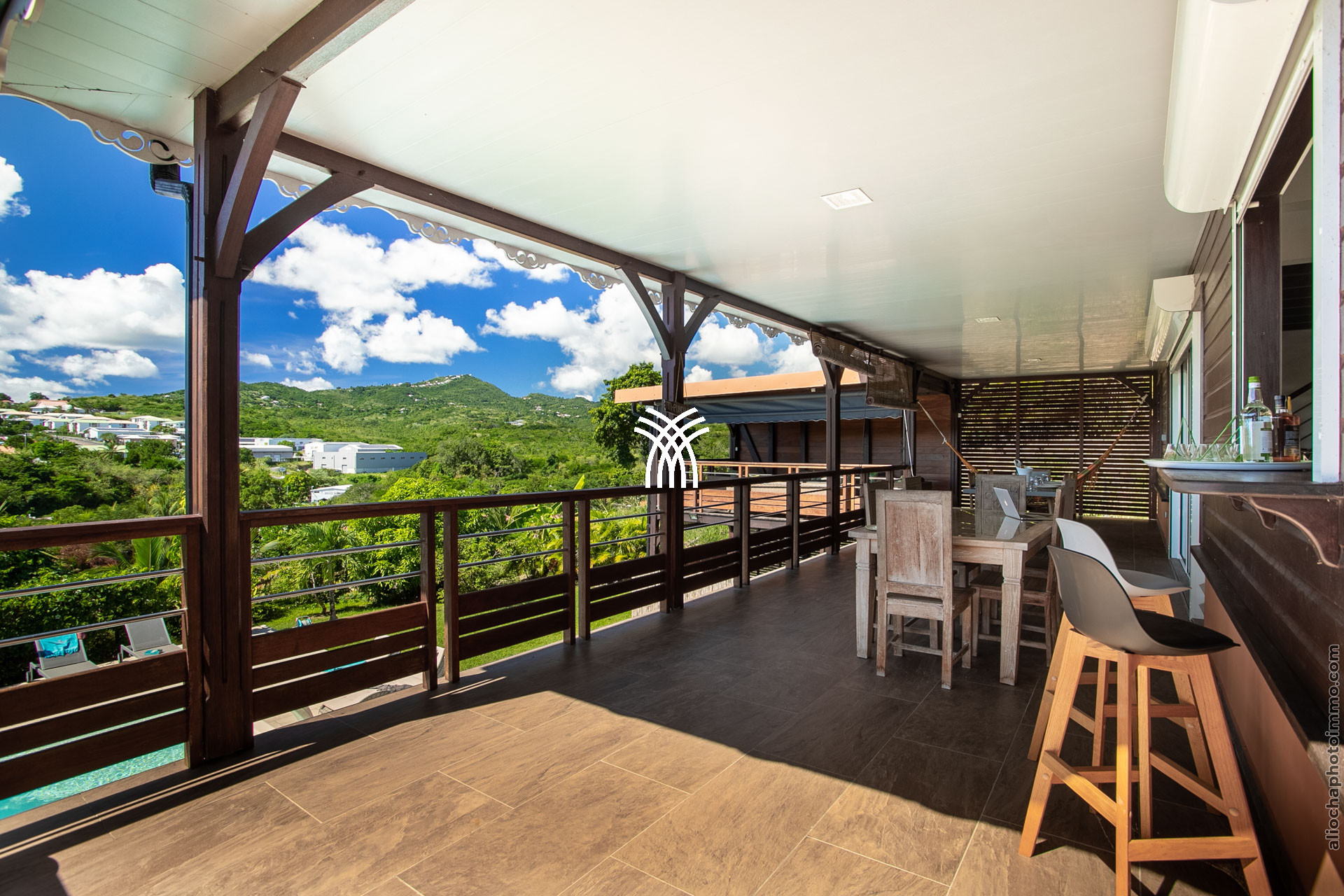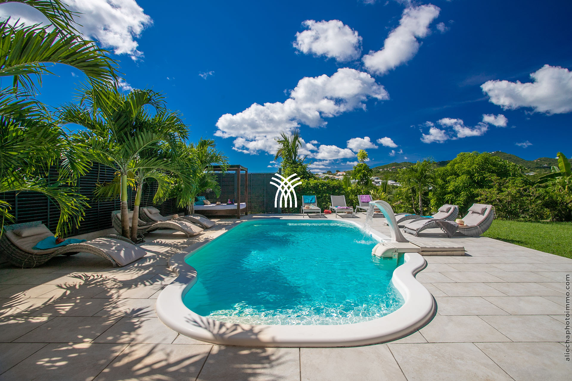 La terrasse de 60 m² de la villa est une véritable pièce à vivre, tantôt salon, tantôt salle à manger, où vous pourrez profiter de la douceur du climat tropical. Depuis la terrasse, admirez les camaïeux de vert de la végétation environnante, un cadre propice à la relaxation et à la rêverie. En contrebas, une piscine magnifiquement intégrée dans le jardin tropical à la détente. Avec ses transats et son lit de jour, cet espace est conçu pour que vous puissiez profiter pleinement de la nature environnante.