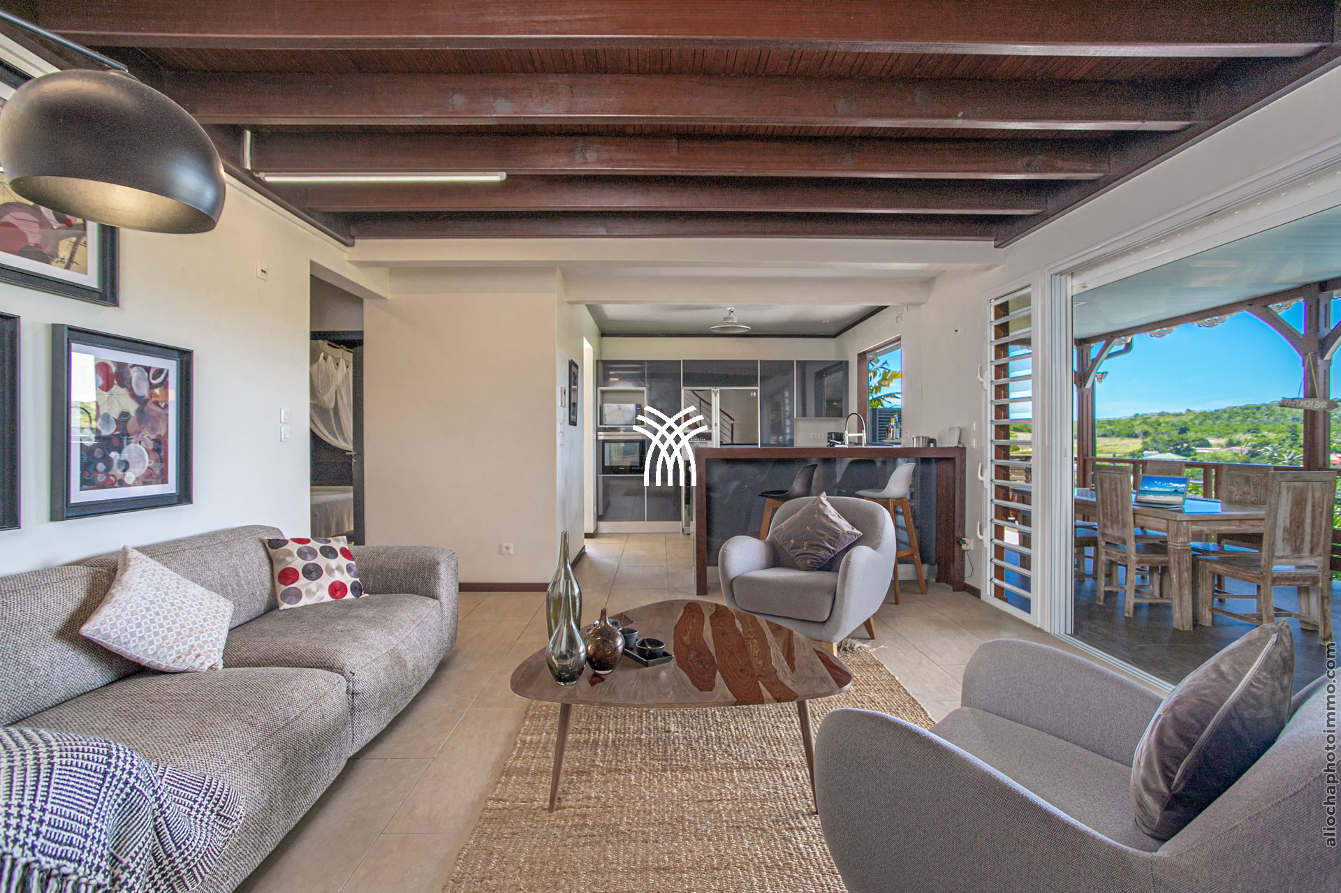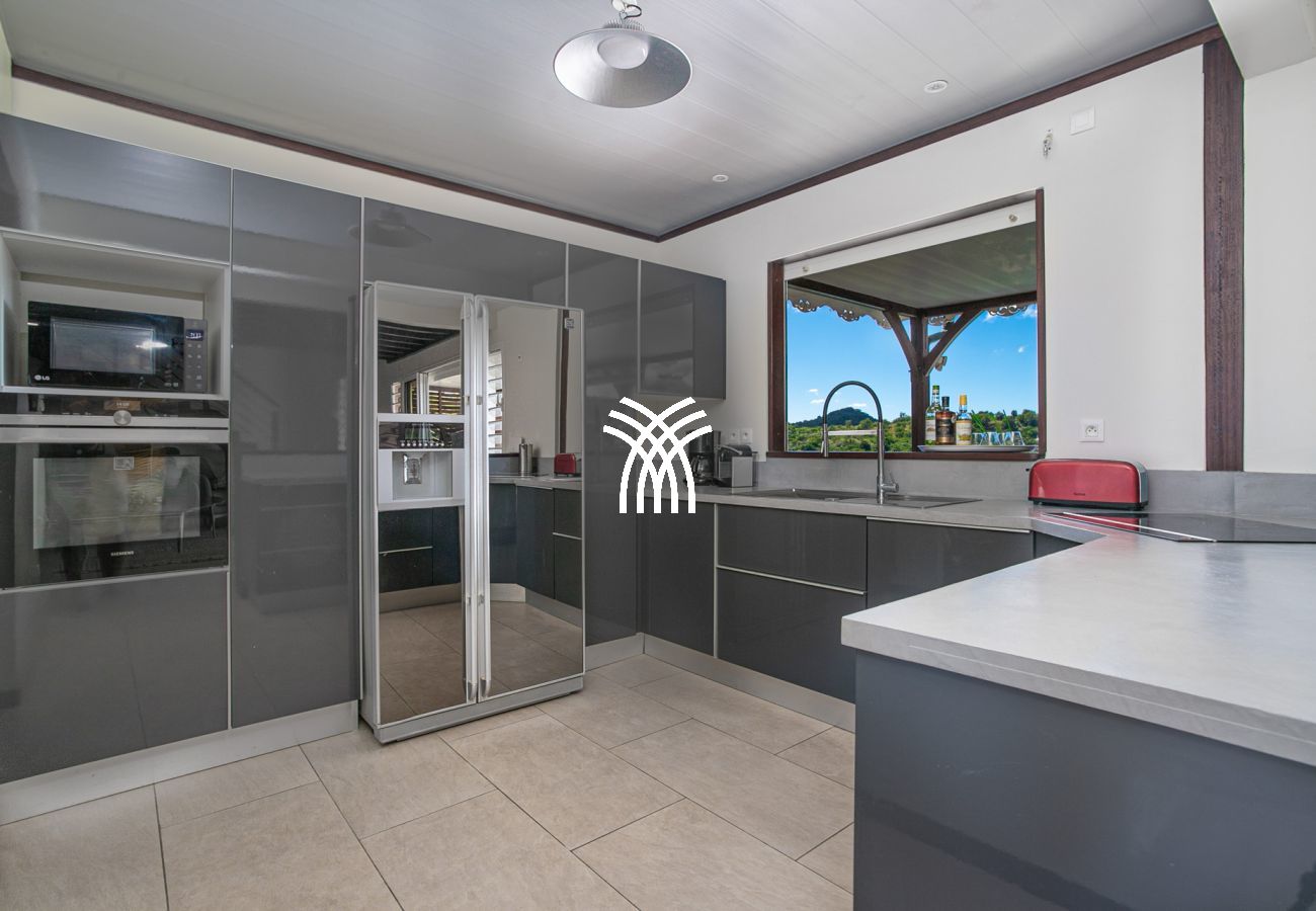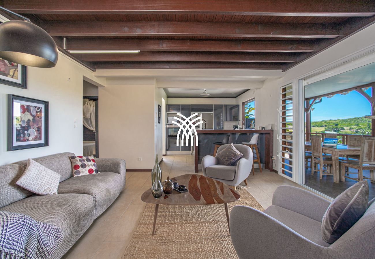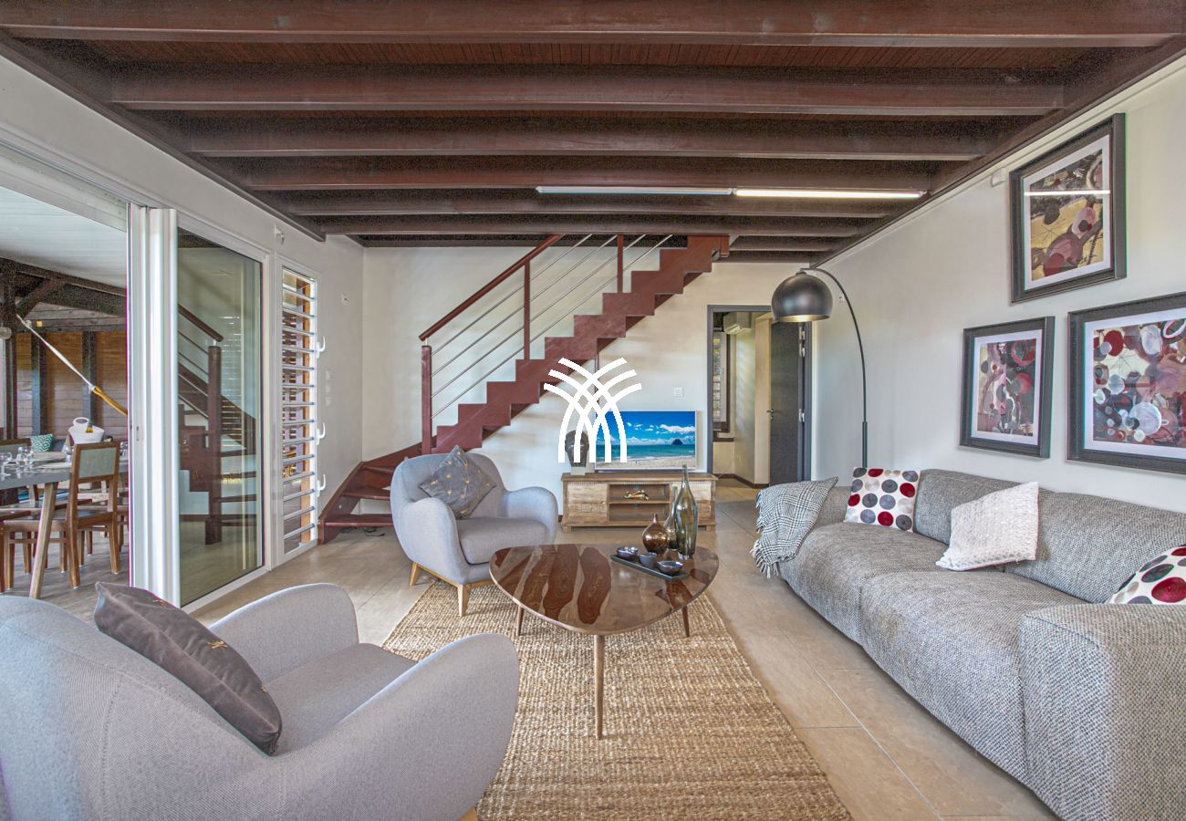 Le salon et la cuisine fusionnent pour créer un espace de vie convivial et ouvert sur l’extérieur. Cet espace vous permet de profiter d’une vue reposante sur le jardin tropical et sur le célèbre rocher du Diamant, également connu sous le nom de la "Femme Couchée". Côté salon, vous trouverez un canapé moelleux, des fauteuils confortables, un tapis en coco, une table basse en bois et une télévision, créant un lieu propice à la détente. La cuisine moderne est entièrement équipée pour répondre à tous vos besoins culinaires, avec un bar et des tabourets pour des moments conviviaux.