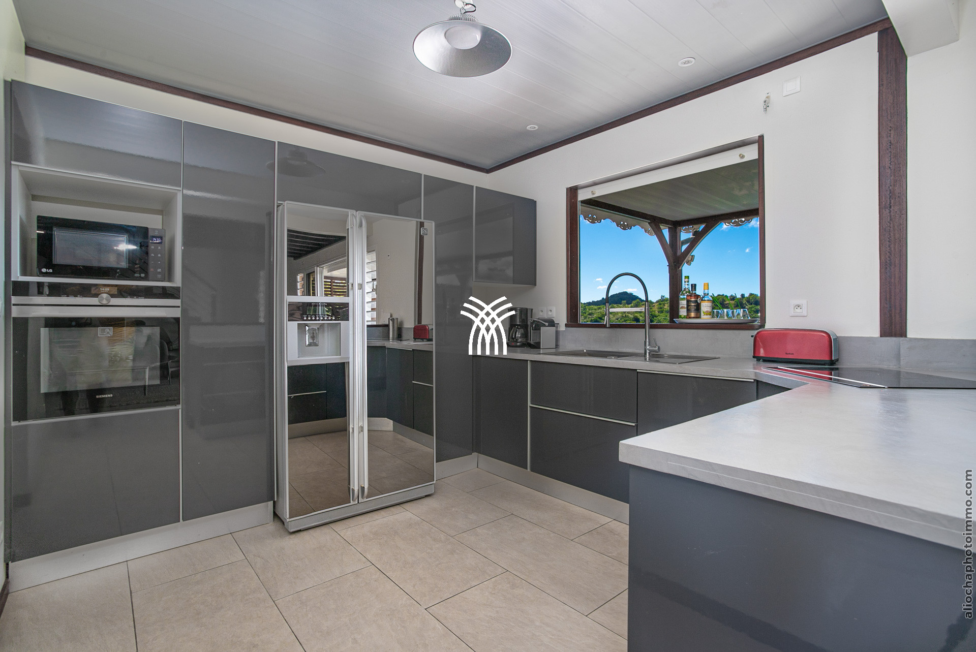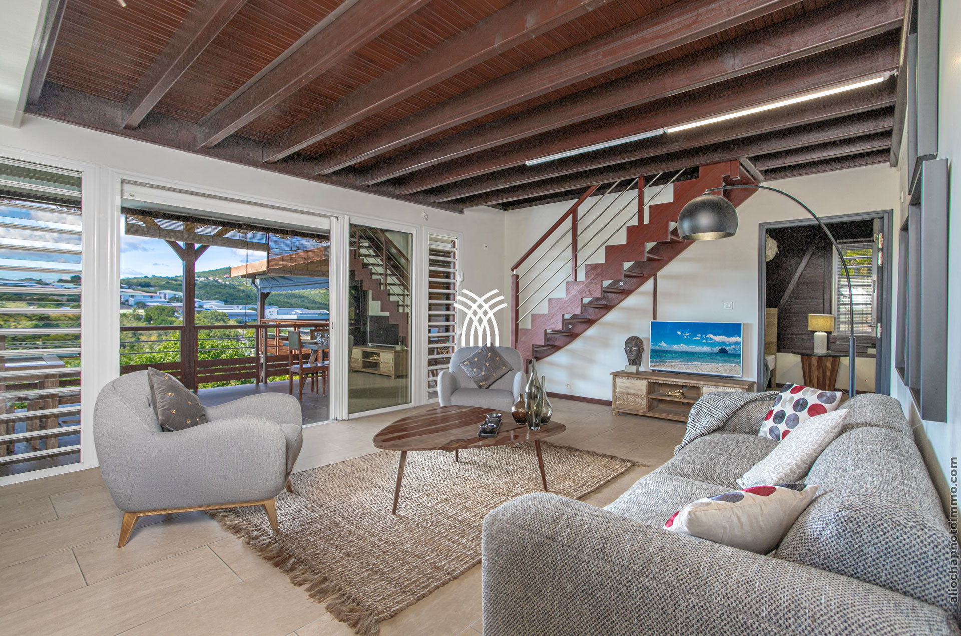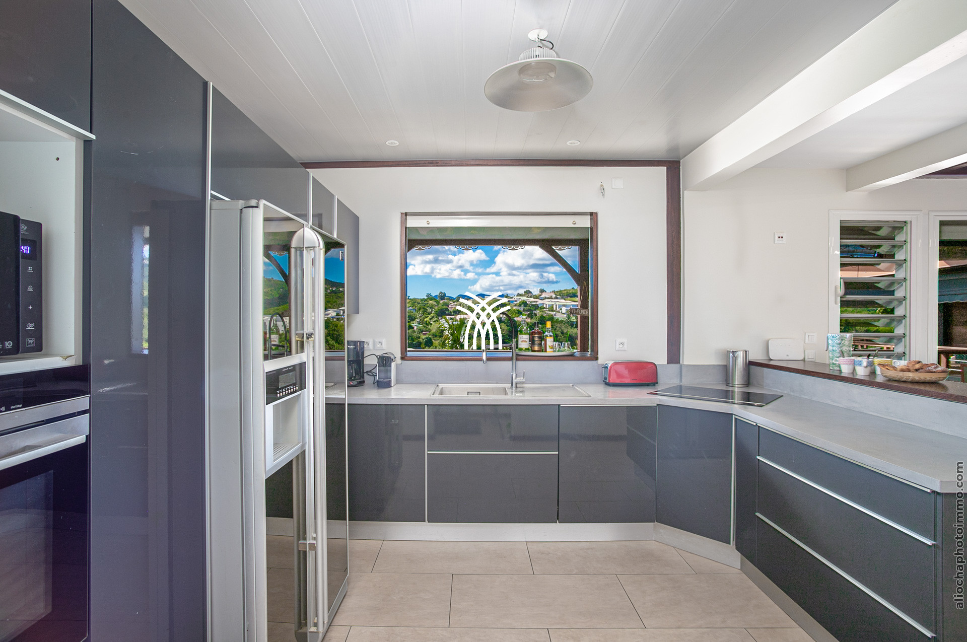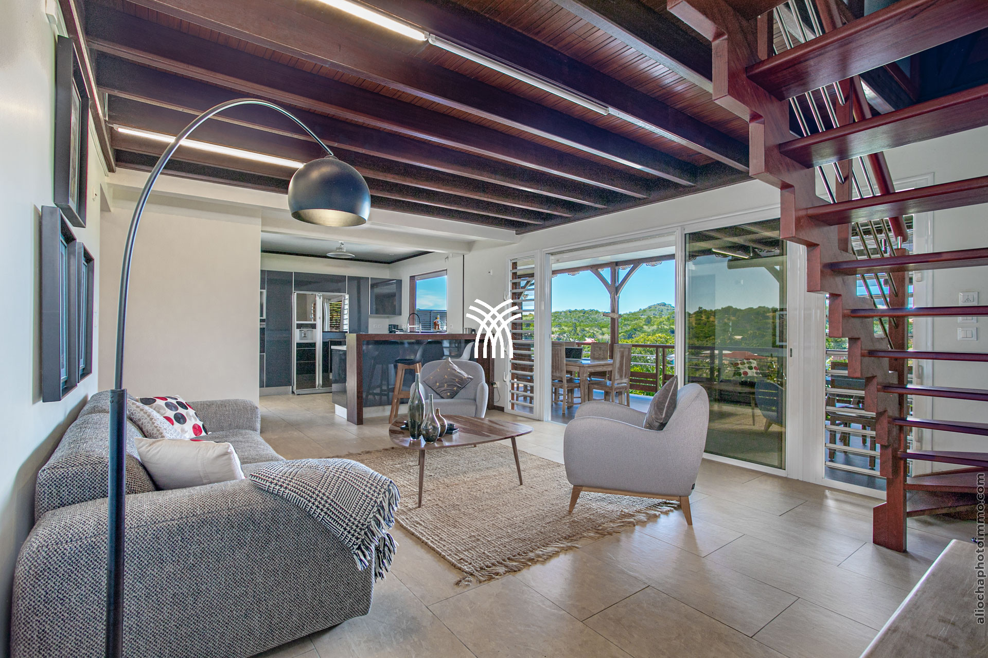 Le salon et la cuisine fusionnent pour créer un espace de vie convivial et ouvert sur l’extérieur. Cet espace vous permet de profiter d’une vue reposante sur le jardin tropical et sur le célèbre rocher du Diamant, également connu sous le nom de la "Femme Couchée". Côté salon, vous trouverez un canapé moelleux, des fauteuils confortables, un tapis en coco, une table basse en bois et une télévision, créant un lieu propice à la détente. La cuisine moderne est entièrement équipée pour répondre à tous vos besoins culinaires, avec un bar et des tabourets pour des moments conviviaux.