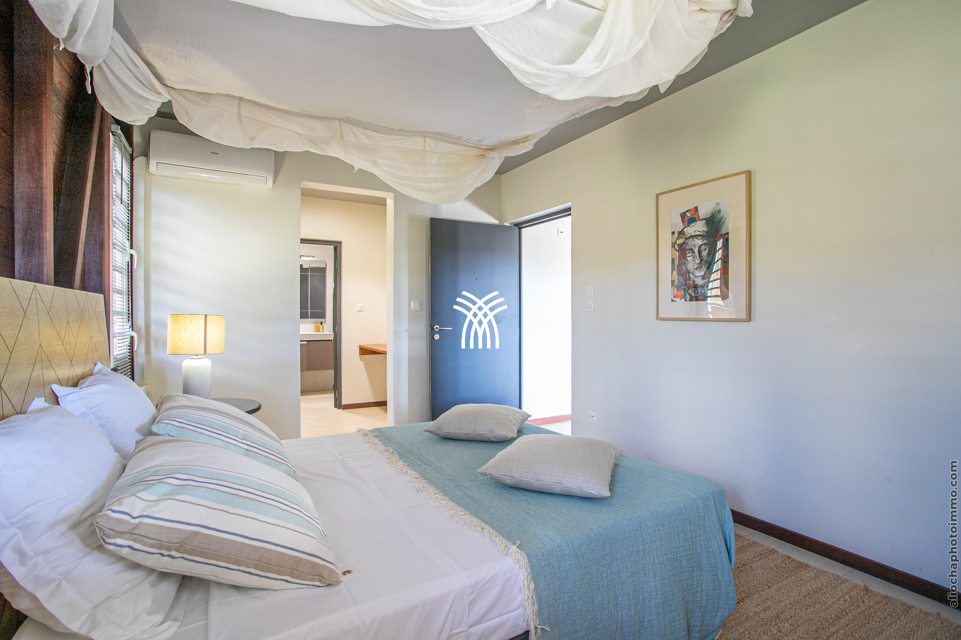 Trois chambres se trouvent au niveau de la terrasse, dont deux chambres doubles et une twin. La suite parentale, située au premier étage, est spacieuse et décorée avec raffinement. Les deux autres chambres sont installées dans des T2 indépendants, chacun avec son propre coin salon, une salle de douche et une terrasse donnant sur la piscine.