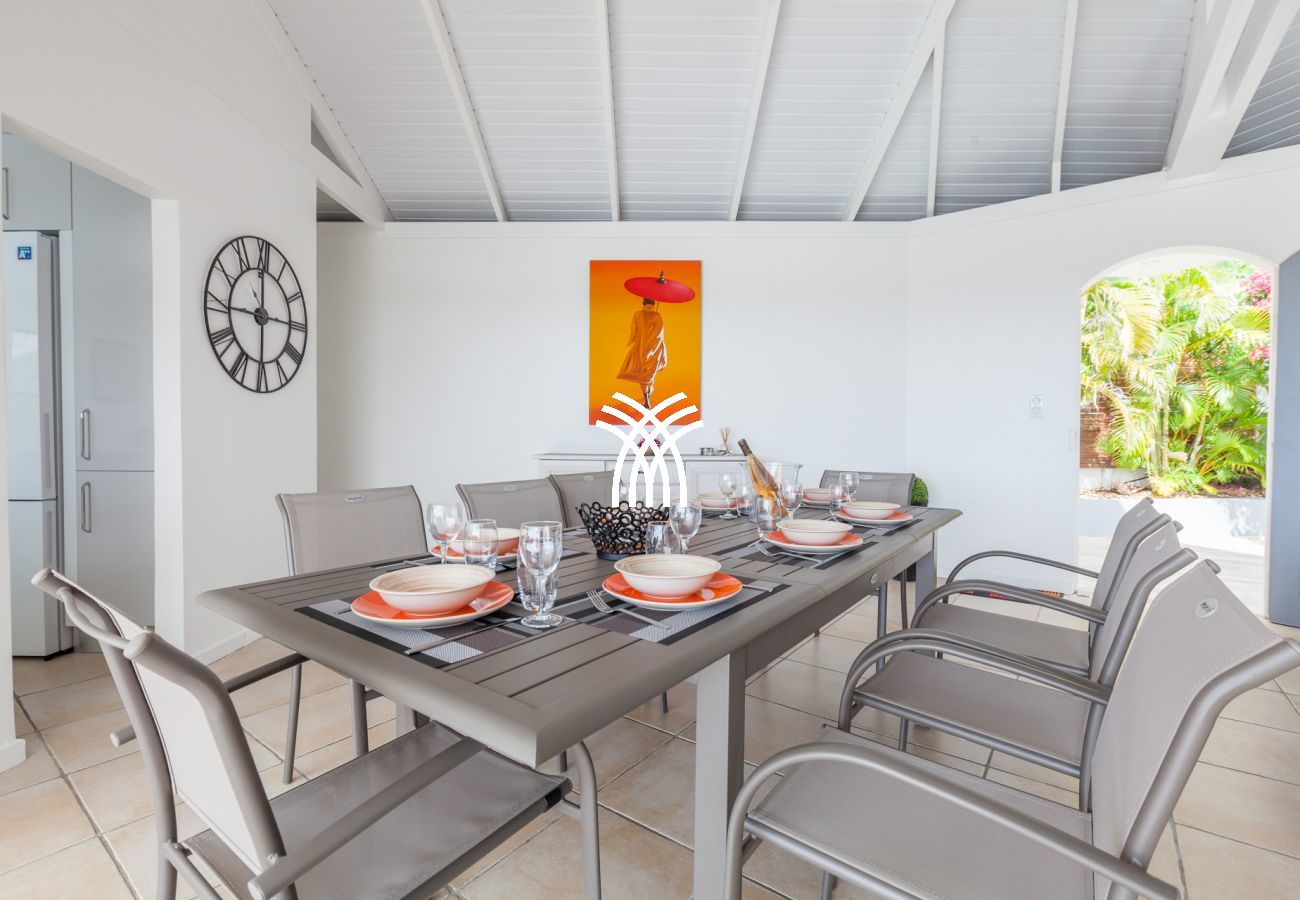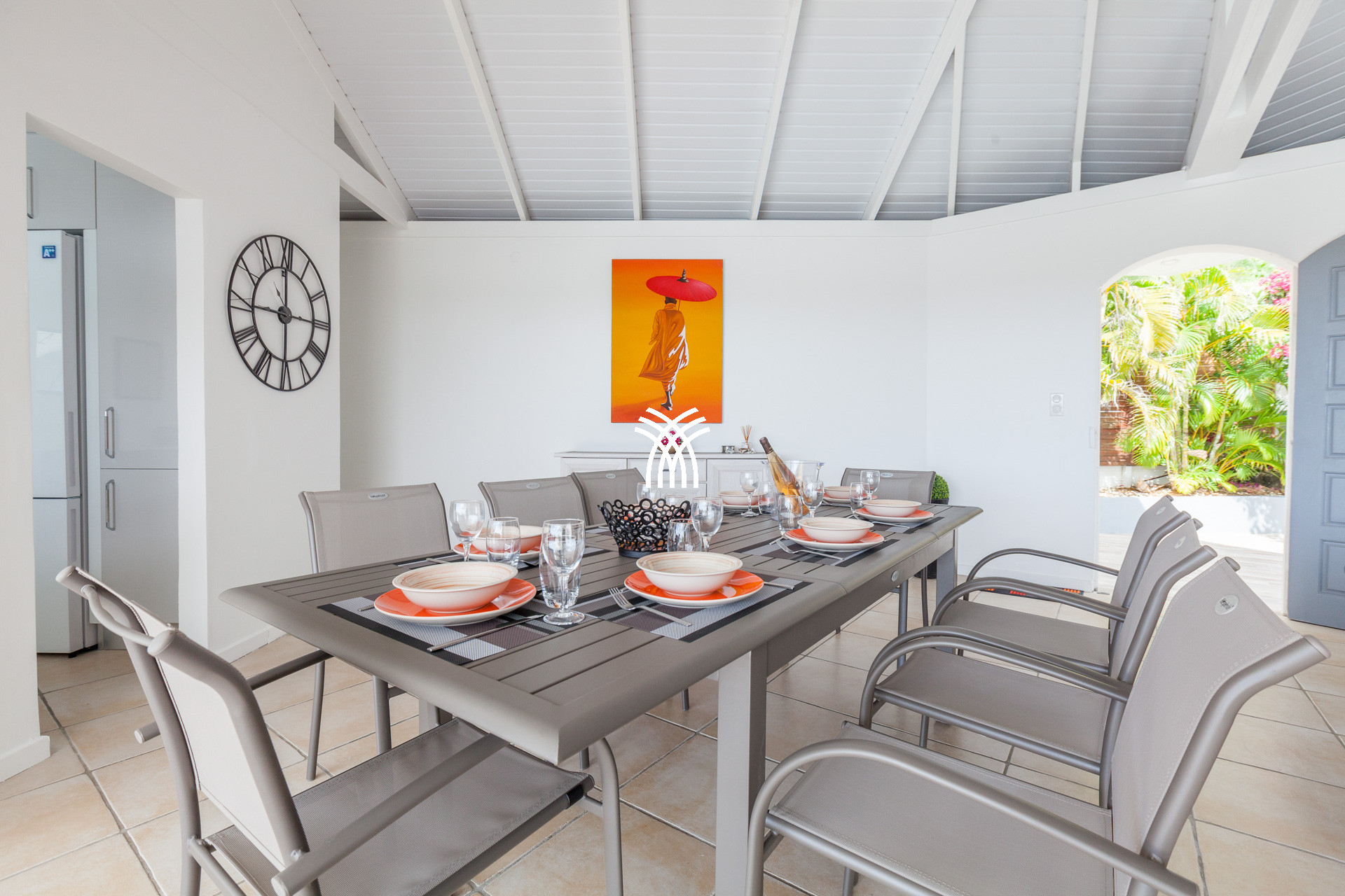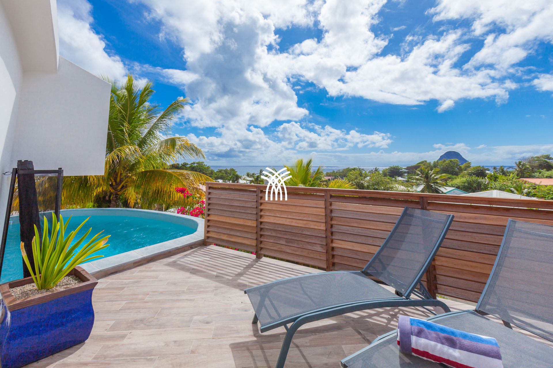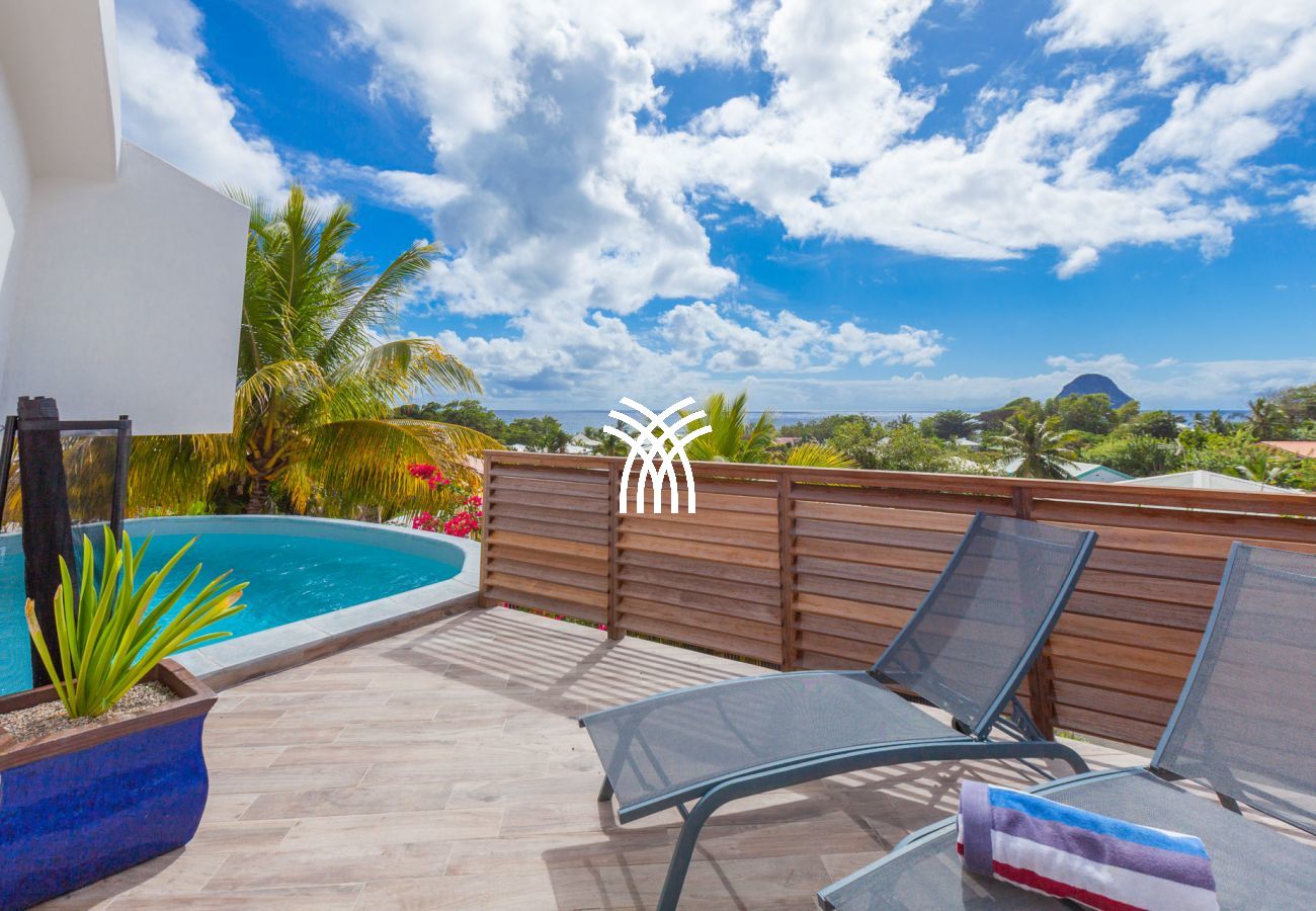 À l’intérieur, les espaces de vie lumineux et aérés sont décorés avec un goût exquis. Le salon, la salle à manger et la cuisine moderne s’ouvrent sur une terrasse couverte, véritable invitation à la détente. Les transats, le salon de jardin et un canapé de jour vous accueillent pour des moments de relaxation au bord de la piscine, tandis que les couchers de soleil spectaculaires sur le Rocher du Diamant et le Morne Larcher apportent une touche magique à vos soirées.