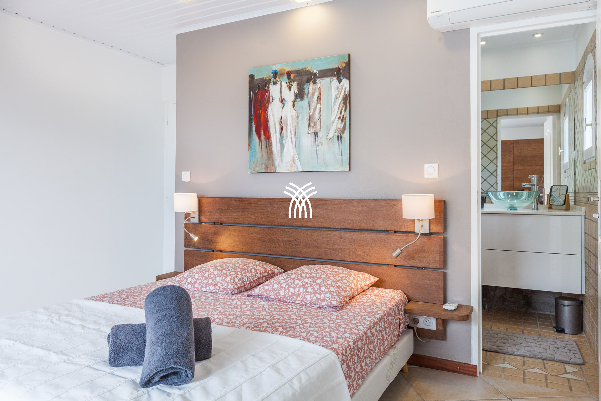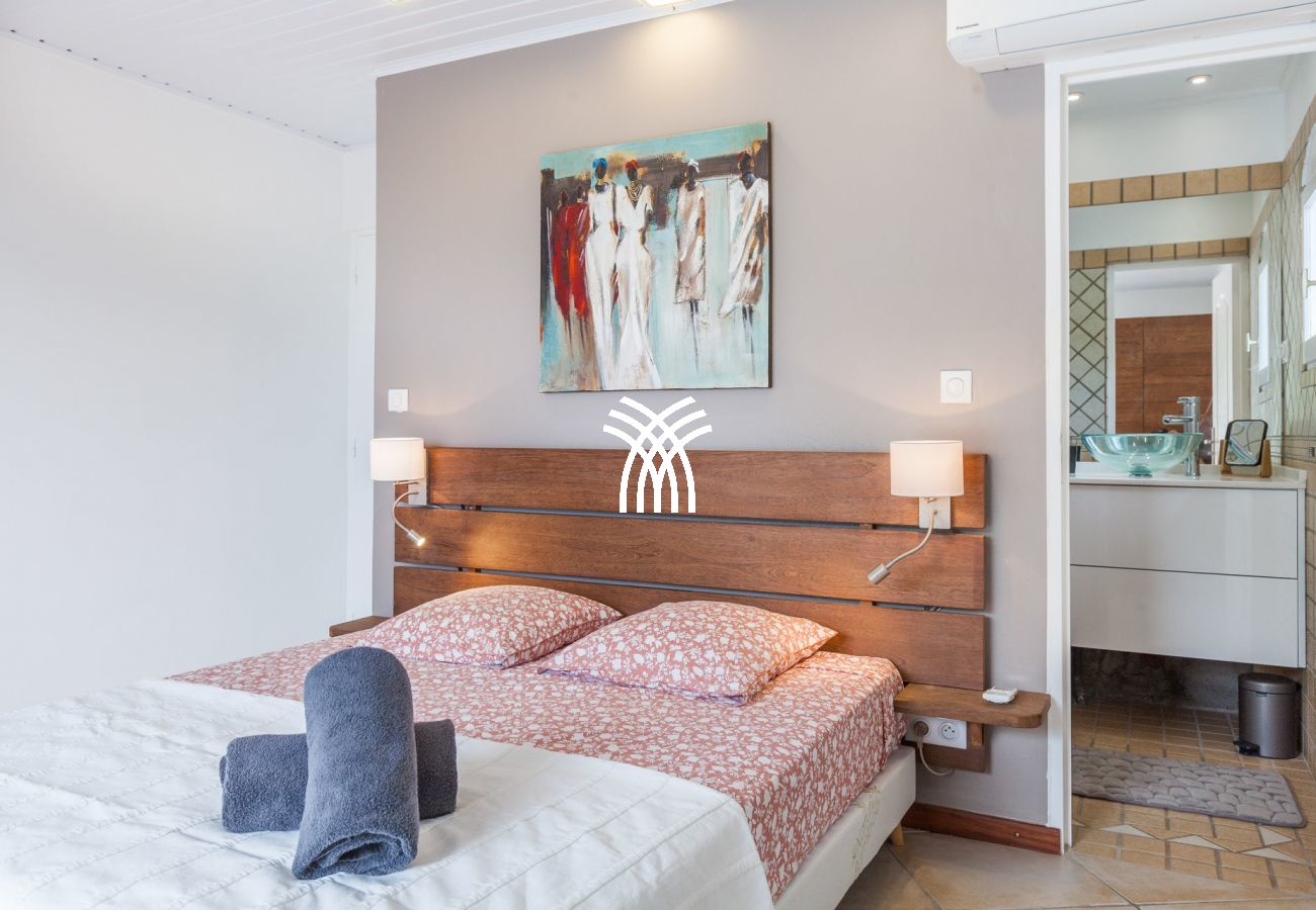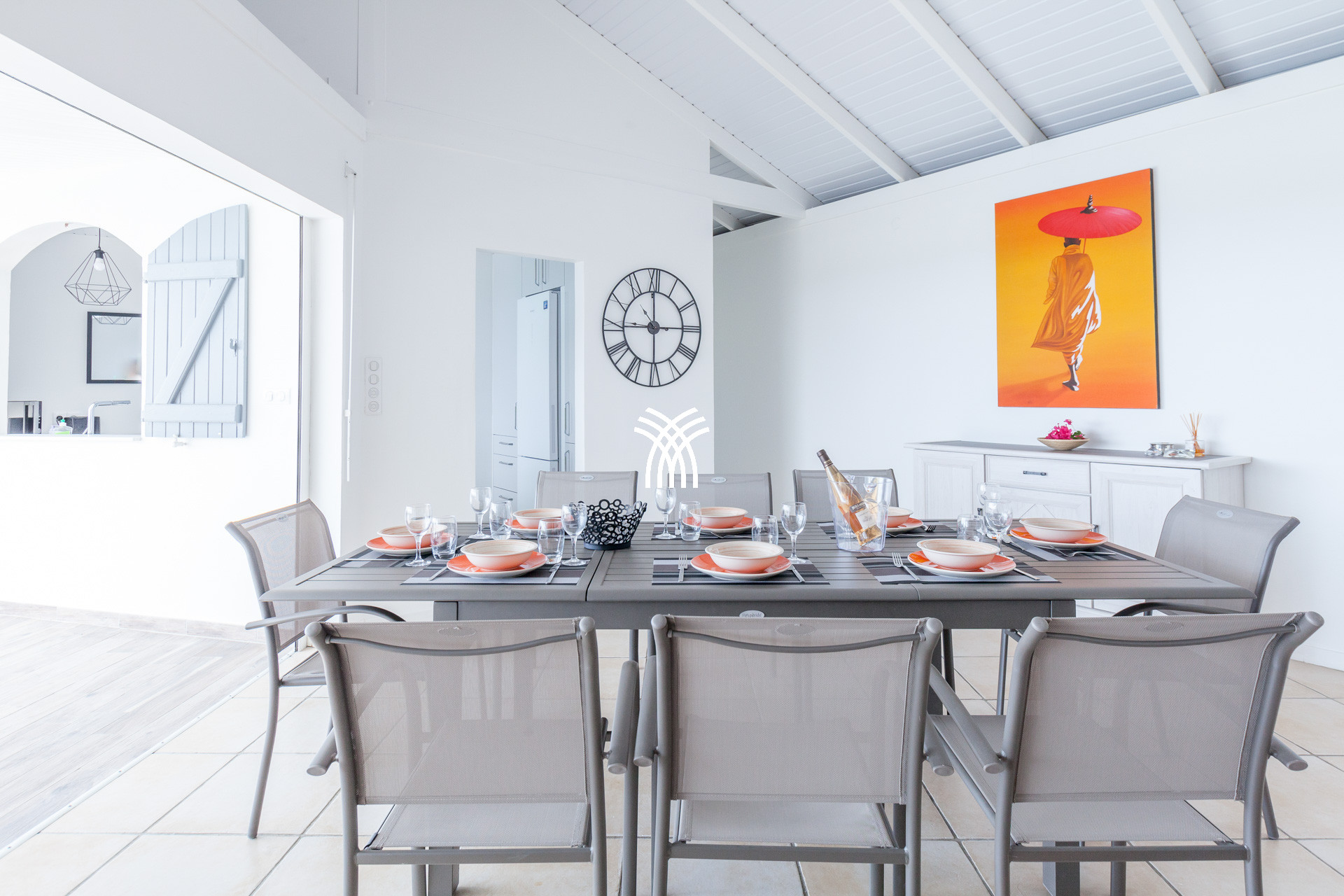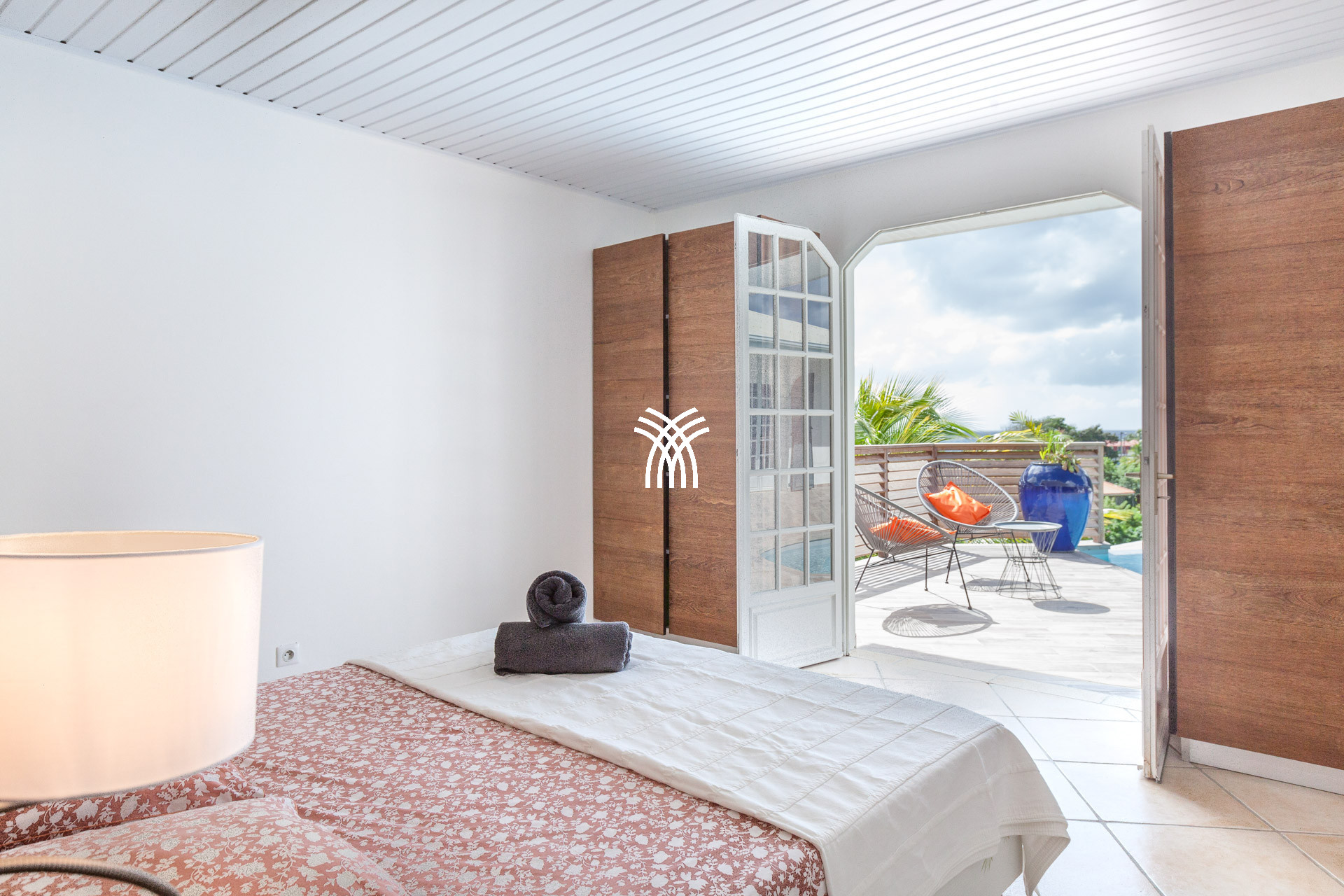 À l’intérieur, les espaces de vie lumineux et aérés sont décorés avec un goût exquis. Le salon, la salle à manger et la cuisine moderne s’ouvrent sur une terrasse couverte, véritable invitation à la détente. Les transats, le salon de jardin et un canapé de jour vous accueillent pour des moments de relaxation au bord de la piscine, tandis que les couchers de soleil spectaculaires sur le Rocher du Diamant et le Morne Larcher apportent une touche magique à vos soirées.