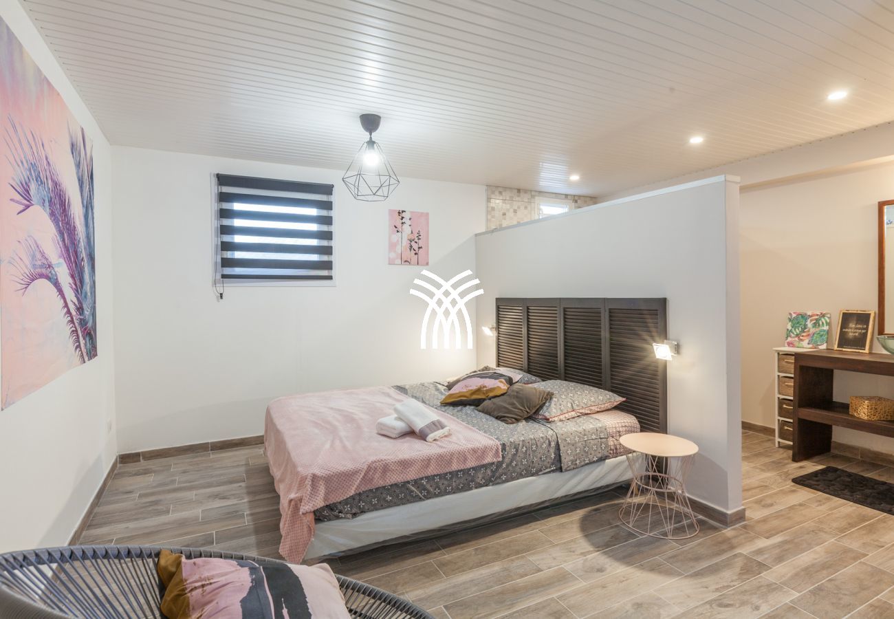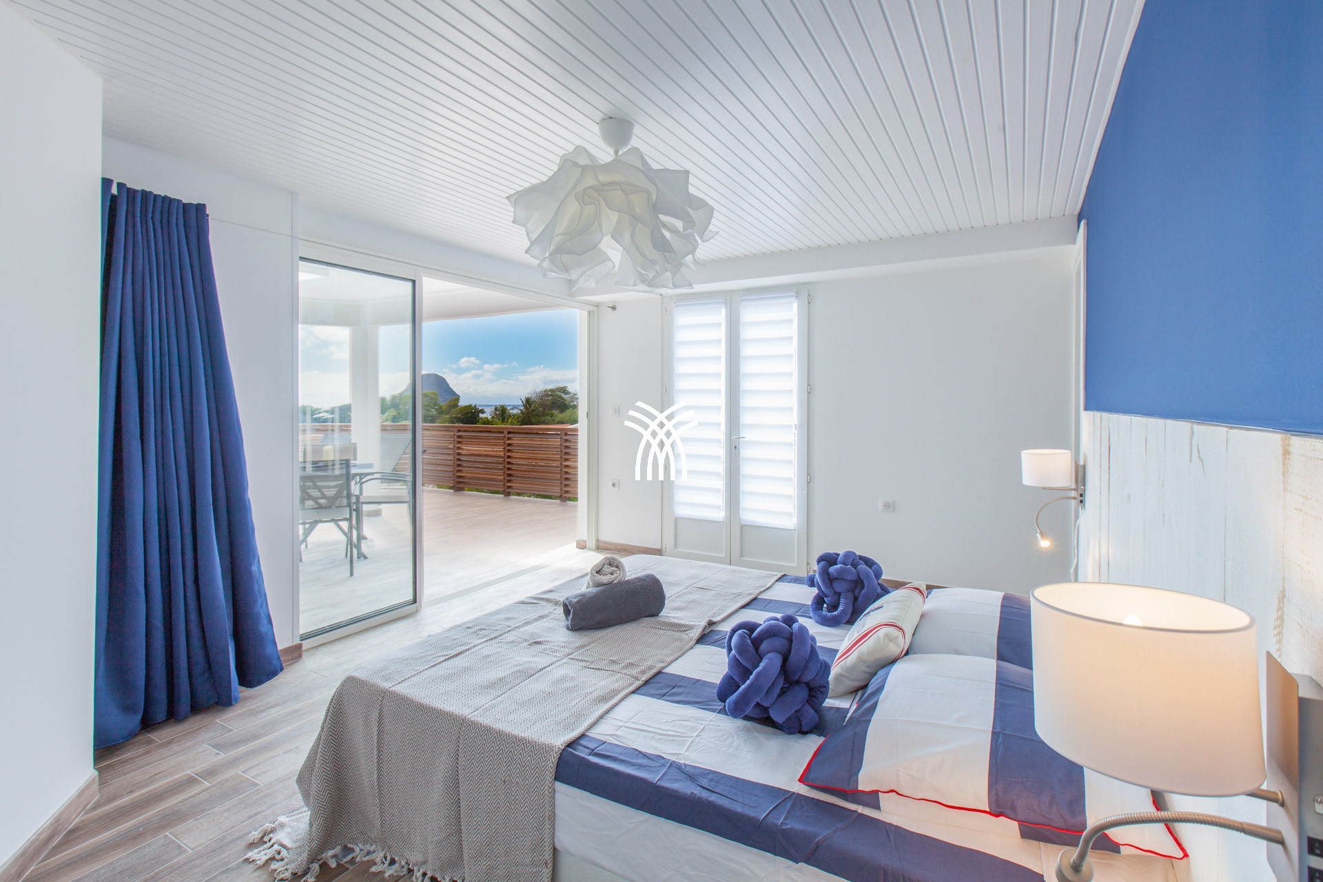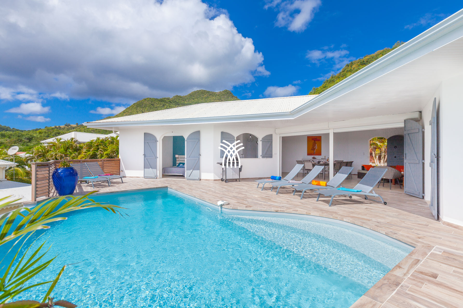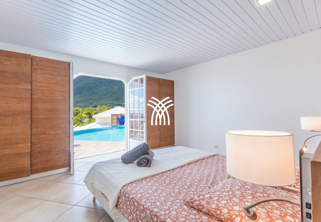 À l’intérieur, les espaces de vie lumineux et aérés sont décorés avec un goût exquis. Le salon, la salle à manger et la cuisine moderne s’ouvrent sur une terrasse couverte, véritable invitation à la détente. Les transats, le salon de jardin et un canapé de jour vous accueillent pour des moments de relaxation au bord de la piscine, tandis que les couchers de soleil spectaculaires sur le Rocher du Diamant et le Morne Larcher apportent une touche magique à vos soirées.
