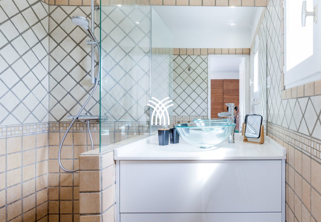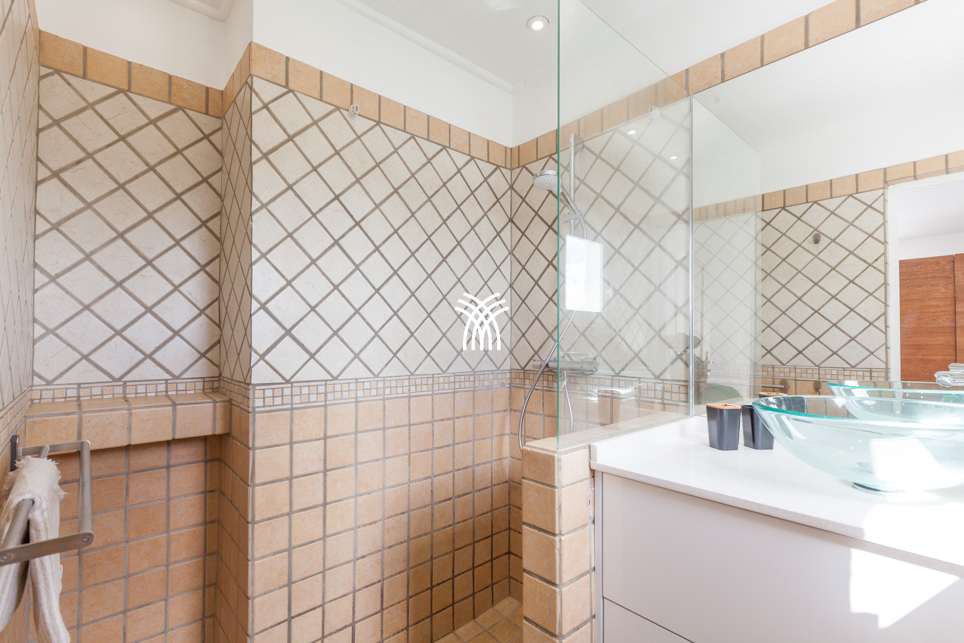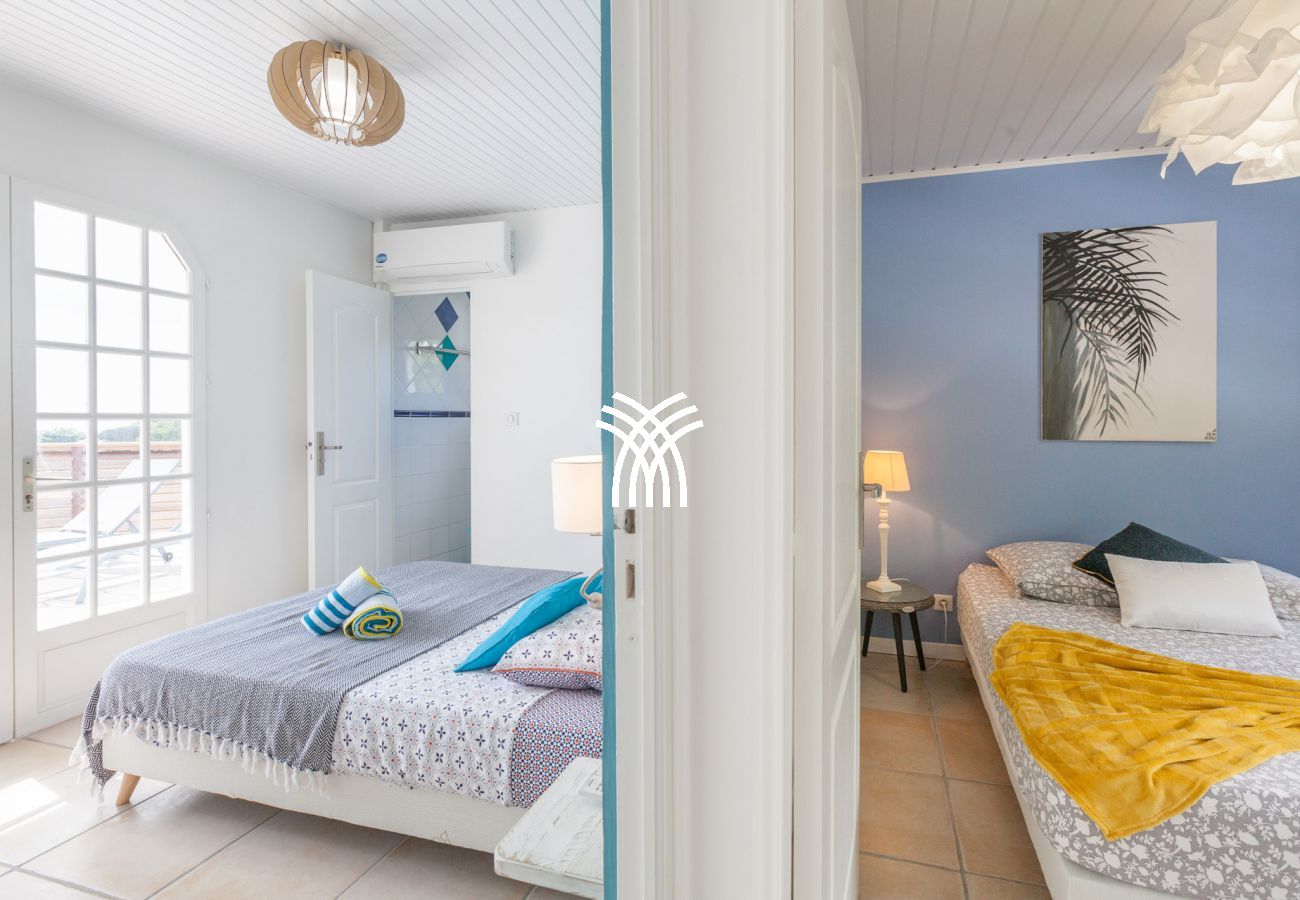 La villa dispose de cinq chambres climatisées, conçues pour allier confort et intimité. La suite parentale, spacieuse et élégante, s’ouvre sur une terrasse avec vue sur la mer et dispose d’une salle de bain en travertin. Deux chambres au rez-de-chaussée partagent une salle d’eau et offrent un cadre chaleureux pour vos invités. Les deux chambres situées au niveau inférieur, accessibles par un escalier, bénéficient d’un espace supplémentaire avec une salle de jeu équipée d’un babyfoot, idéal pour les enfants ou les adolescents. Une mini-suite avec terrasse privée et une grande chambre avec mobilier en bois des Andes complètent cet espace, alliant raffinement et fonctionnalité.