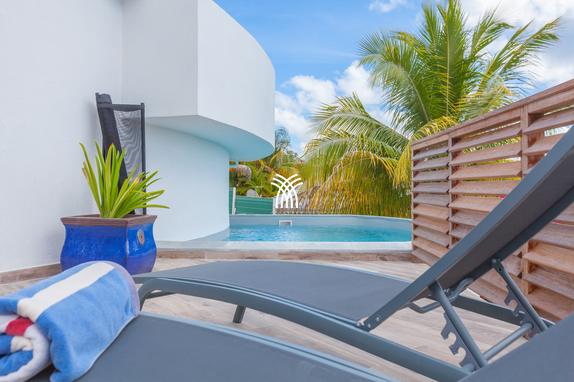 À l’extérieur, tout est conçu pour le bonheur des sens : une grande terrasse avec espace repas, un salon sous pergola pour les apéritifs face à l’horizon, un carbet avec barbecue au cœur du jardin tropical, des hamacs pour les siestes ombragées, et même un boulodrome pour des parties de pétanque en toute convivialité. Depuis le fond du parc, un sentier privé vous conduit directement aux eaux turquoise, entre la plage de Dizac et la discrète Anse Cafard.
