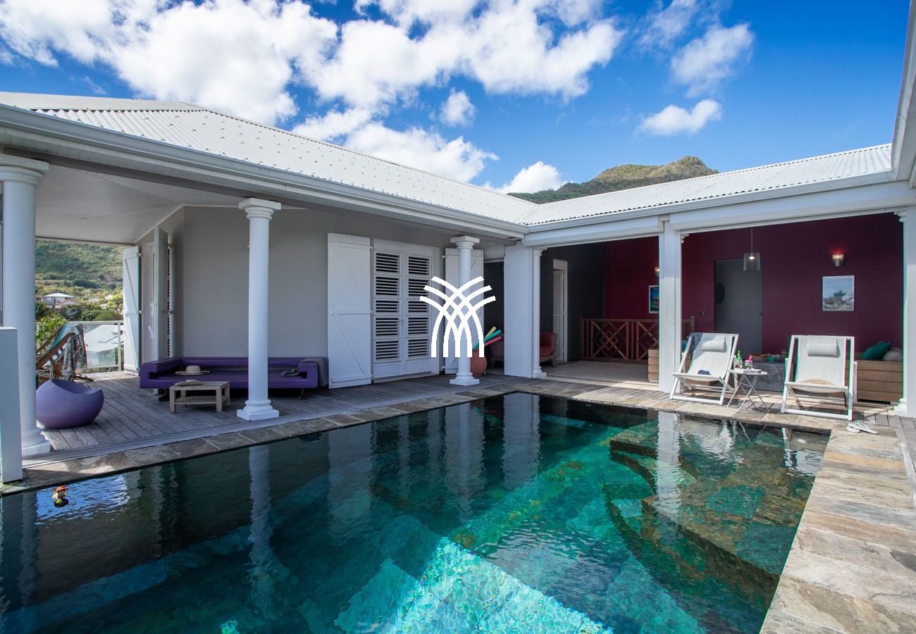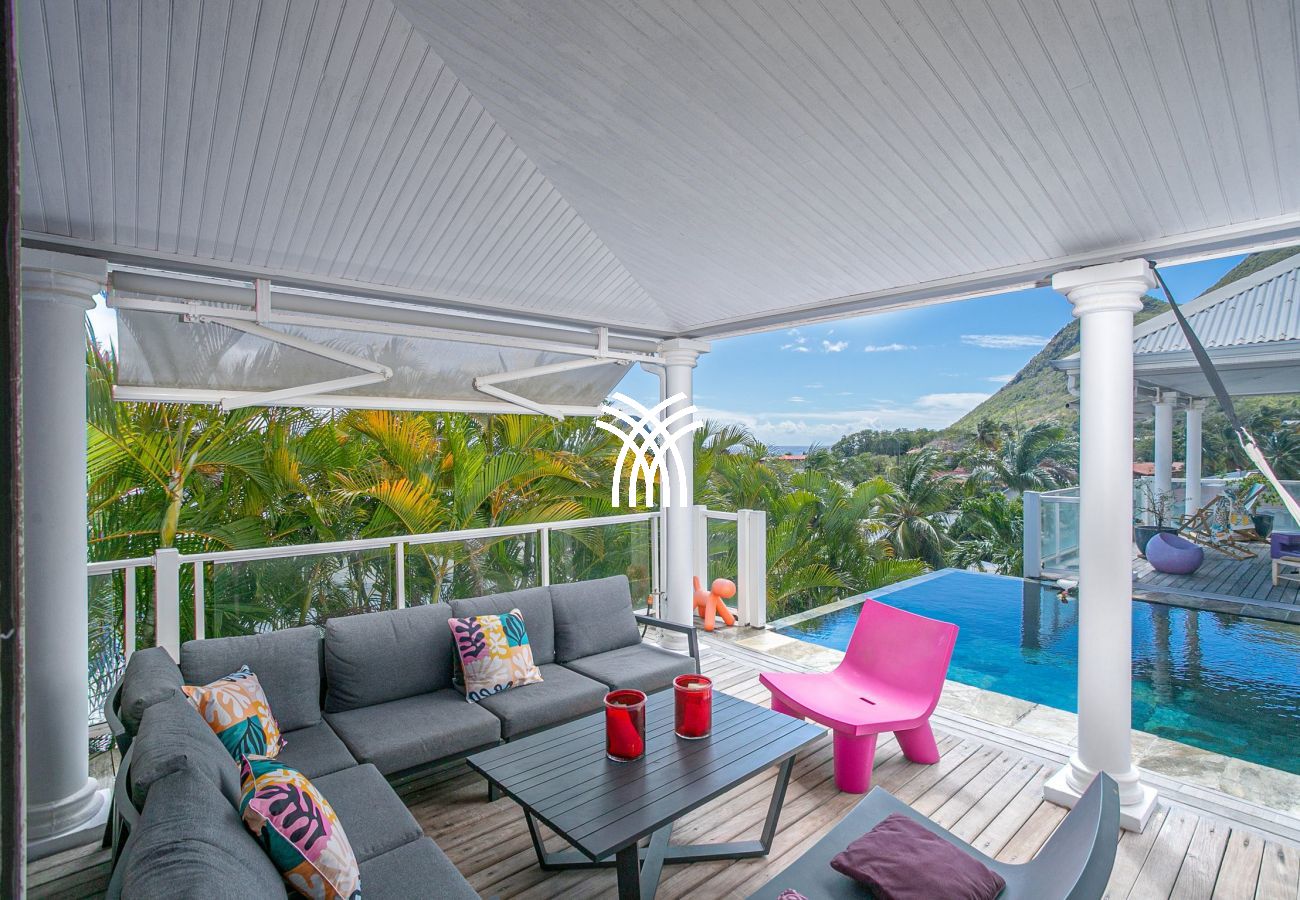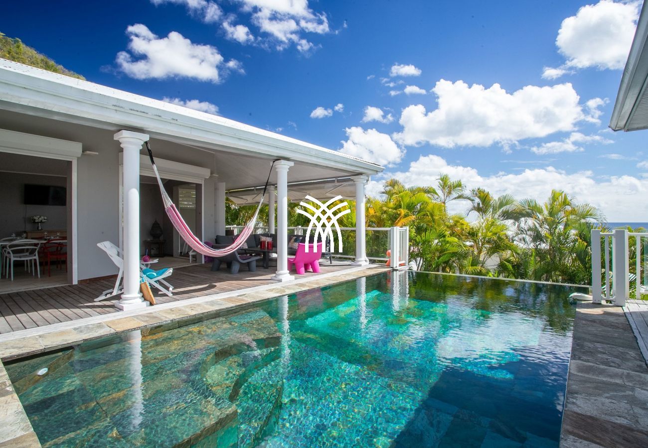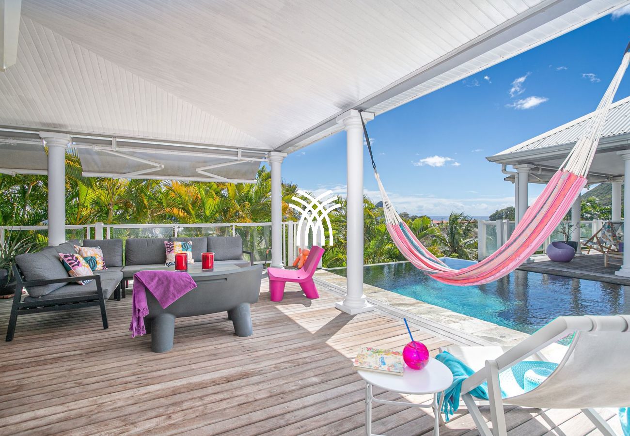 La terrasse, véritable pièce à vivre, s'anime au rythme caribéen. Profitez d'une vue imprenable sur la mer et son kaléidoscope de couleurs tout au long de la journée. La villa dispose également d'une piscine et d'un deck aménagé avec des transats, parfaits pour se prélasser dans ce cadre de rêve.